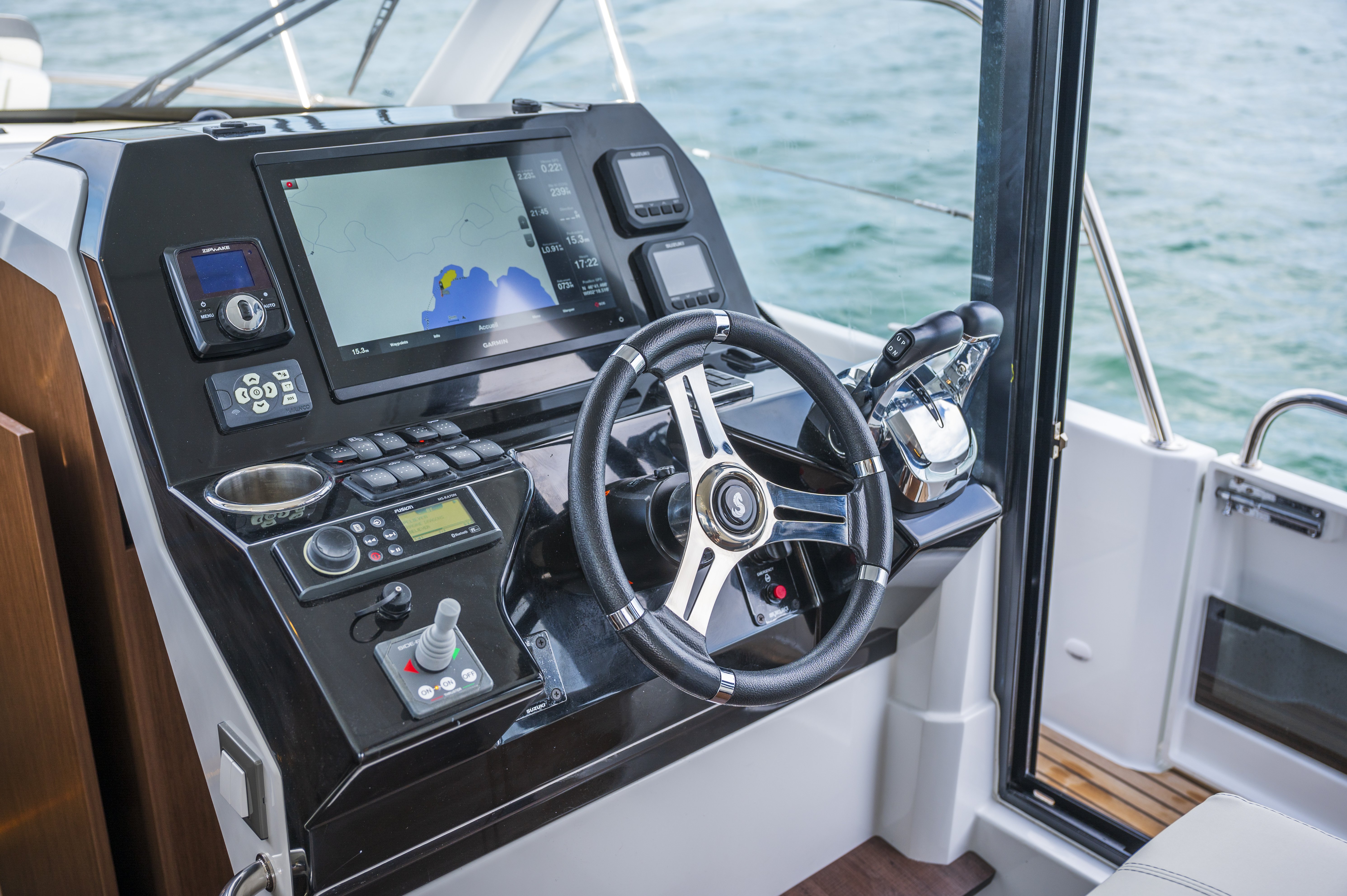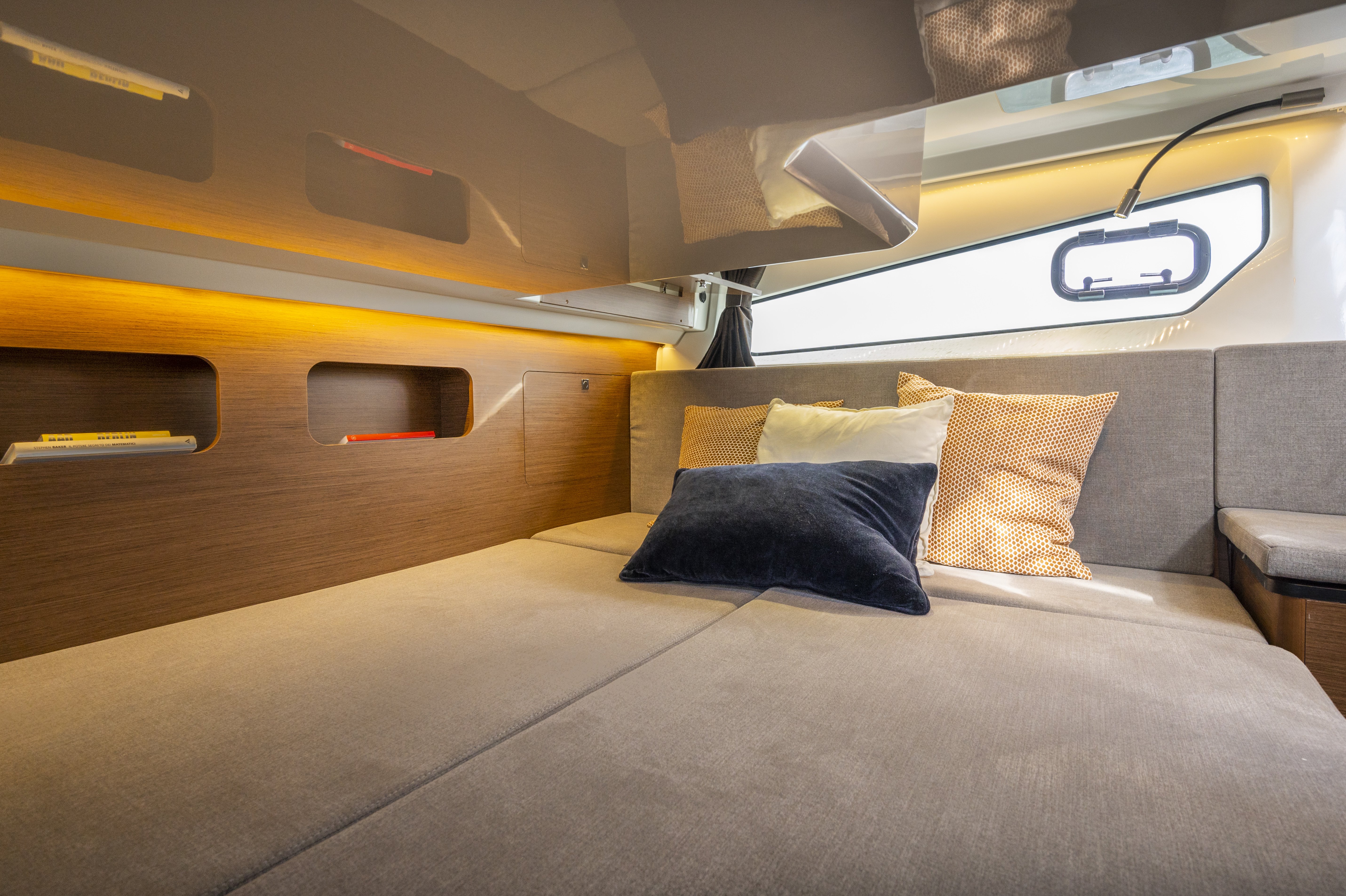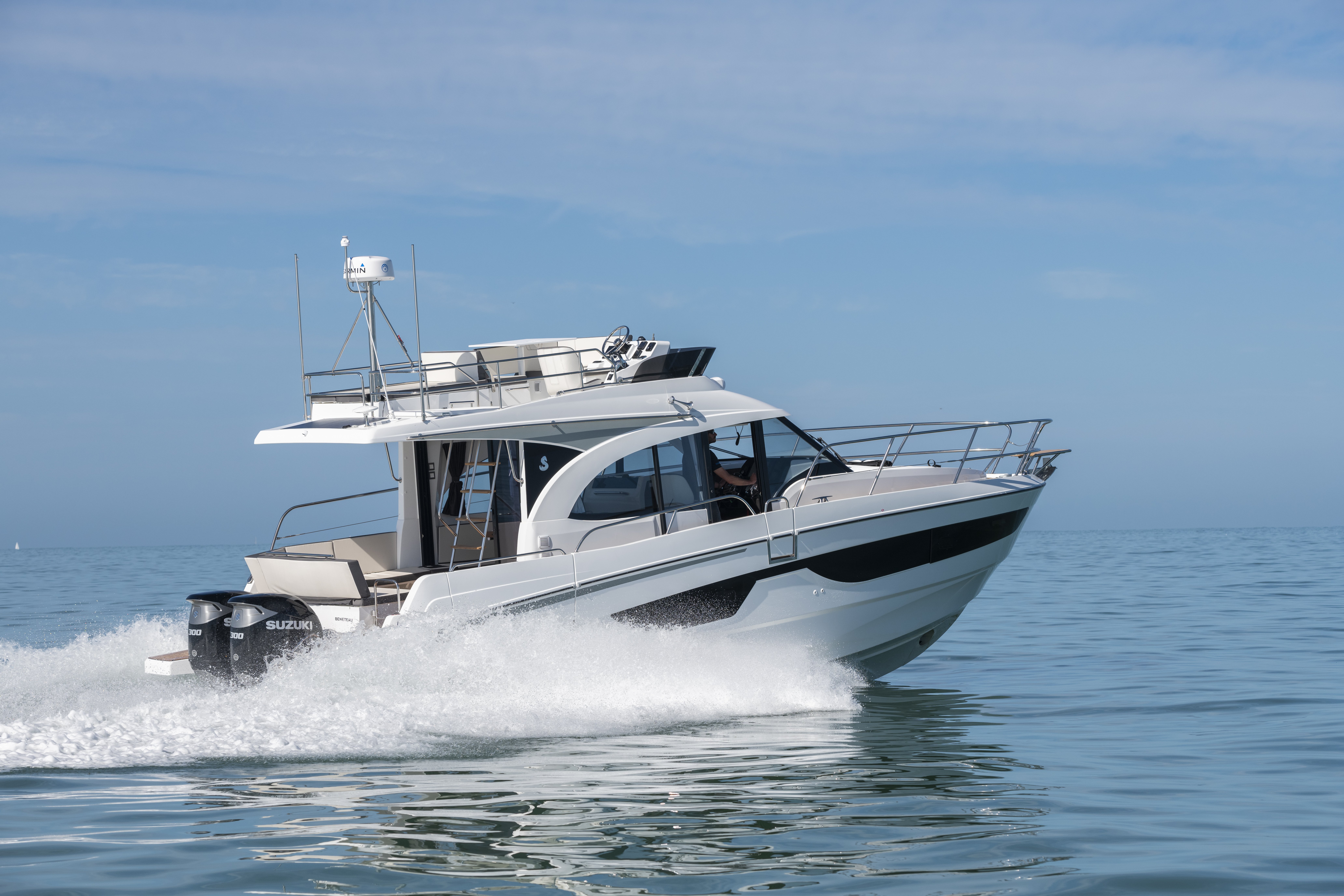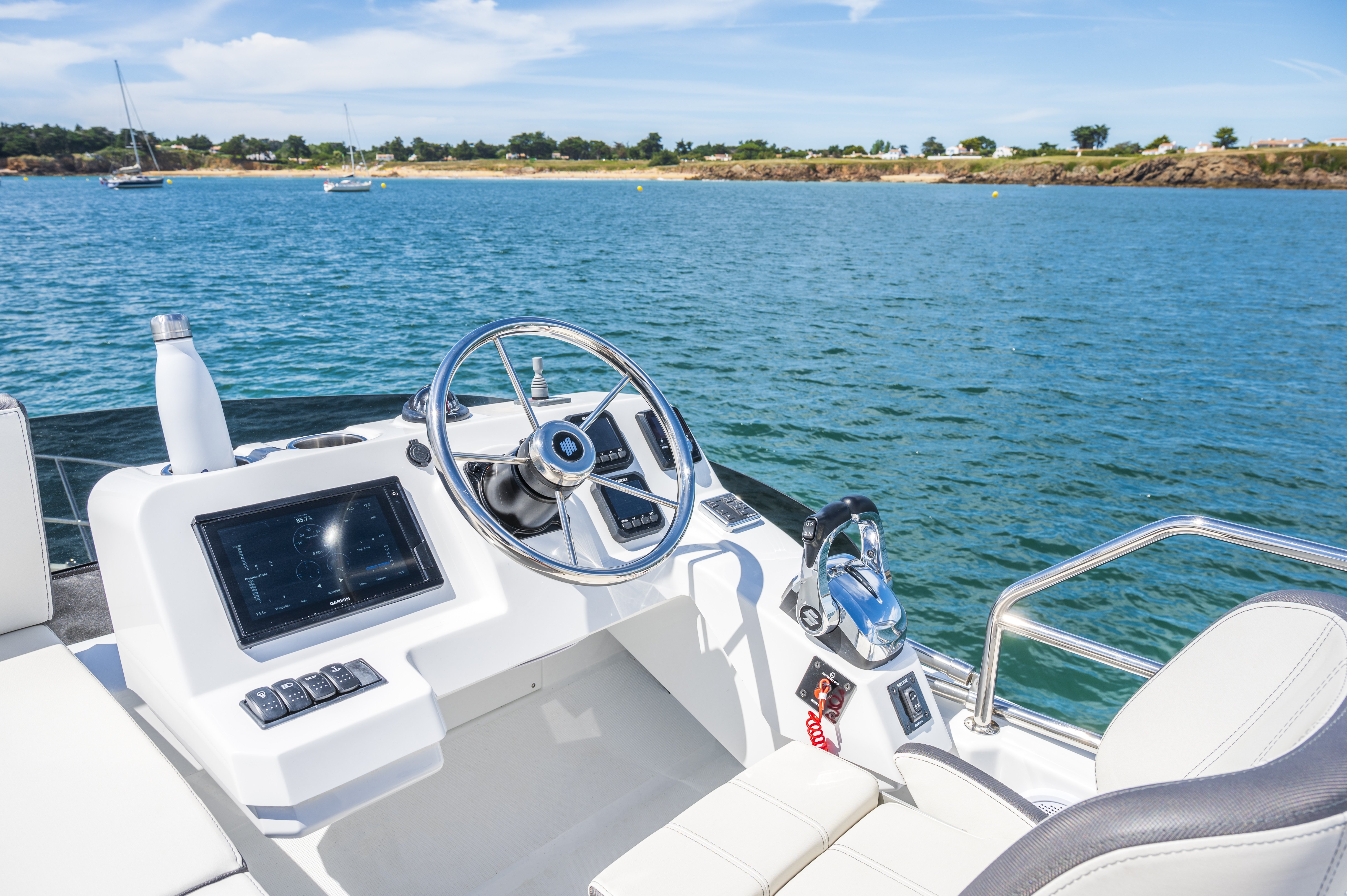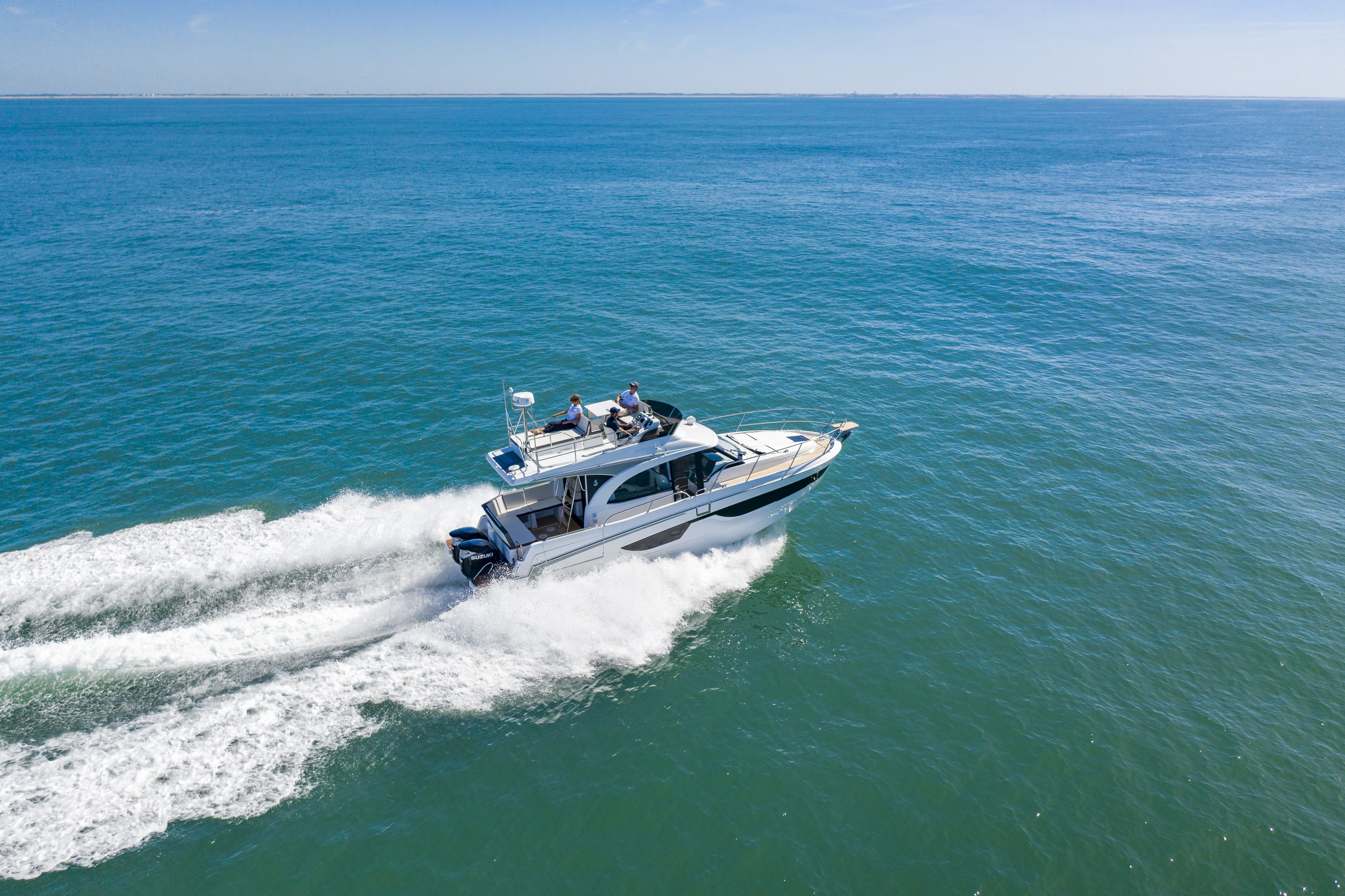 • Twin outboard propulsion up to 2×300 hp for spirited cruising and responsive control.
