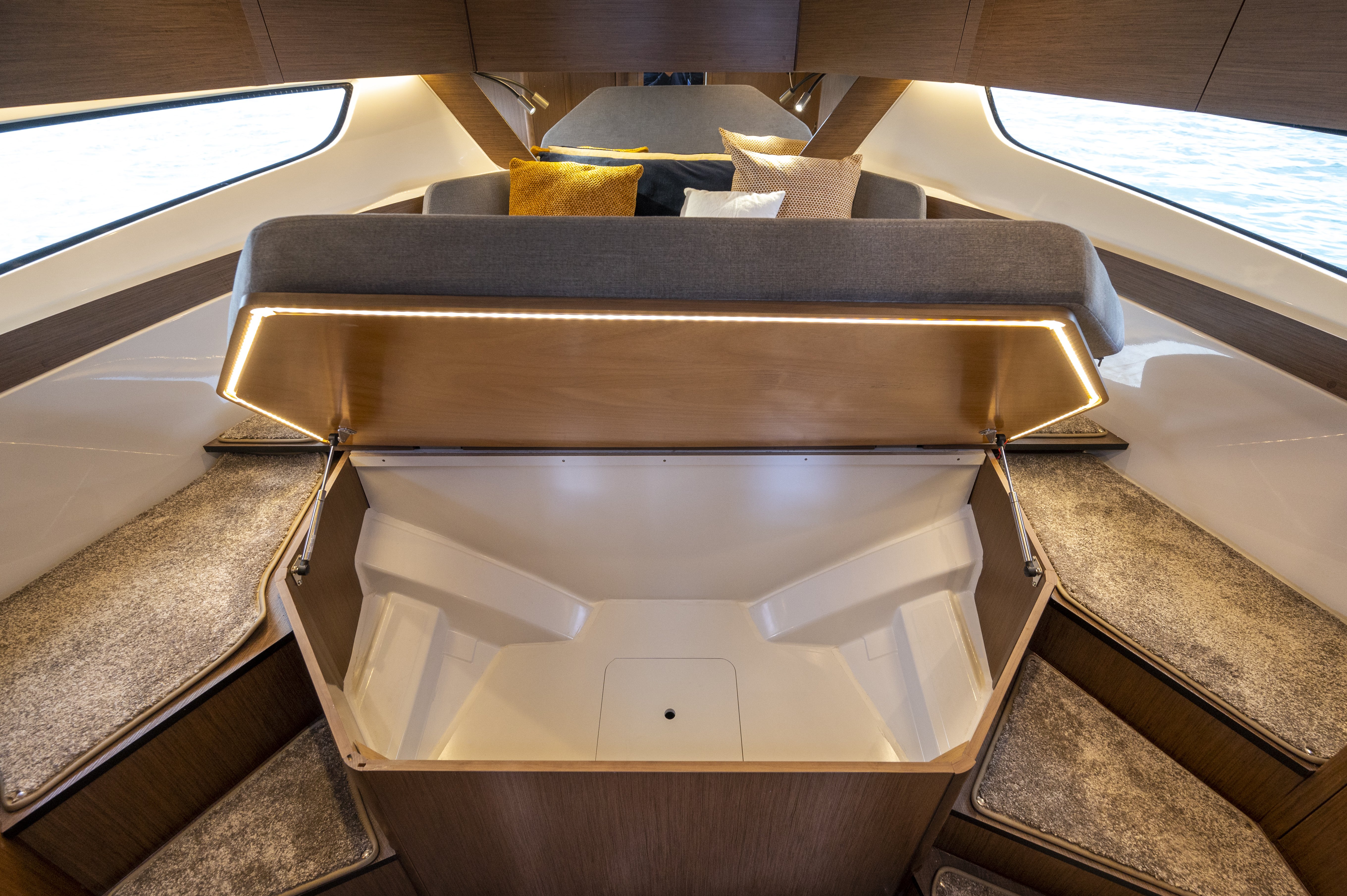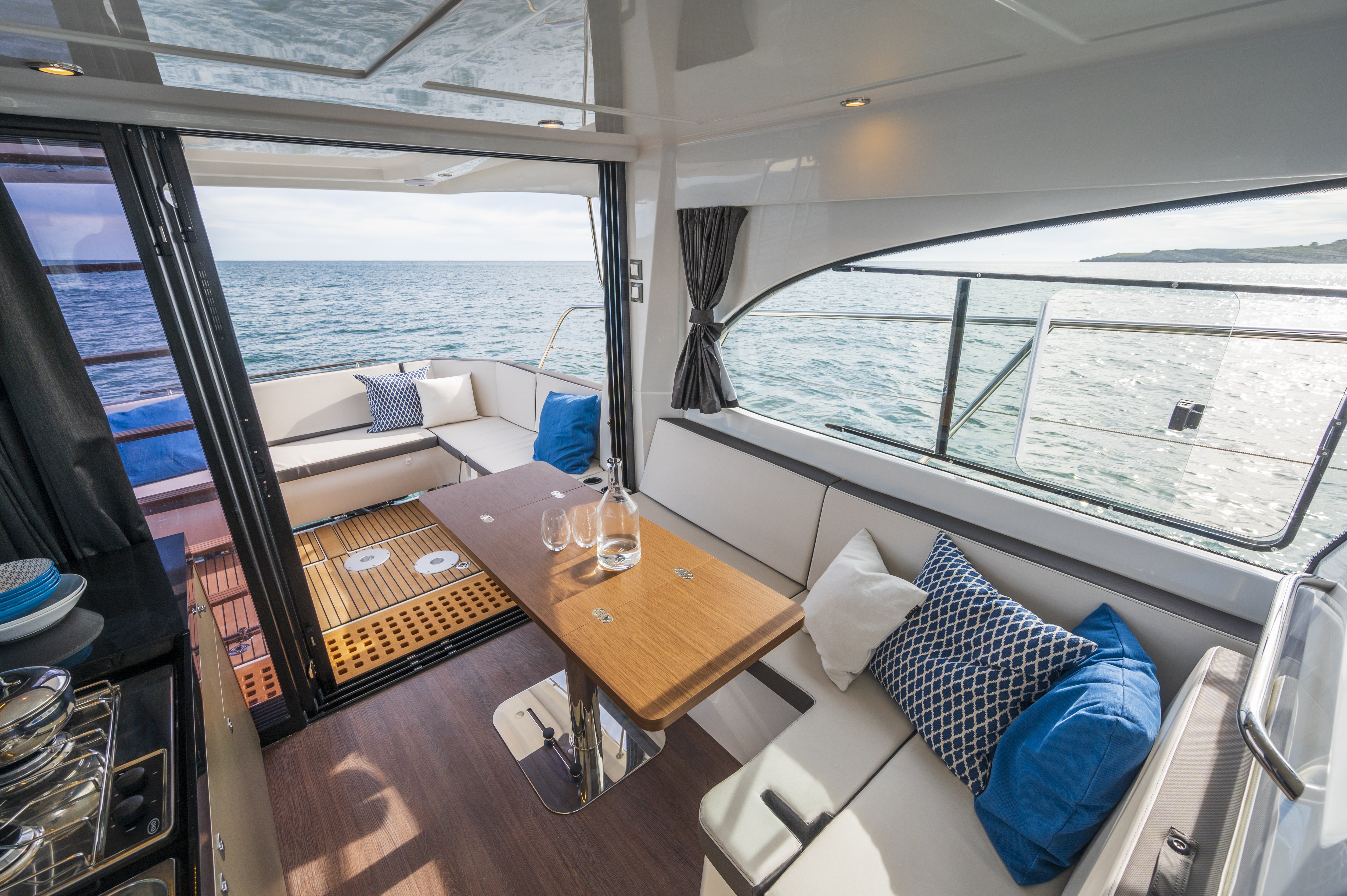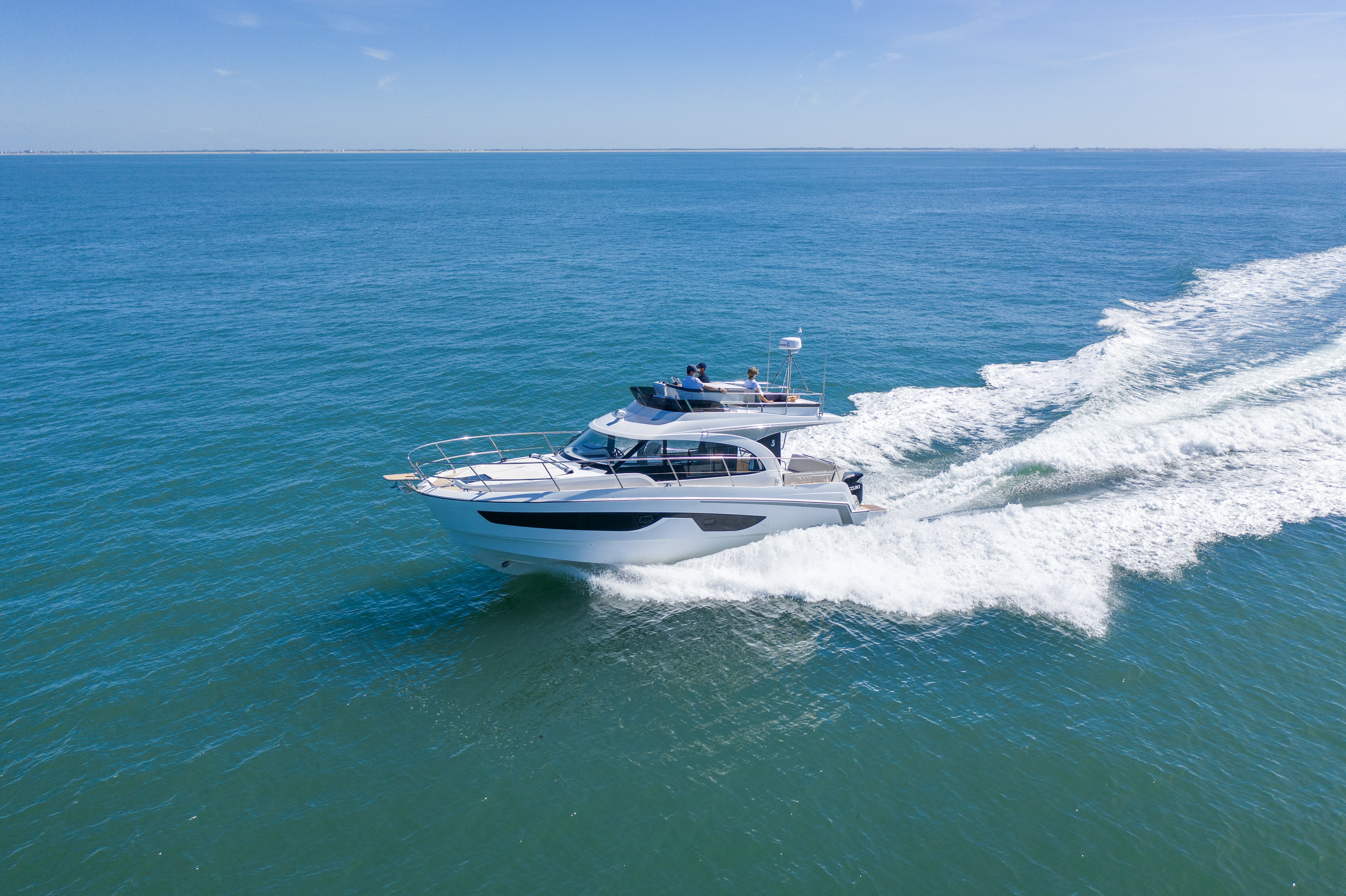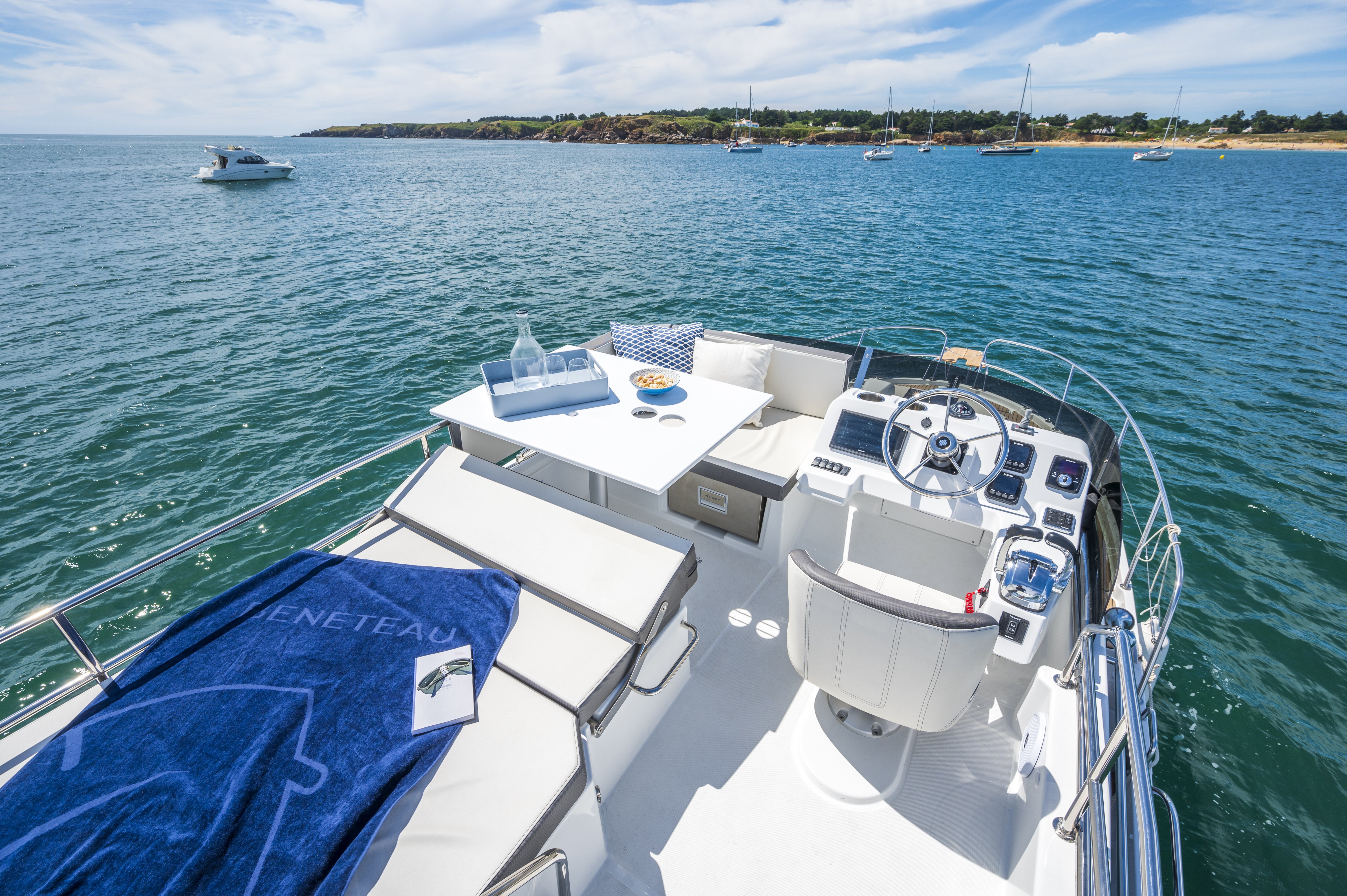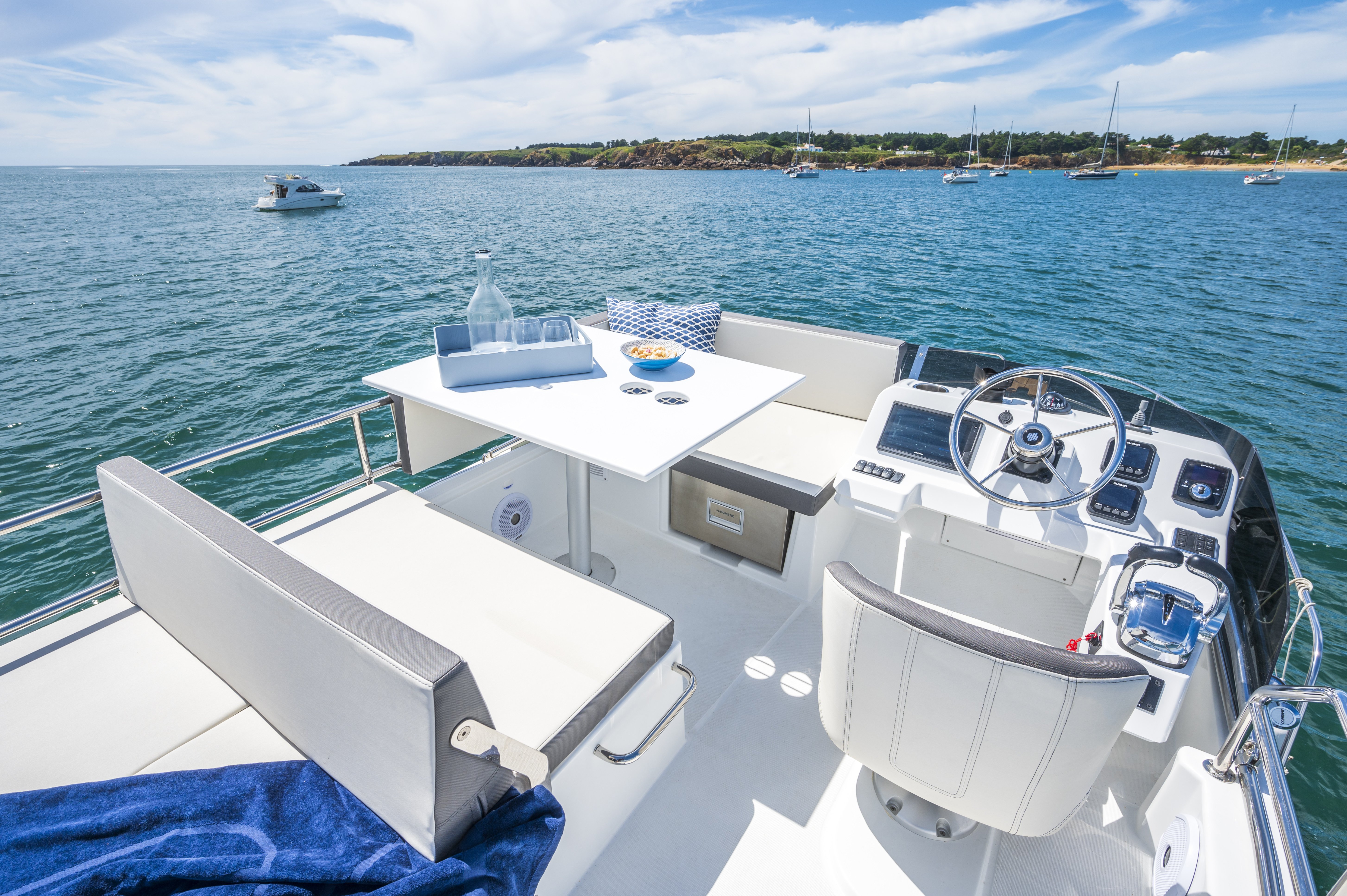 • Twin outboard propulsion up to 2×300 hp for spirited cruising and responsive control.