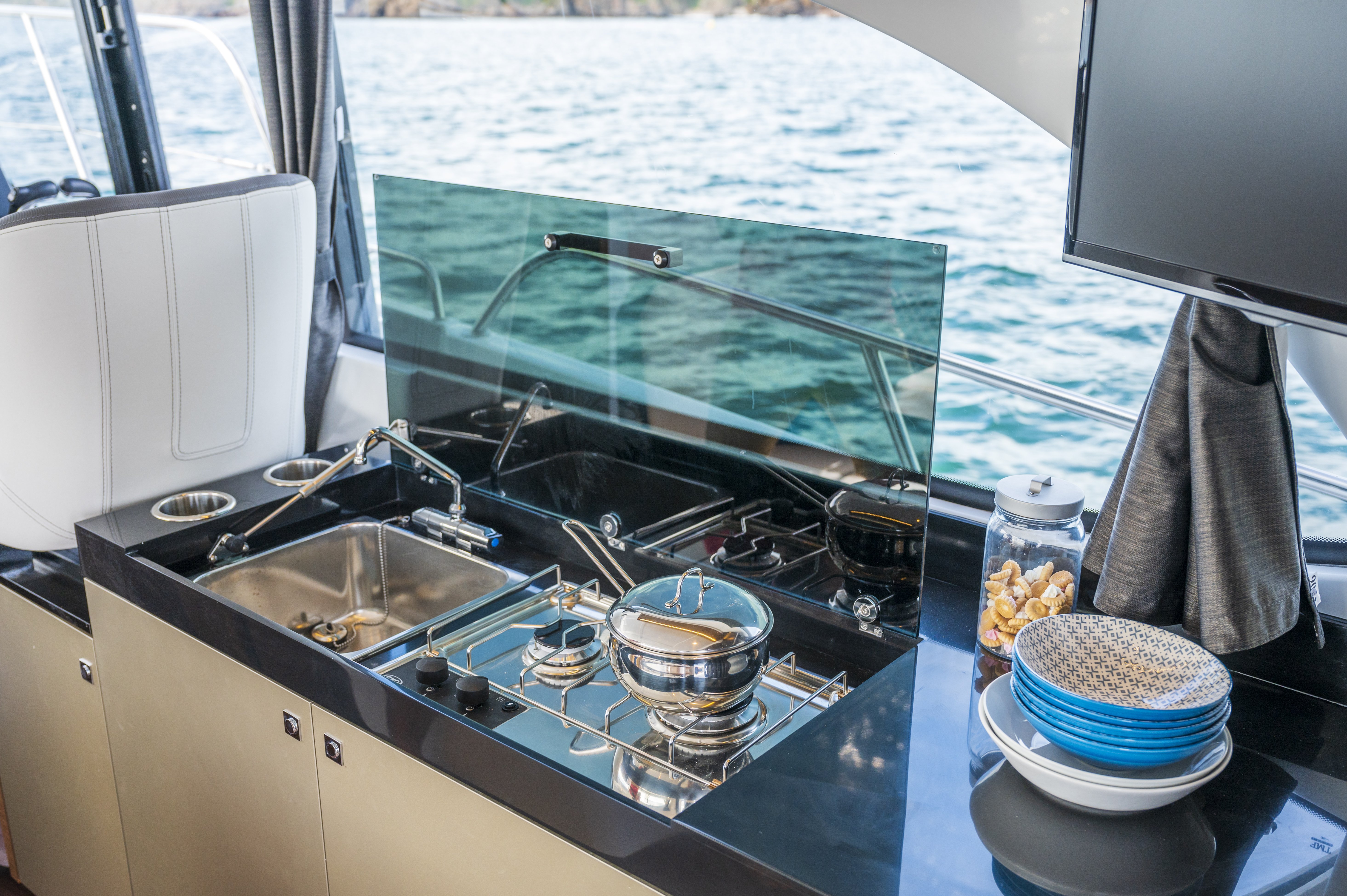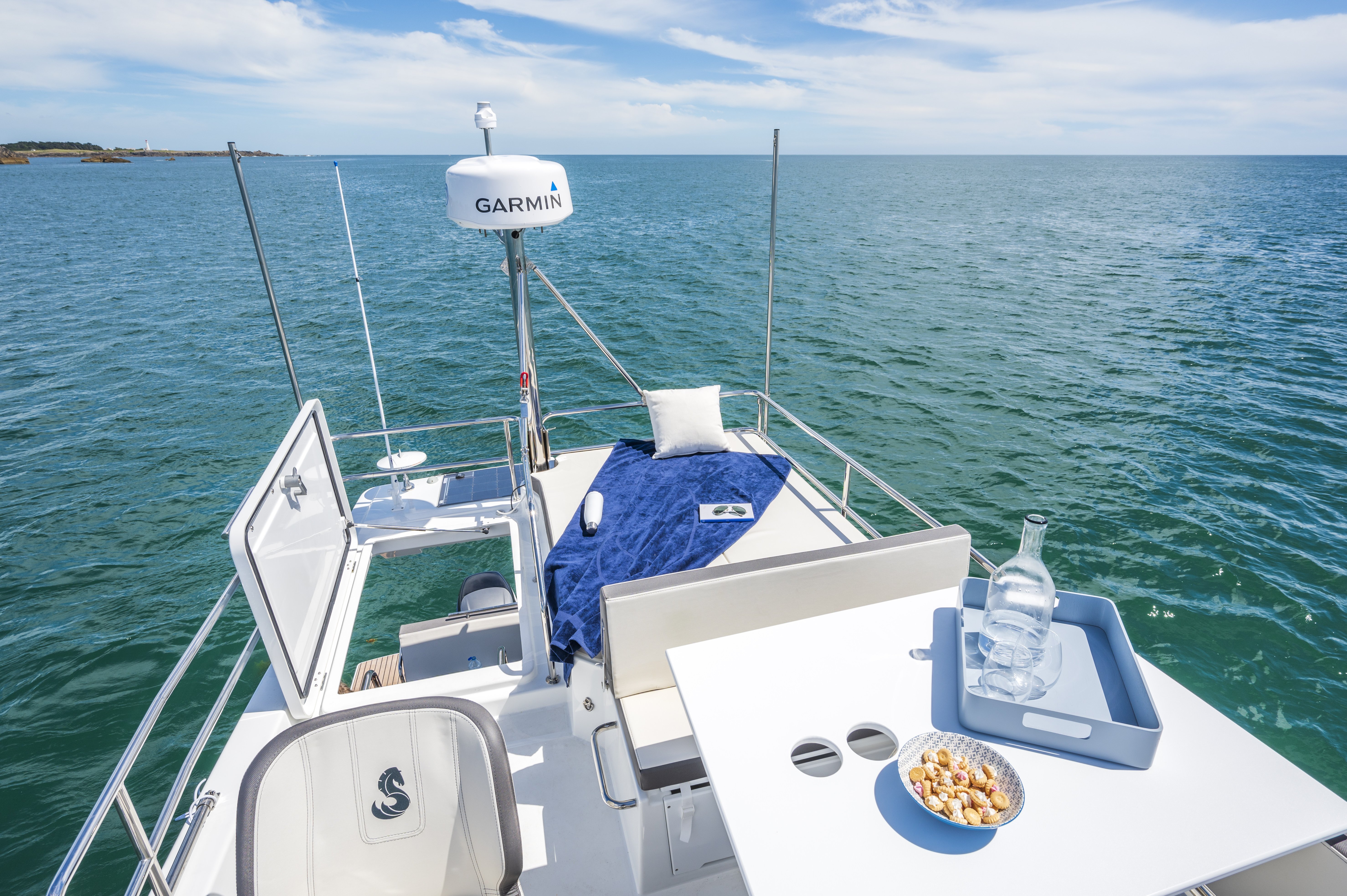 Below deck, the intelligently configured interior offers two comfortable cabins, ample natural light through expansive glazing, a full galley and a sociable saloon — comfortably accommodating family and guests for days on the water.