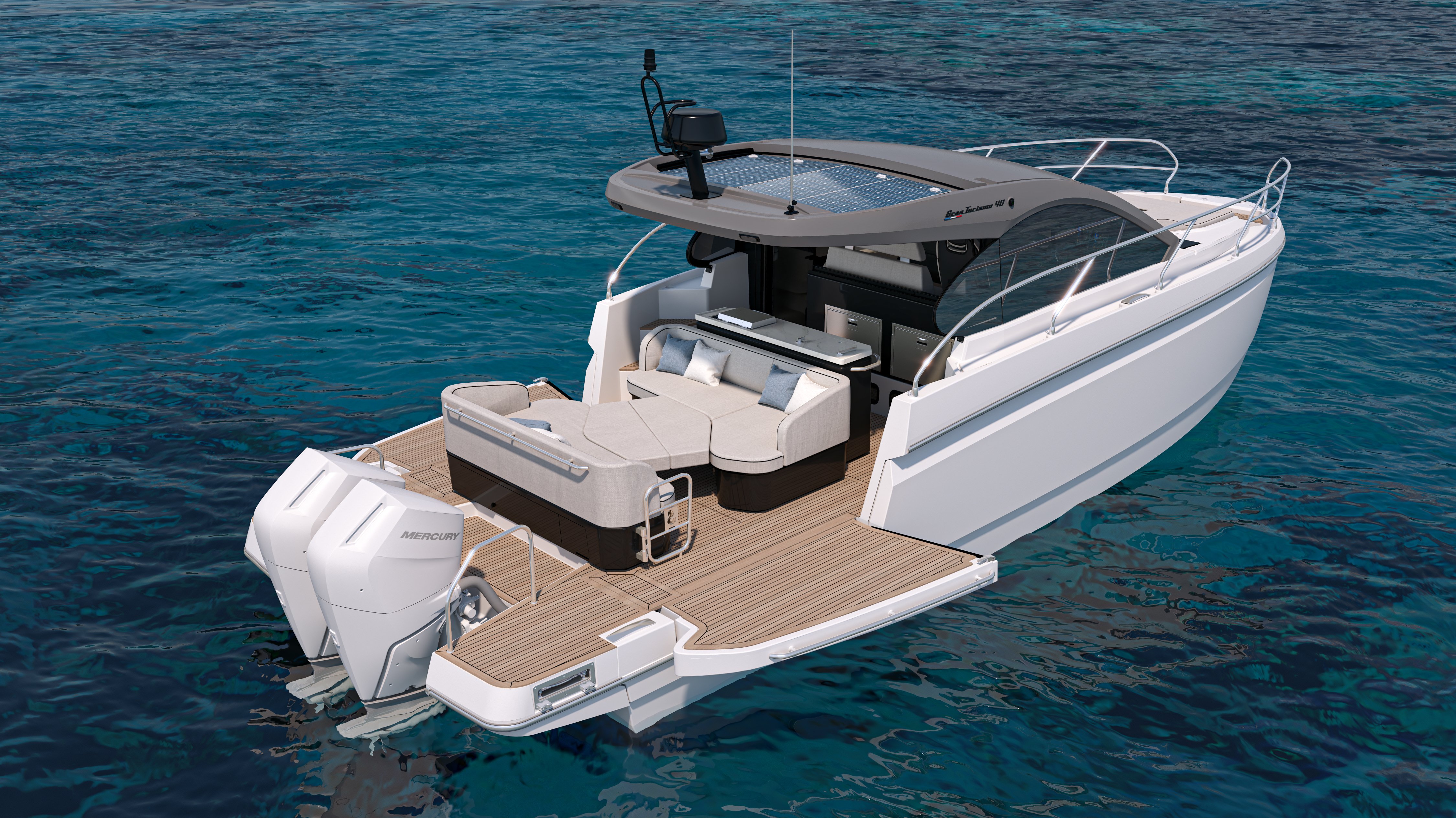 With twin Mercury Verado 400hp or Yanmar 320hp engines (as base engine options) the Gran Turismo 40 delivers thrilling speeds managed from a perfectly designed helm station. Sophisticated finishes, signature hull light blades, and a seamless indoor/outdoor flow set an entirely new standard in terms of what an express cruiser should offer.