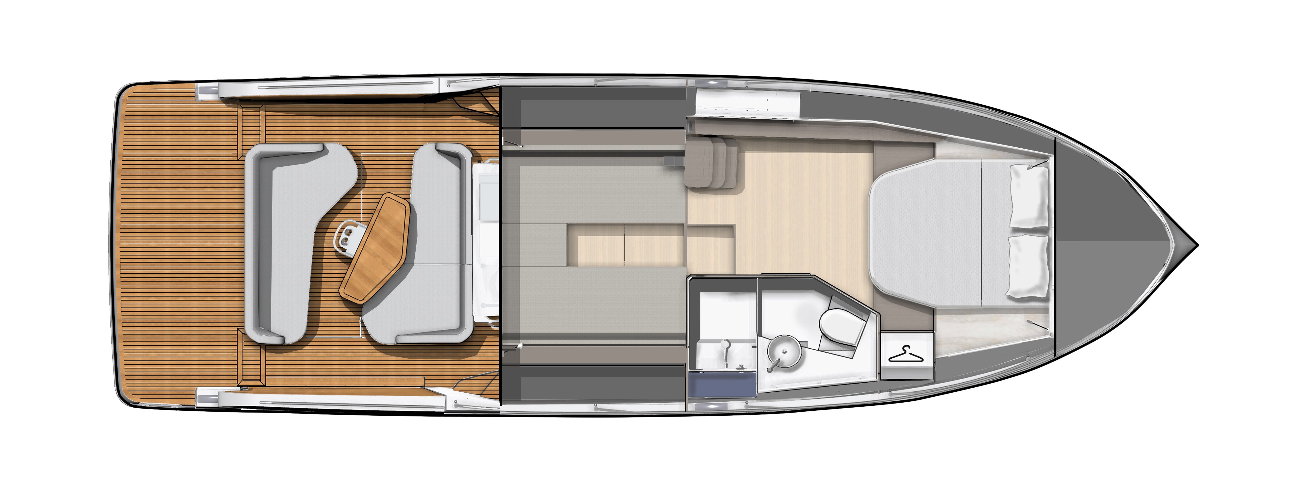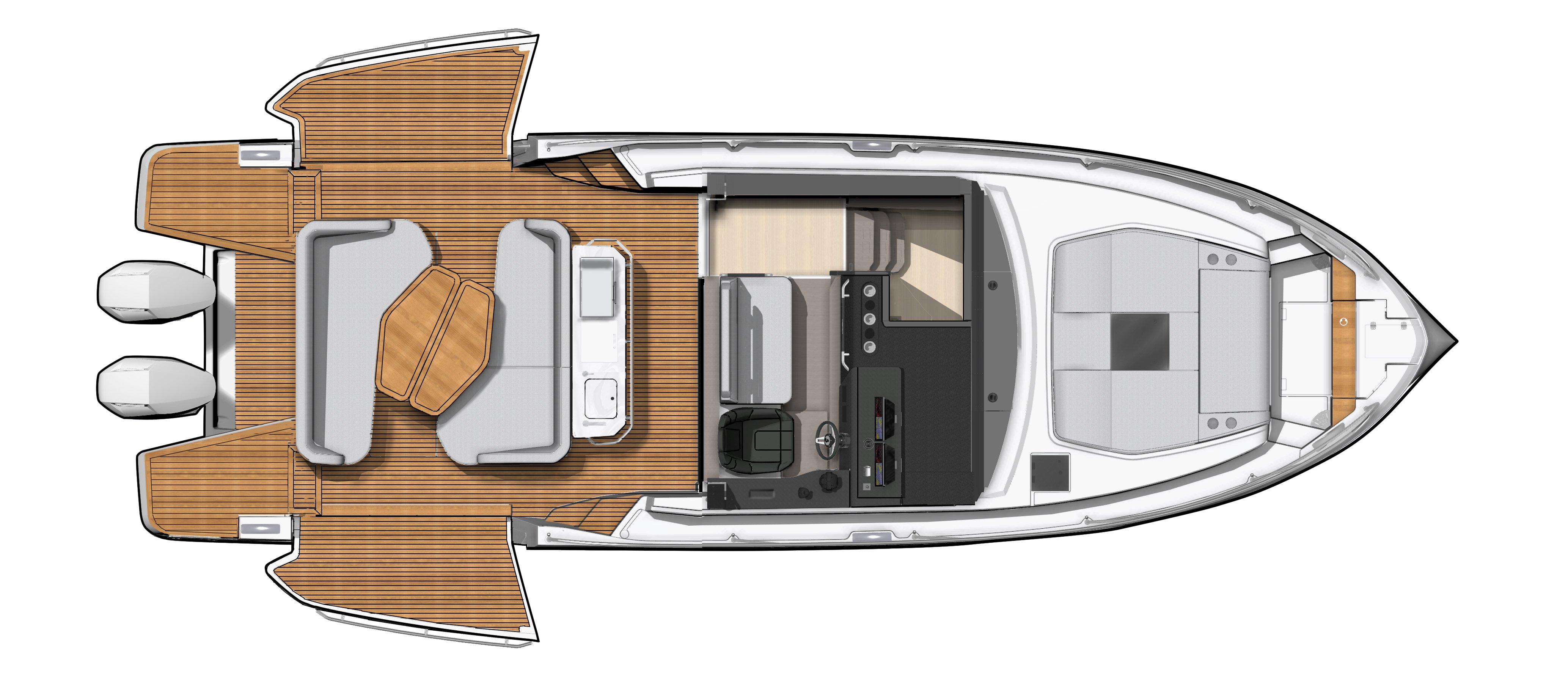 One of the timeless luxuries of this world remains the luxury of choice, and in this spirit BENETEAU offers the new Gran Turismo in different versions – outboard, sterndrive or coupe. The expansive aft cockpit features a dual L-shaped seating arrangement and a aft-facing wet bar, creating a perfect entertainment command post. A fully equipped galley makes it perfect for weekends aboard or longer touring adventures. The foredeck sunpad with flip-up seating and a sun awning option allow for easy transitions between sun and shade, and movement across the boat is as easy as it is natural.