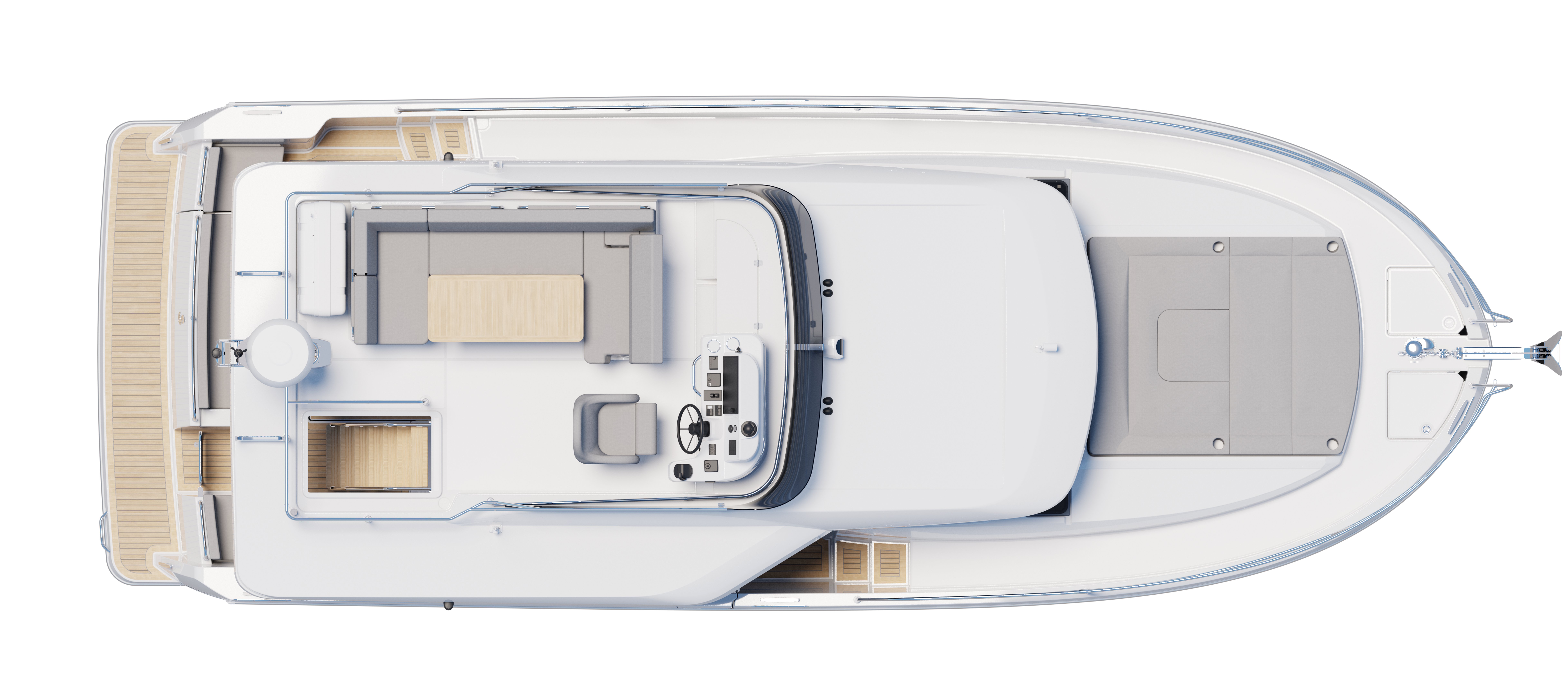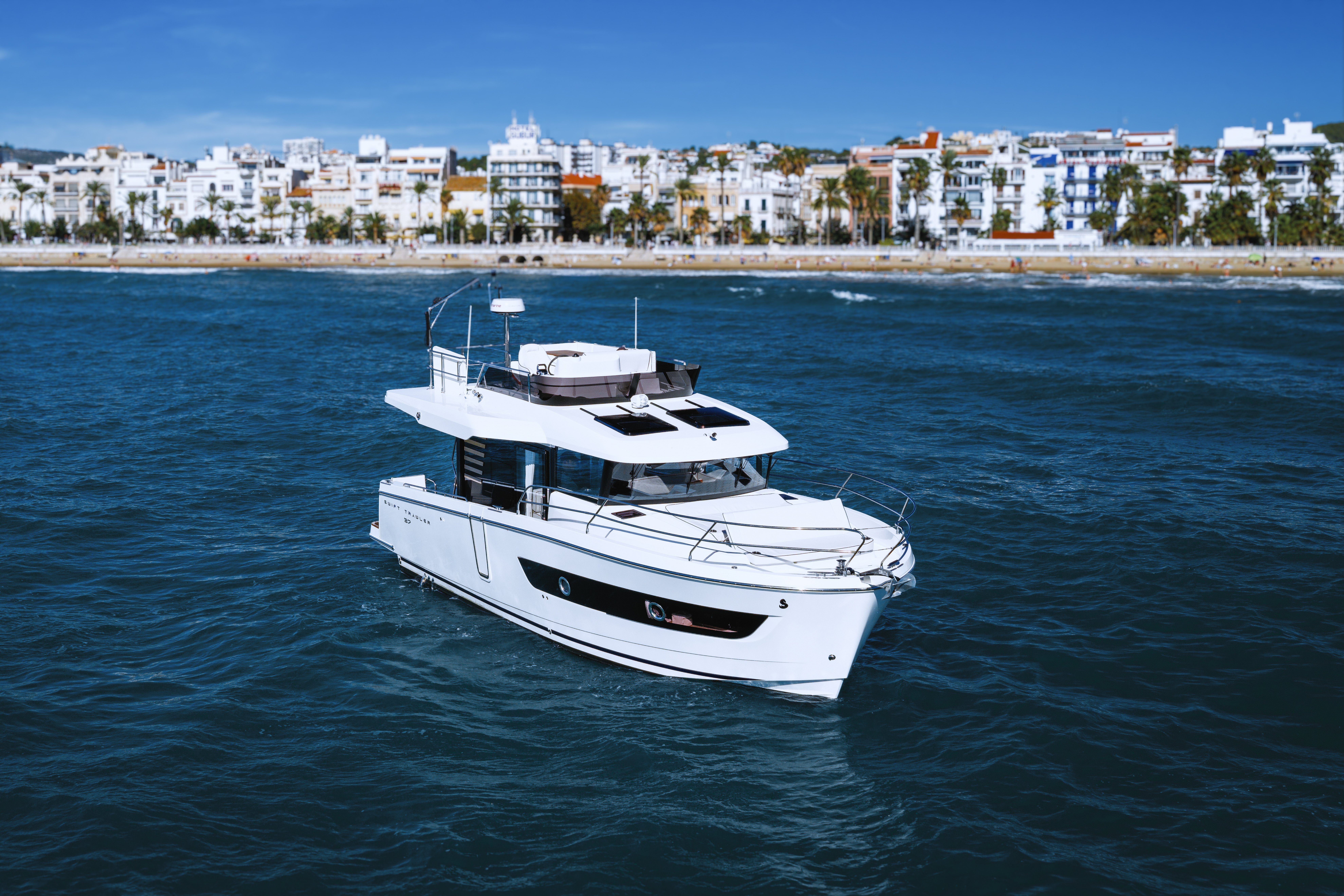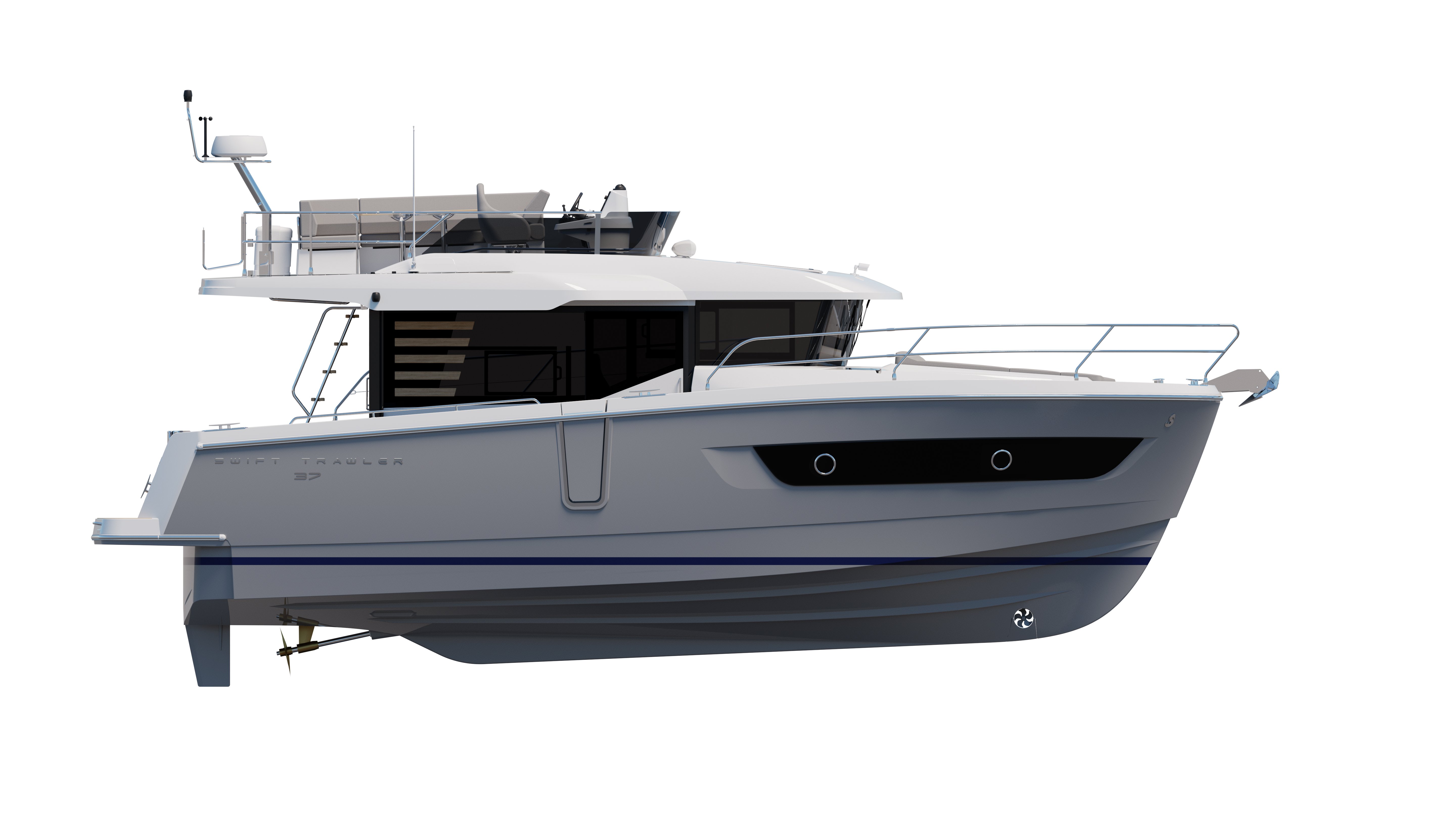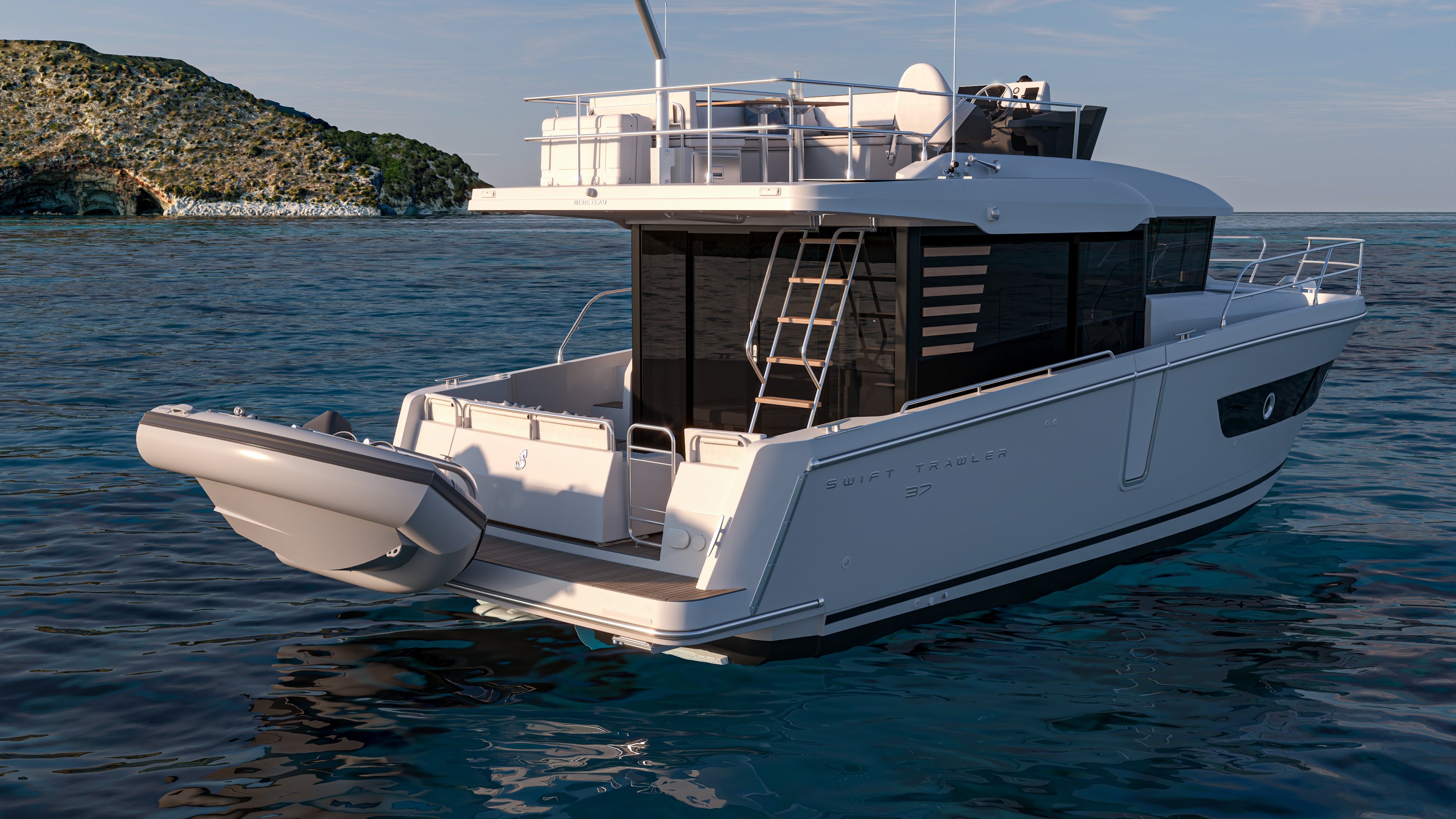 The eye-catching new Swift Trawler 37 Flybridge blends style, comfort and freedom to deliver understated elegance on the water. For more than 140 years Beneteau has been continuously improving. And we always listen to feedback from our customers. This has led us to create the ultimate family cruiser with optimal space and performance for life onboard. The stunning Flybridge configuration features a raised helm position with excellent visibility alongside a very social u-shaped seat with a forward-adaptive backrest, table and built-in coolbox. Even with this classic set up there is plenty of space to store your water toys alongside the modern recreational and navigational facilities.
