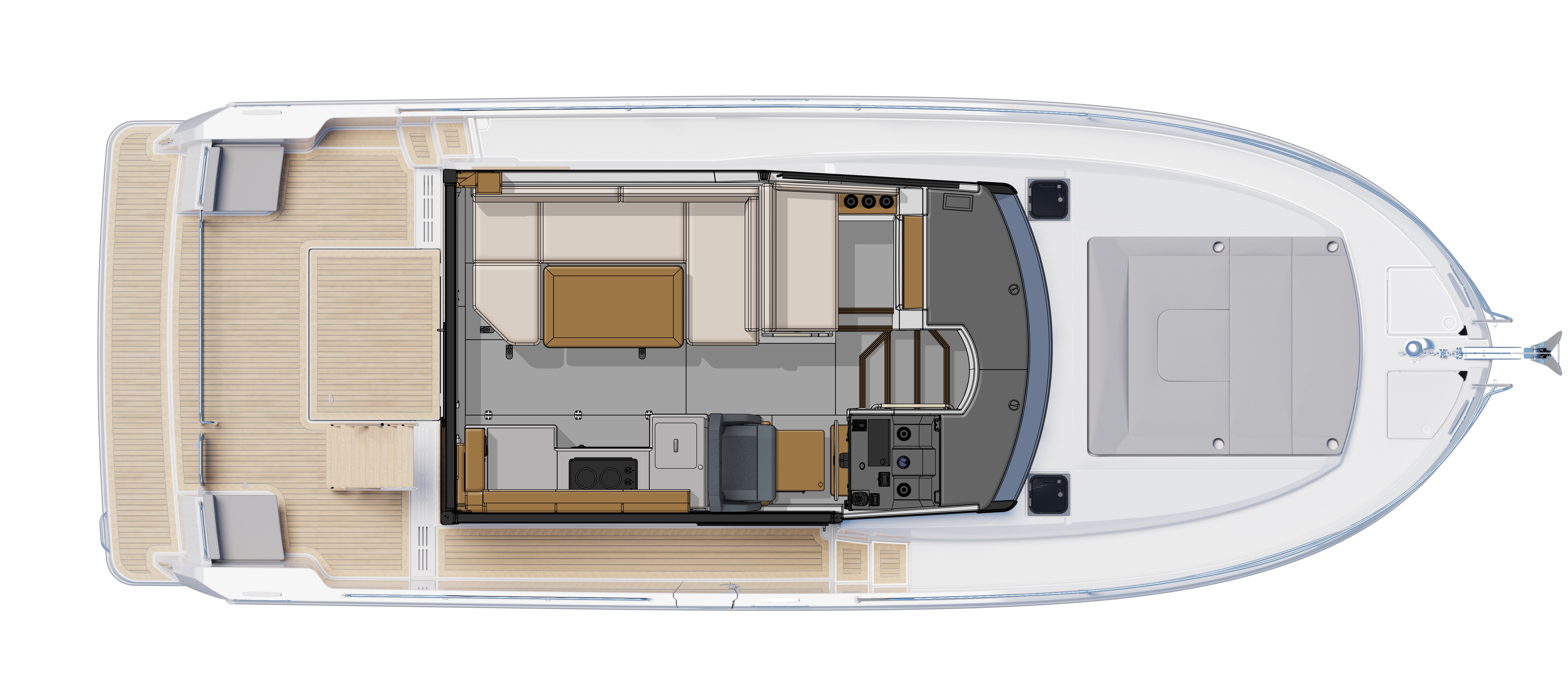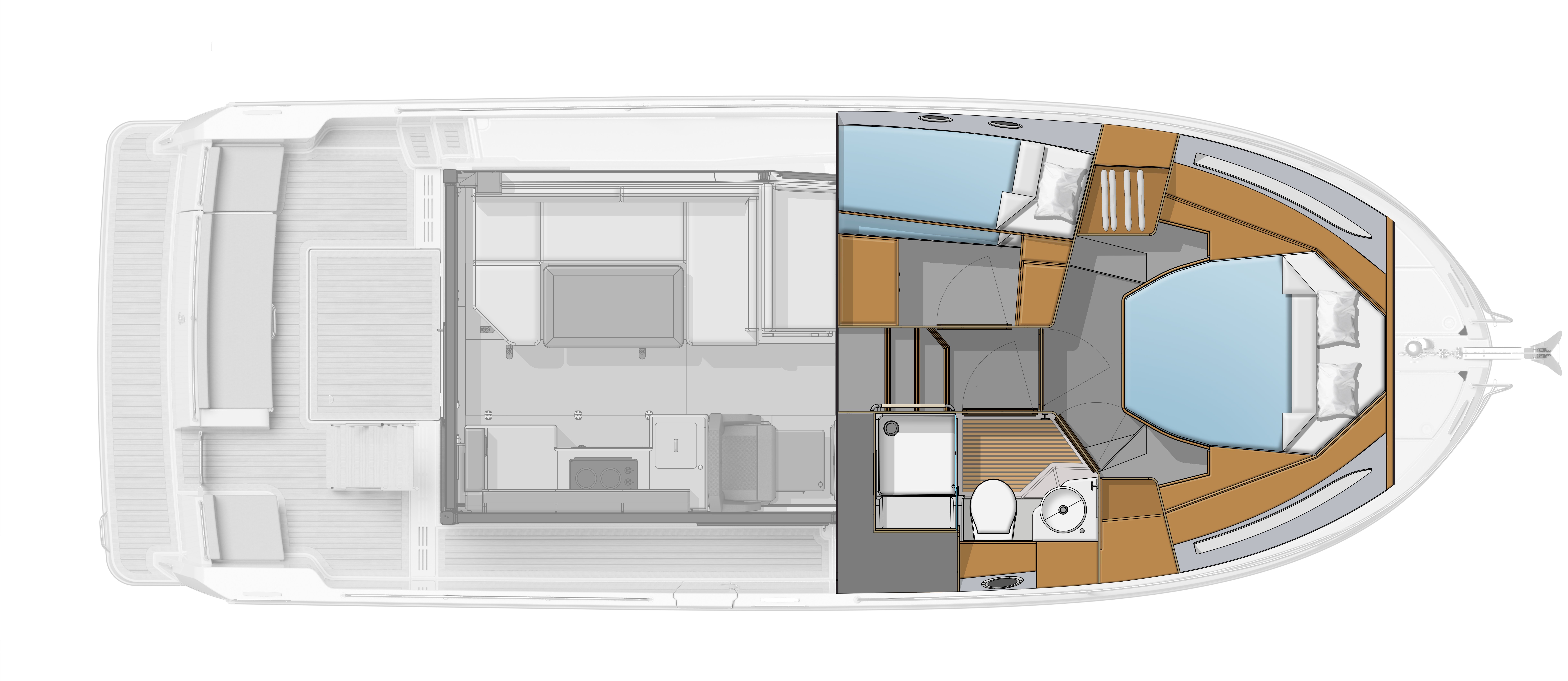 Alongside the help, we have introduced an innovative lift-up table that smartly converts into a comfy work station. Down below, the focus is on the roomy owner cabin, as well as the main bathroom which has a Jack & Jill set of doors and features a separate shower cubicle. The galley and bathroom feature Corian worksurfaces as standard, while the new décor and comfort Luxe pack can further enhance life on board.