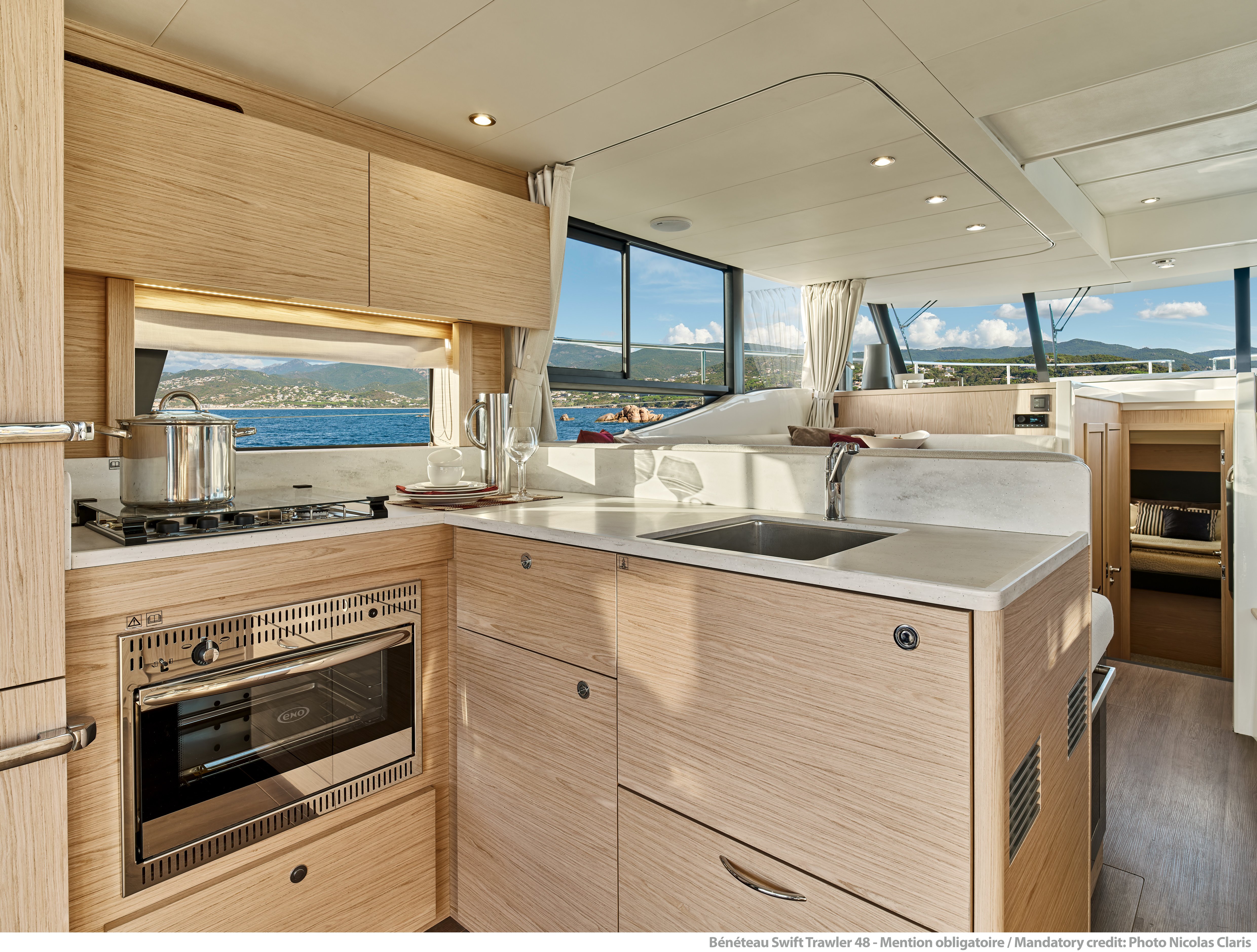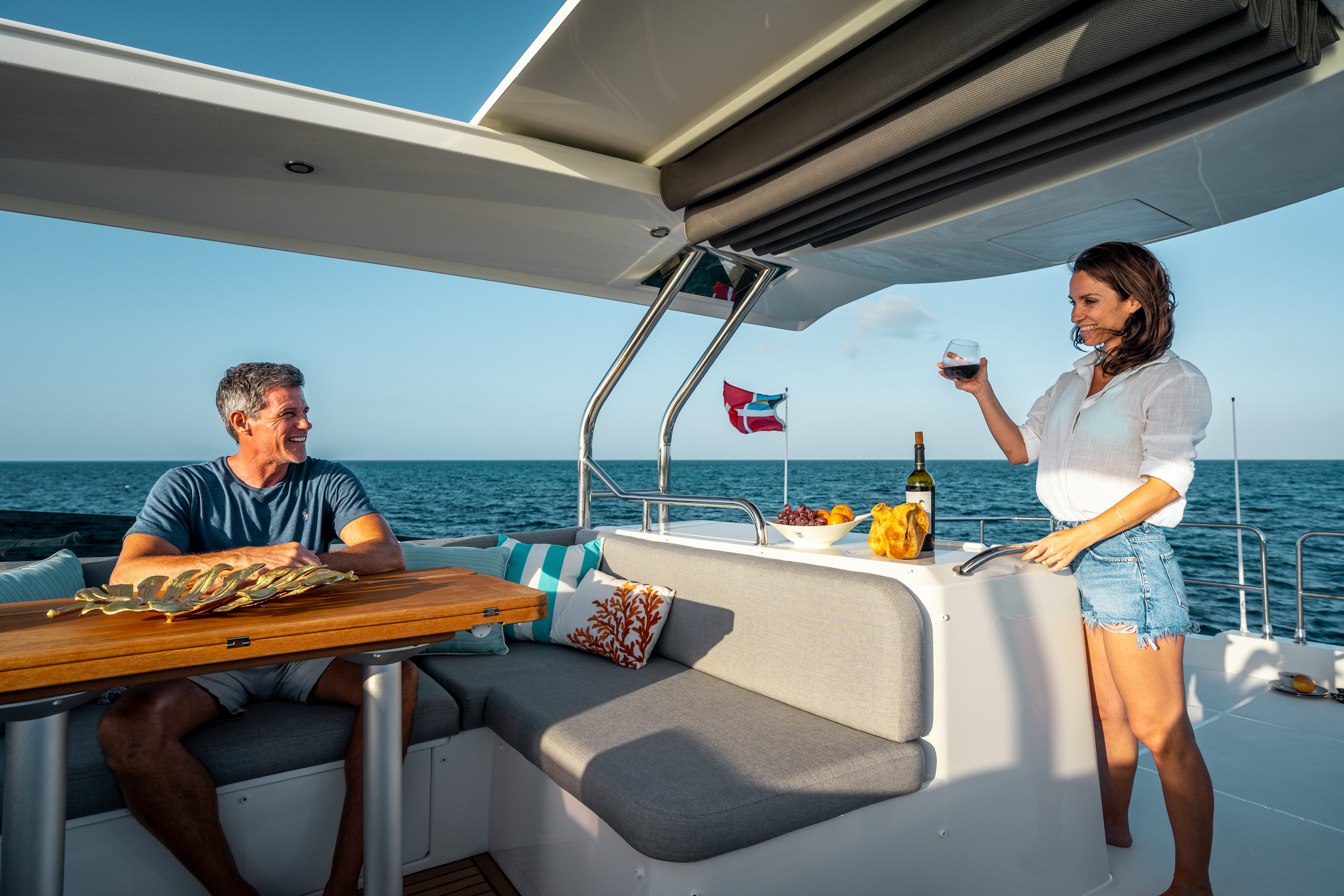 Enjoy the delights of the sea thanks to the generous Swift Trawler 48 exterior spaces. The aft cockpit can fit a folding table and two directors chairs which together with the large bench seat maximise the indoor/outdoor living space. The transom double gate opens onto a large swim platform with an optional hydraulic lifting system.
