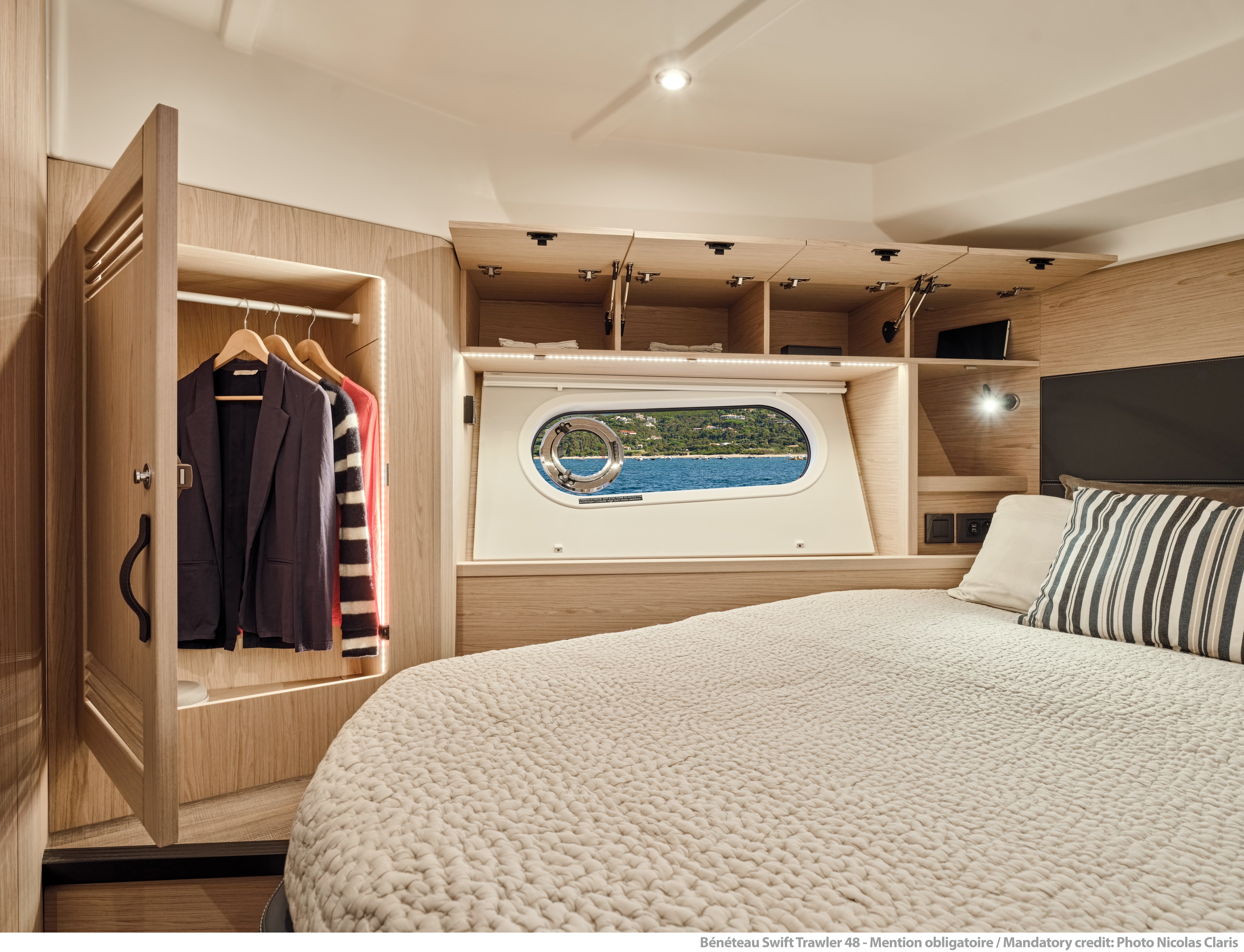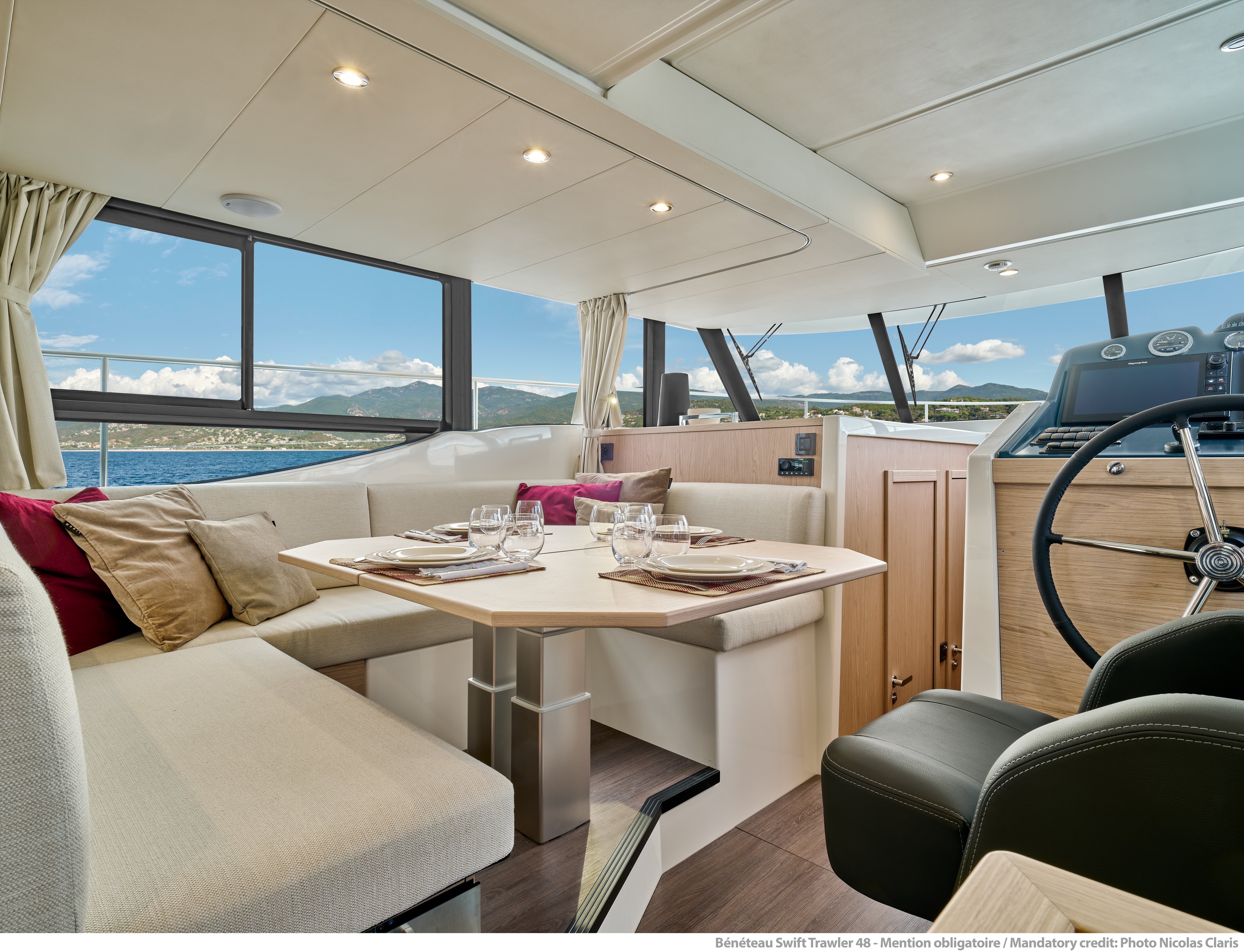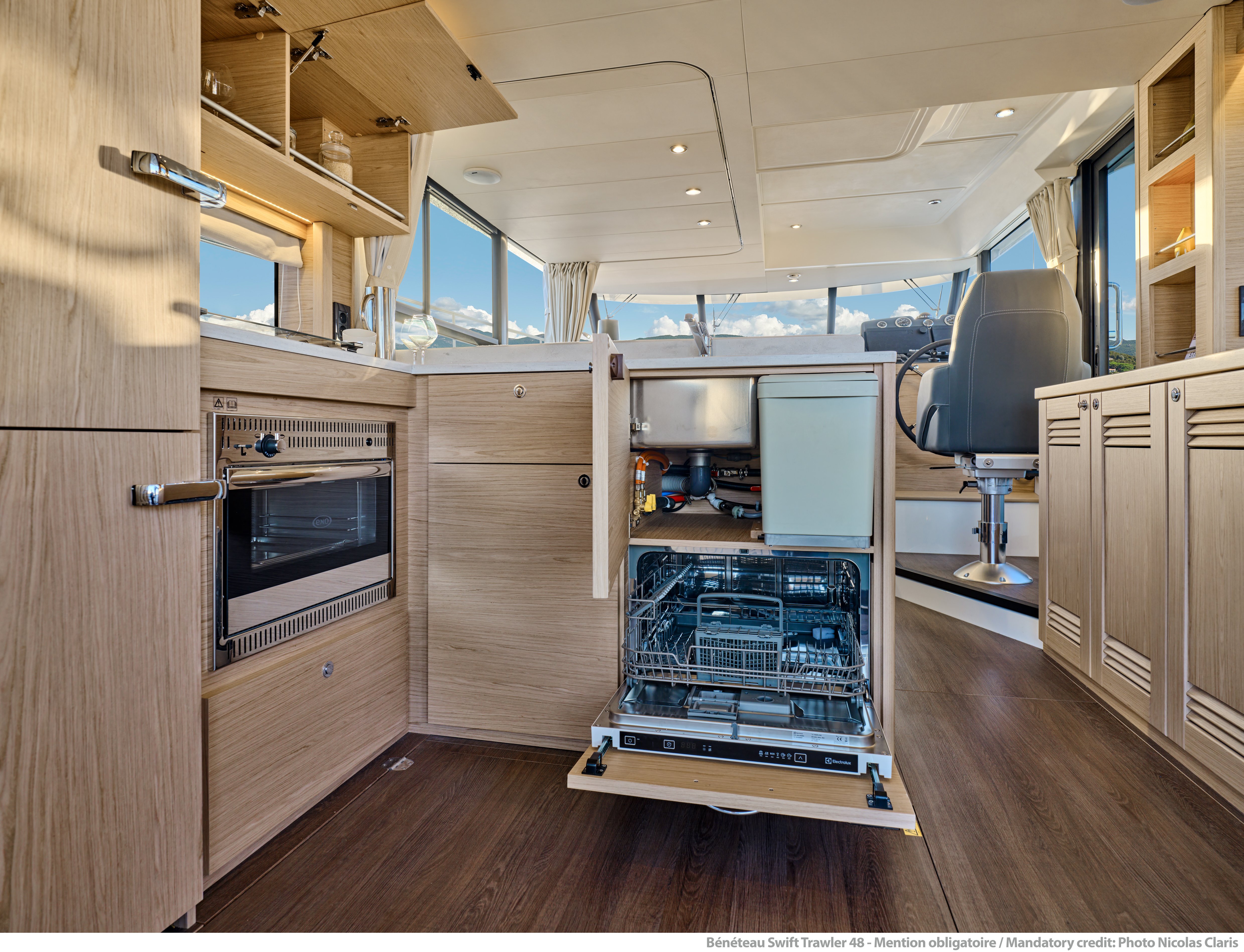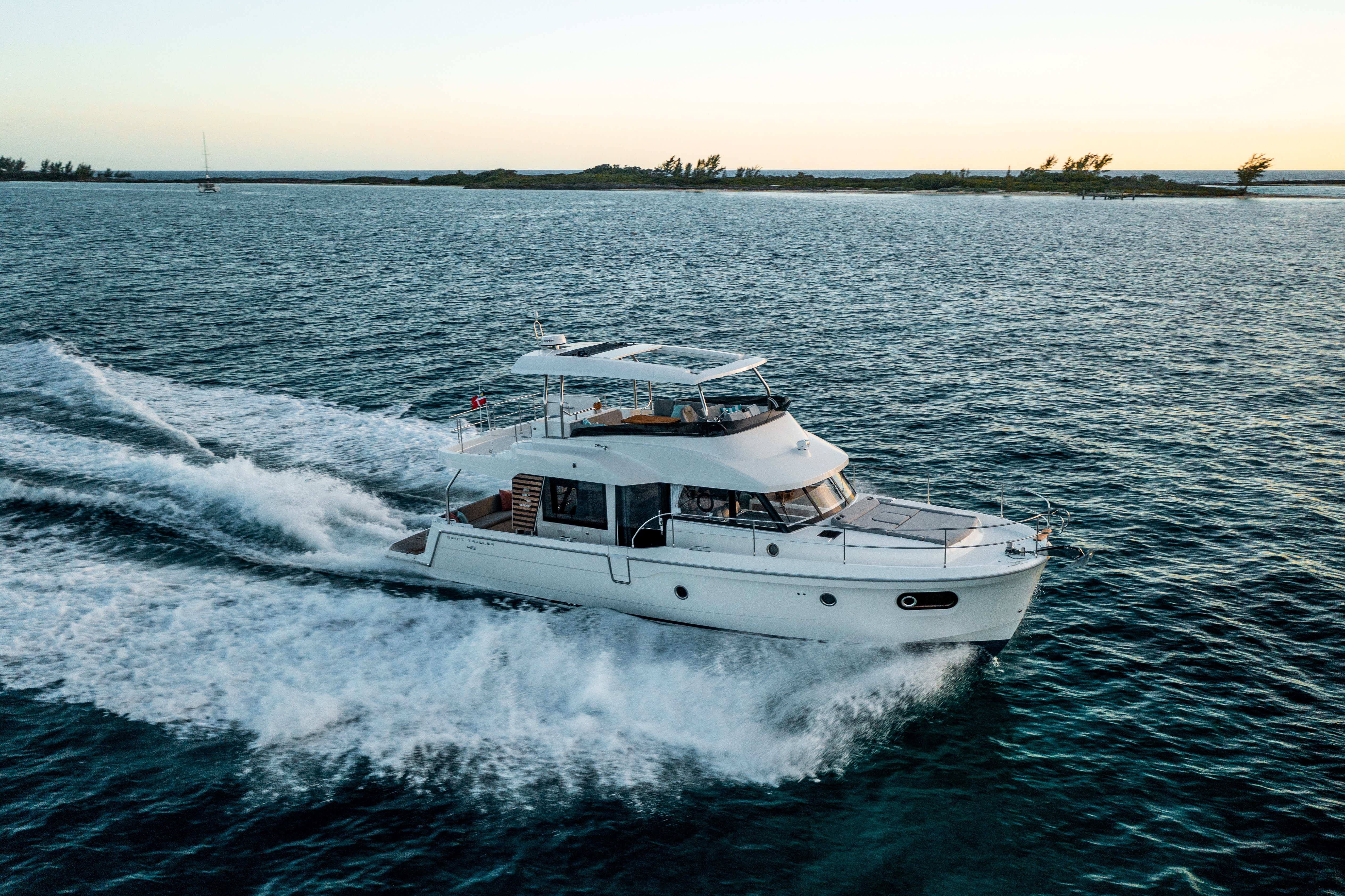 The Swift Trawler 48 focuses on practical easy living and circulation and is built to seek new horizons. This mid-range boat has a strikingly stylish profile which features the stainless framed teak slat fashion plates - aligned with those seen on the Grand Trawler 62.