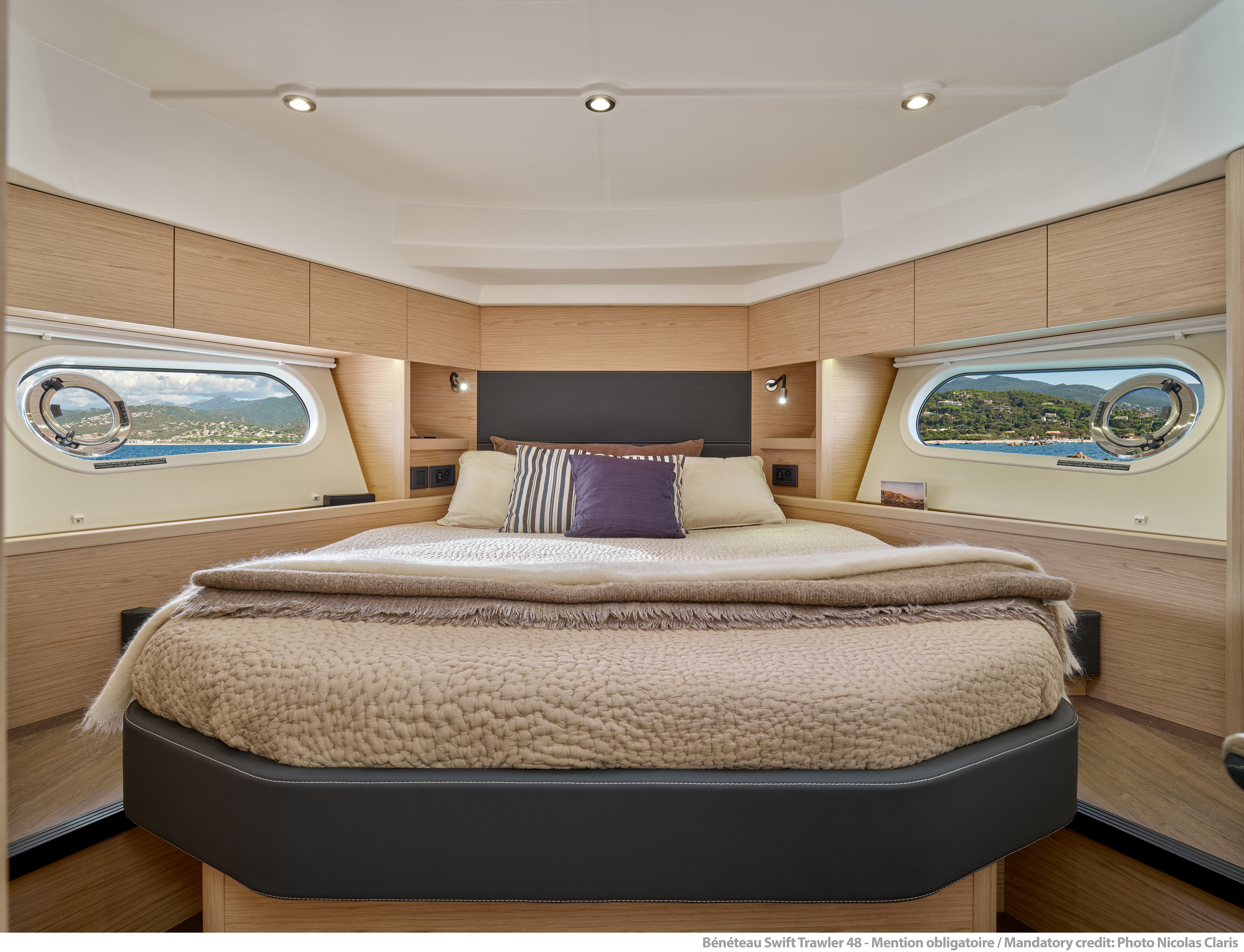 The 20 sqm flybridge is a fantastic space for panoramic views. The transform backrests either side of the pilot seat allow plentiful forward facing seating during passage making. Aft there is a great area to eat & relax with a large dining table and a wetbar. On the foredeck the optional sunpad with lift up sections creates forward seating The asymmetrical deck layout allows for a wide and well-protected starboard sidedeck.