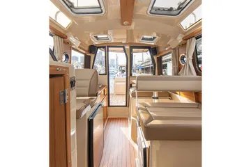 The first thing you will notice when looking at the popular Ranger Tugs R-23 is the dramatic, curved windshield and visor, accompanied by several overhead skylights. There is no shortage of light or visibility onboard the R-23, which incorporates four opening roof hatches, sliding side windows, and an opening glass bulkhead, providing an open and airy feeling inside and out. Opening portlights also allow for a nice cross breeze in the cabin. The R-23 is powered by a 200 HP Yamaha outboard.
