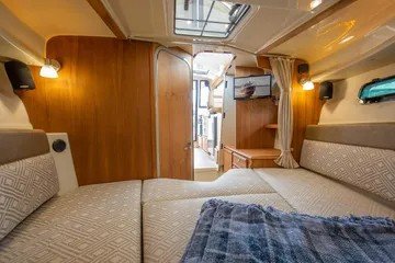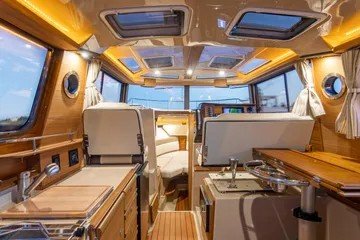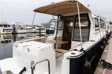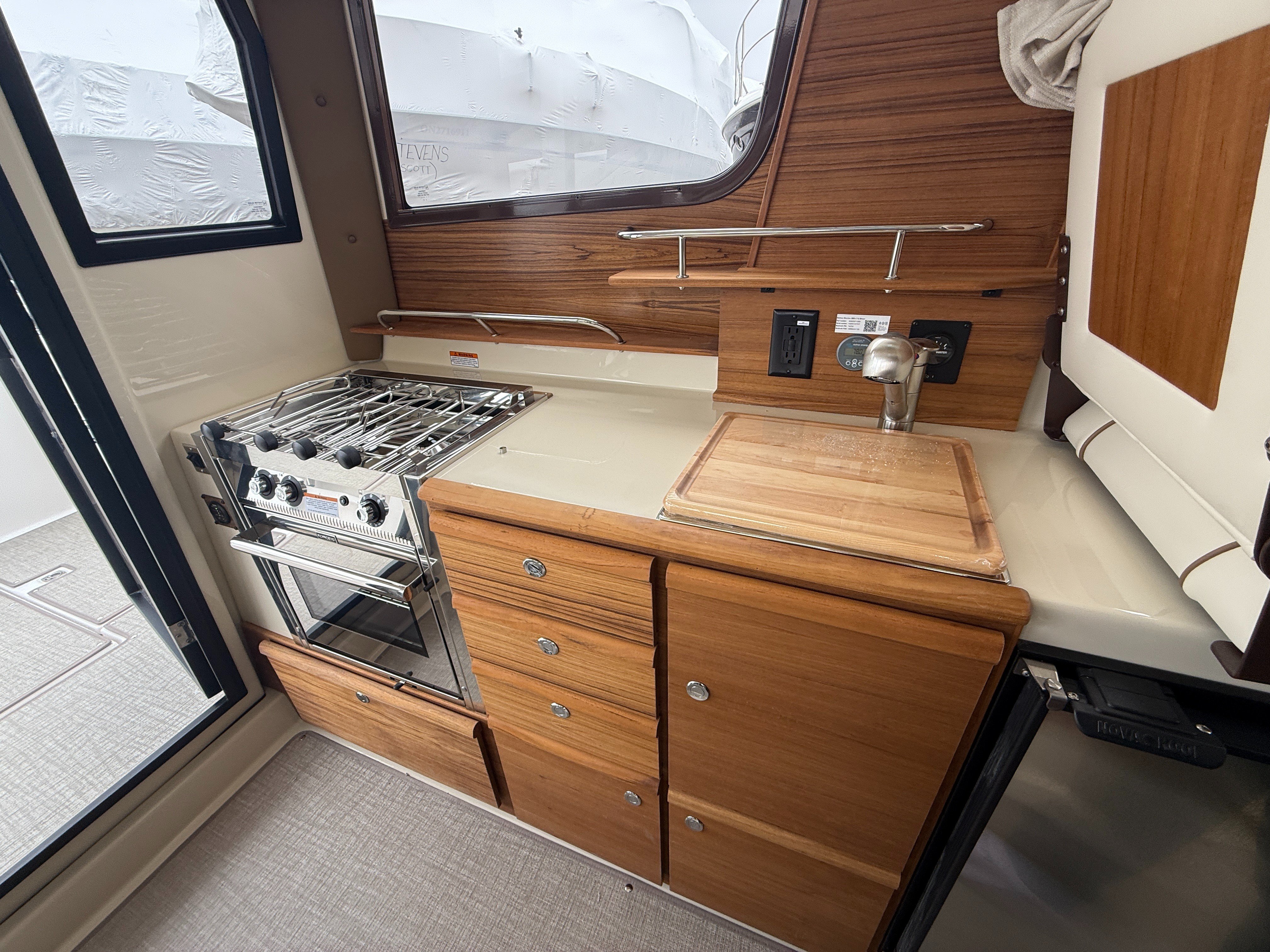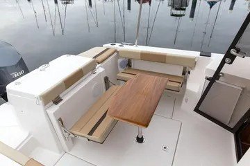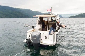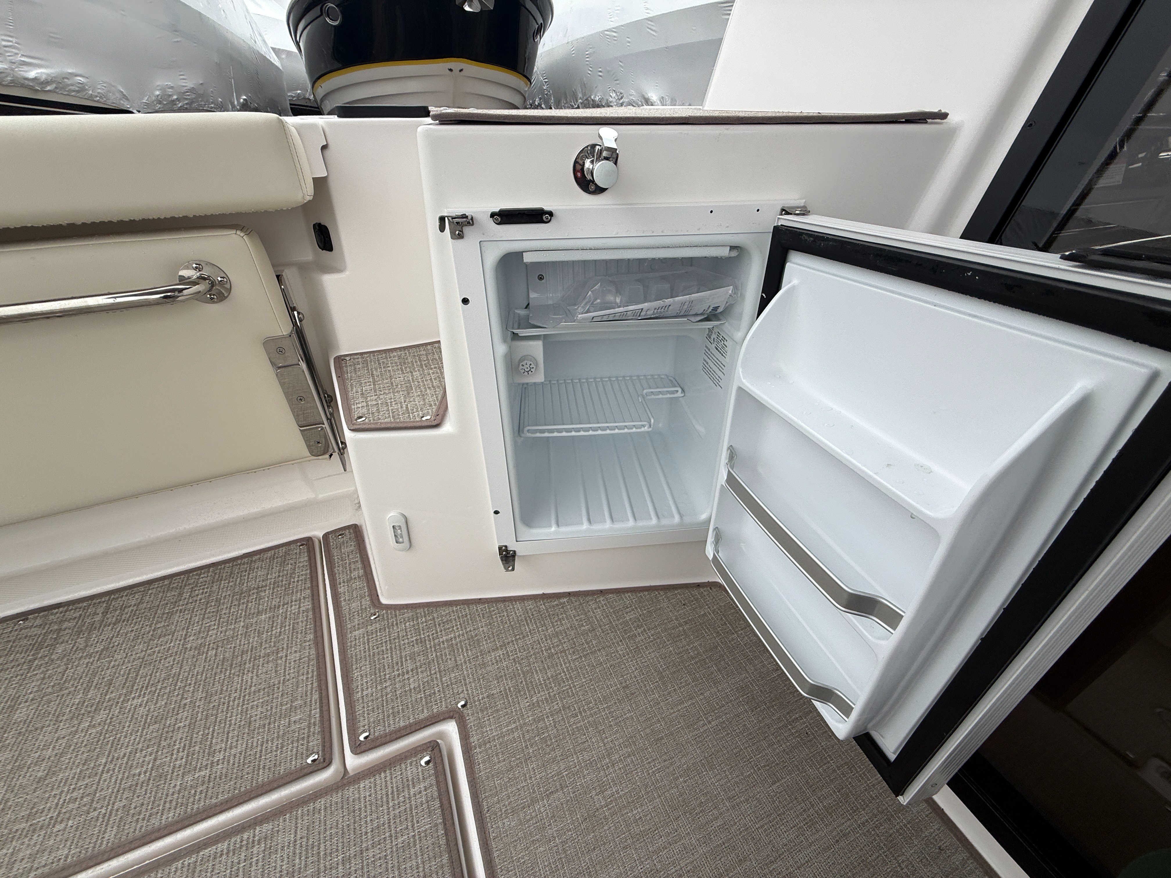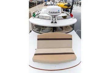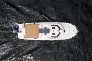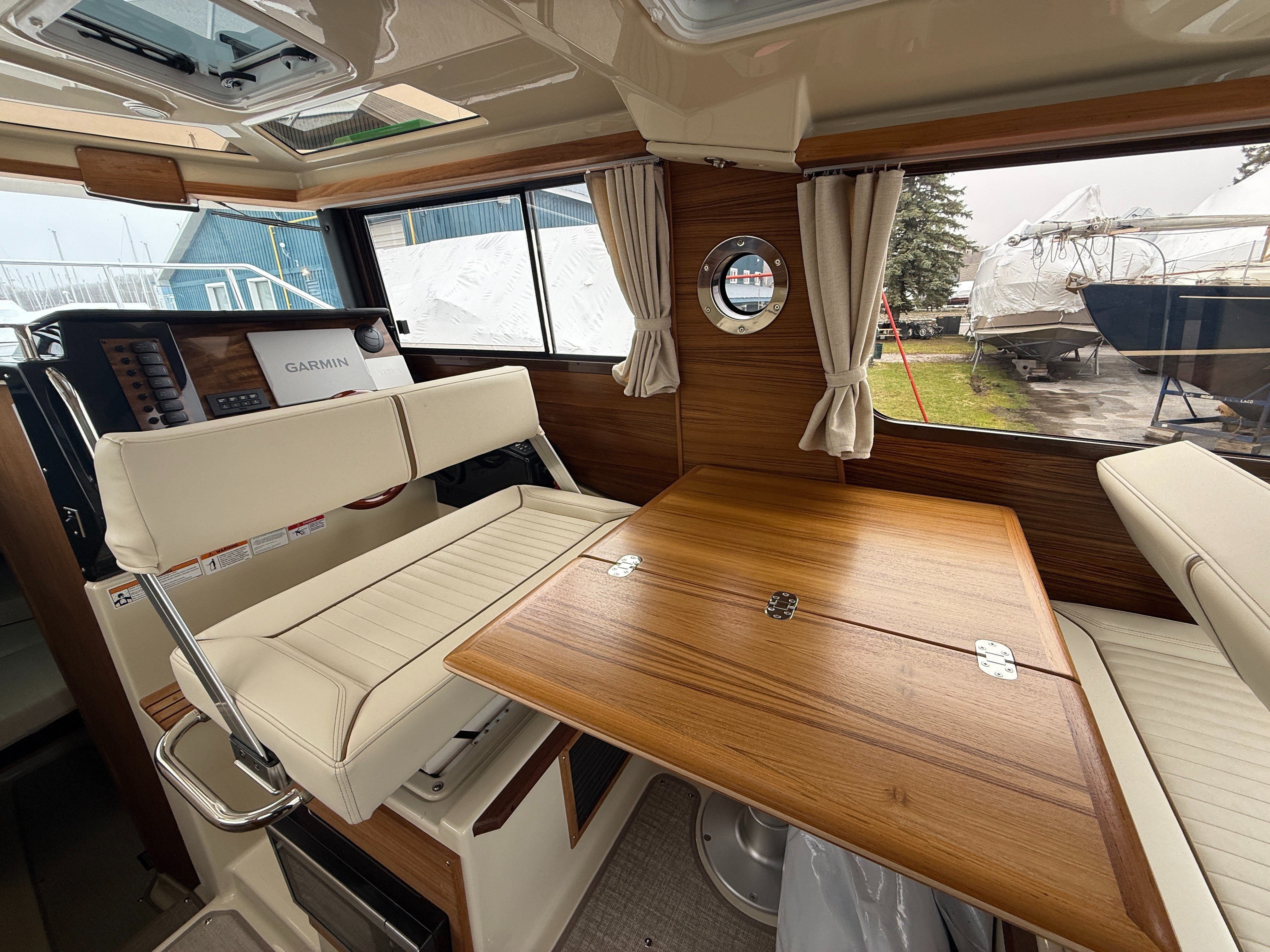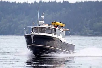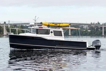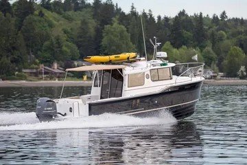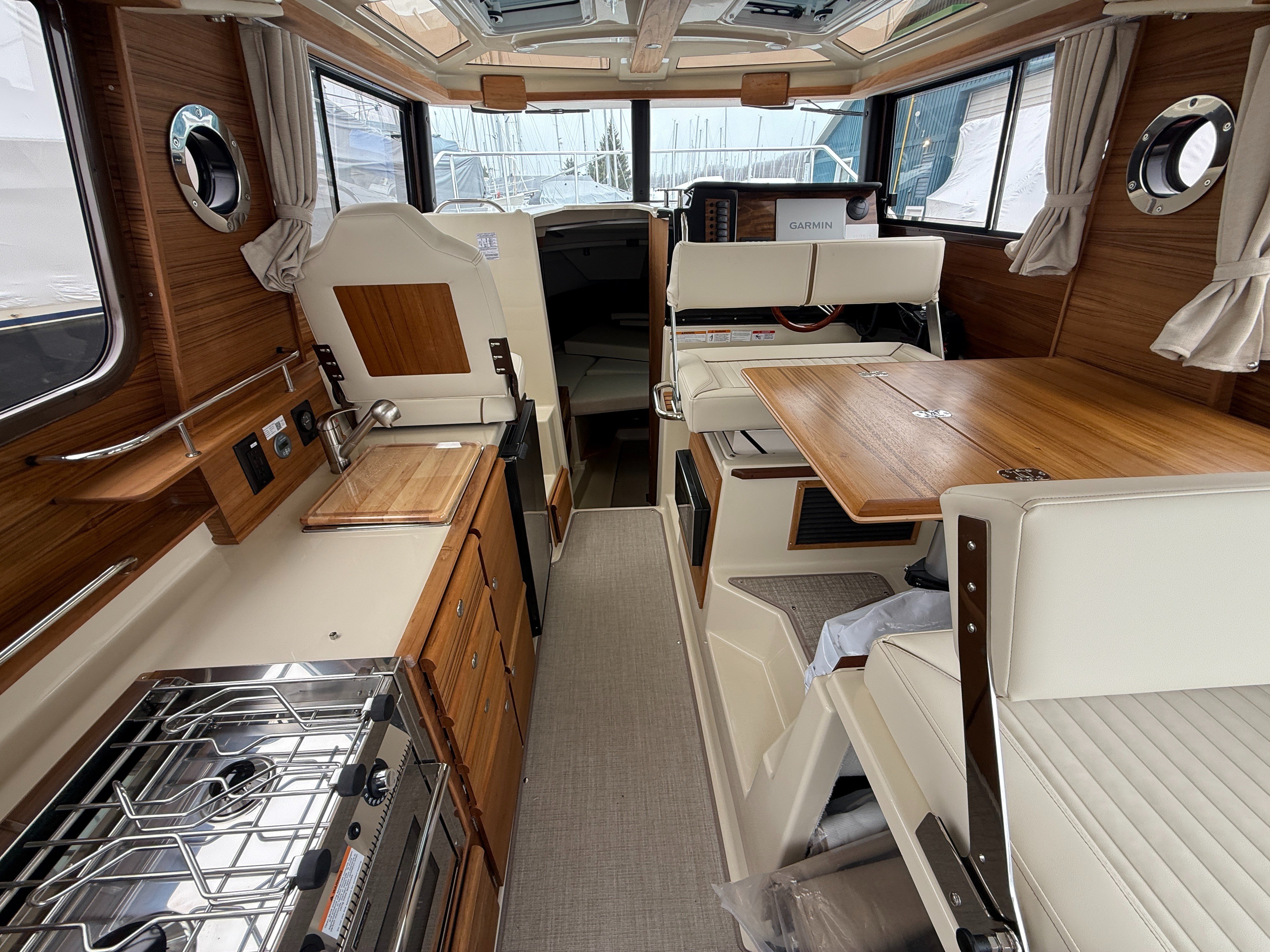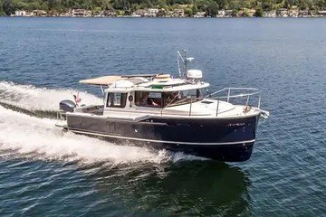 Cruising without compromise is the name of the game for the R-27. Straight from the factory, your new R-27 is outfitted to cruise, fish, and play in comfort and style. Powered by a Yamaha F350 outboard (or optional Twin Yamaha F150s), it features a 12" Garmin chartplotter, Garmin xHD radar, autopilot, bow thruster, and Lithium house batteries as standard. The curved windshield and overhead glass atrium flood the salon with light, and the cockpit includes a livewell, electric grill, cockpit sink and table, and downrigger pads. The full galley has a propane stove, oven, refrigerator/freezer, and microwave. Seating for 12+ and three sleeping areas make it ideal for extended cruising.