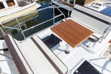 The R-31 CB shares many of the features and qualities of her smaller sisterships but some notable additions to this larger model make her ideal for extended cruising while still being a trailerable trawler. The R-31 CB is the first Ranger Tug to feature a flybridge equipped with electronic controls at both the upper and lower helm. The flybridge also retracts to allow for trailering the 31’. The builders at Ranger Tugs also equipped the foredeck with seating and a table that can be raised or lowered depending on whether the boat is under way or at anchor or dock for entertaining. In addition to the extra seating now available on the flybridge and foredeck the R-31 CB allows for a larger cockpit area with wraparound seating and extra seating that folds out of the gunwale. When not entertaining, seats are folded leaving the cockpit unencumbered.
