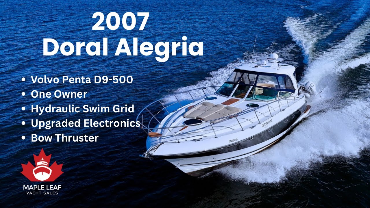 A rare chance to own the flagship of Doral’s Sport Yacht line - this 2007 Alegria, was the official boat show model, fully loaded with every top feature. Powered by twin 500HP Volvo D6 diesels with direct drives, she delivers exceptional performance, efficiency, and effortless handling. Canadian designed and built, the Algeria is renowned for its engineering and ingenuity, blending European elegance with American functionality. Her ocean-capable hull features a sharp entry at the bow and hard chine starting a few feet back from the bow for superior rough water performance. Unique to Doral, the industry-first retractable windshield panel provides easy foredeck access at the push of a button. The spacious cockpit features a hardtop, expansive helm deck, integrated swim platform with factory hydraulic platform, sun lounge/table, cockpit shower, and refrigerator – perfect for entertaining. Inside, the bright, open saloon with 7-foot of headroom feels far larger than other yachts in her class.