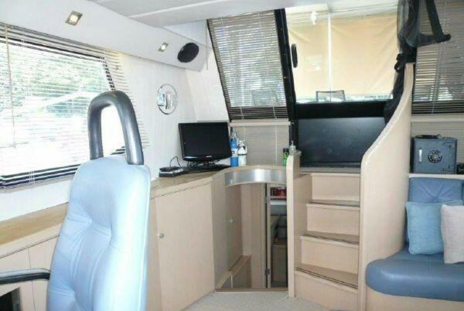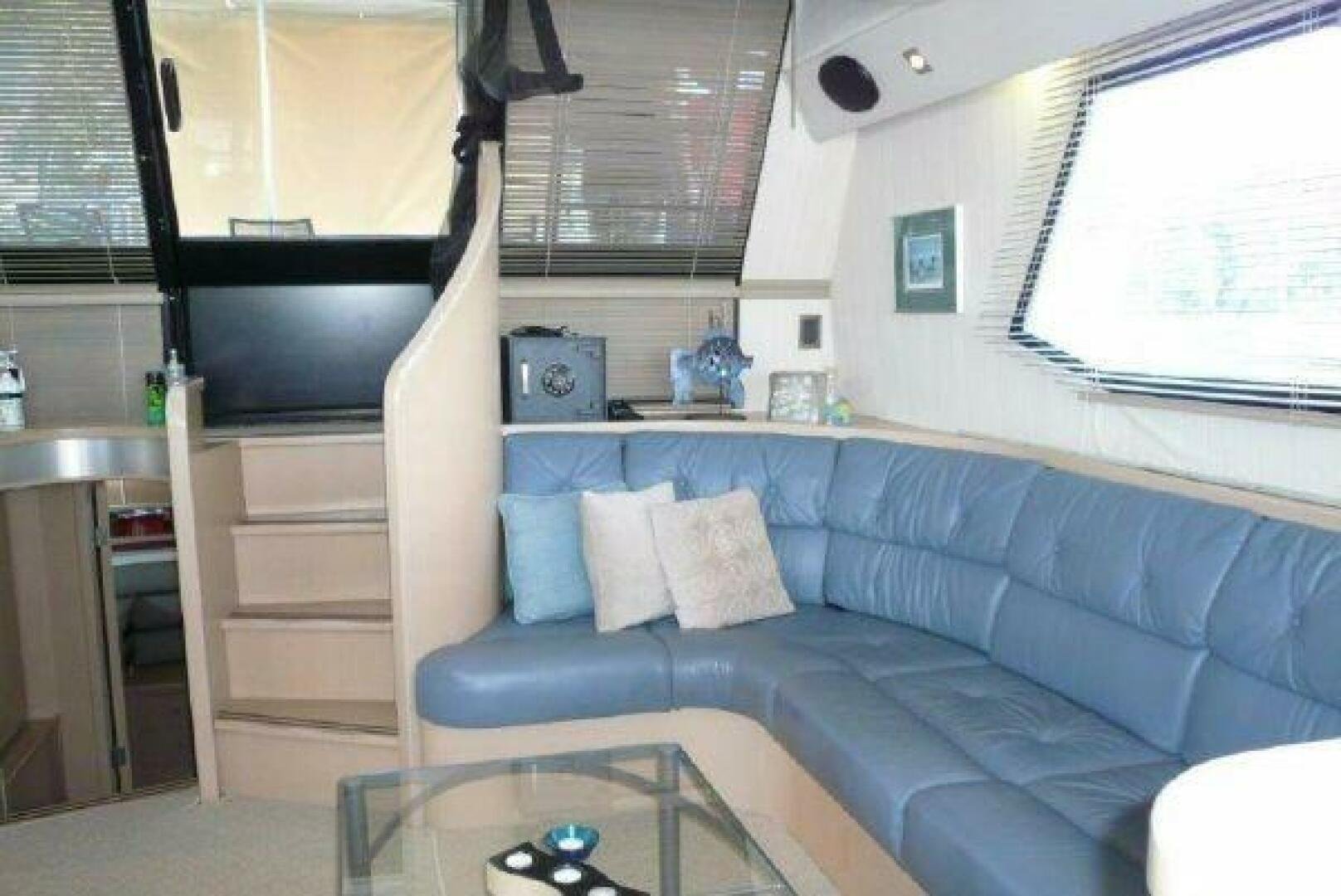 Next aft, up four stairs, is the salon. Forward to starboard is the lower steering console with captain's chair. Aft along the starboard side are built-in cabinets. Opposite to the port is a L-shaped settee. On centerline, circular stairs lead up to the aft deck area, and to starboard, stairs lead down the the master stateroom. The upright washer and dryer are located in this lower stairway area.