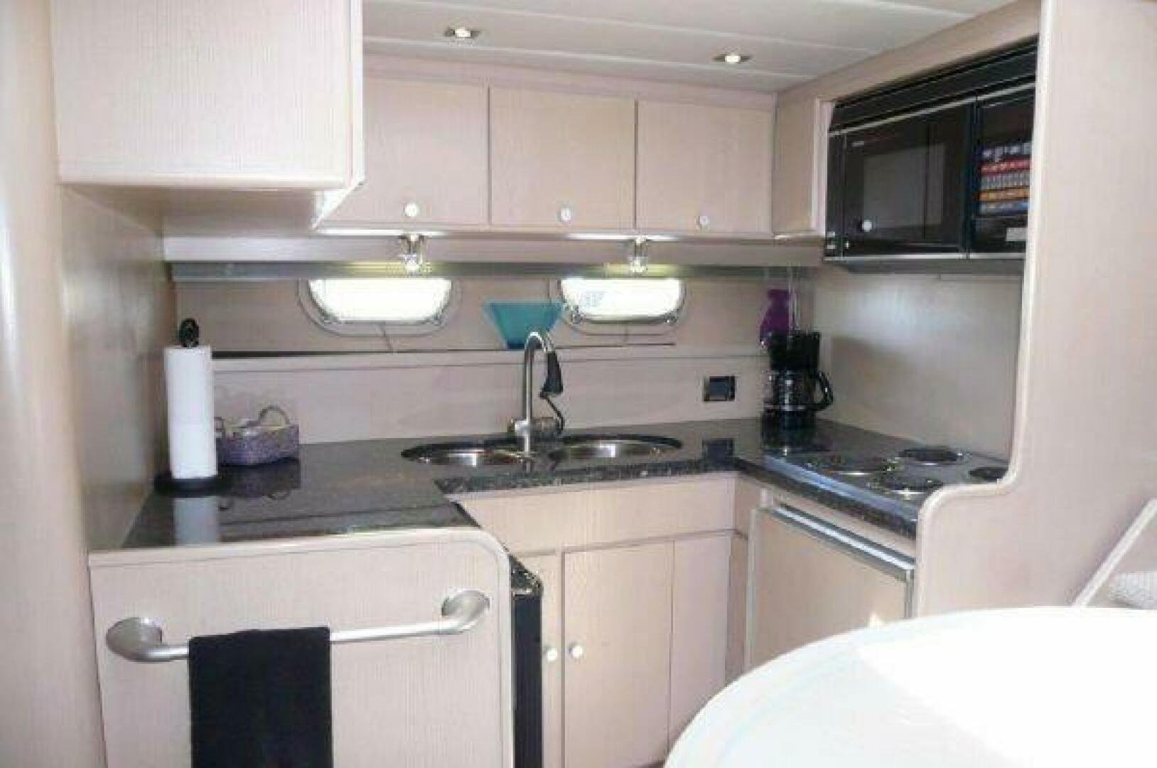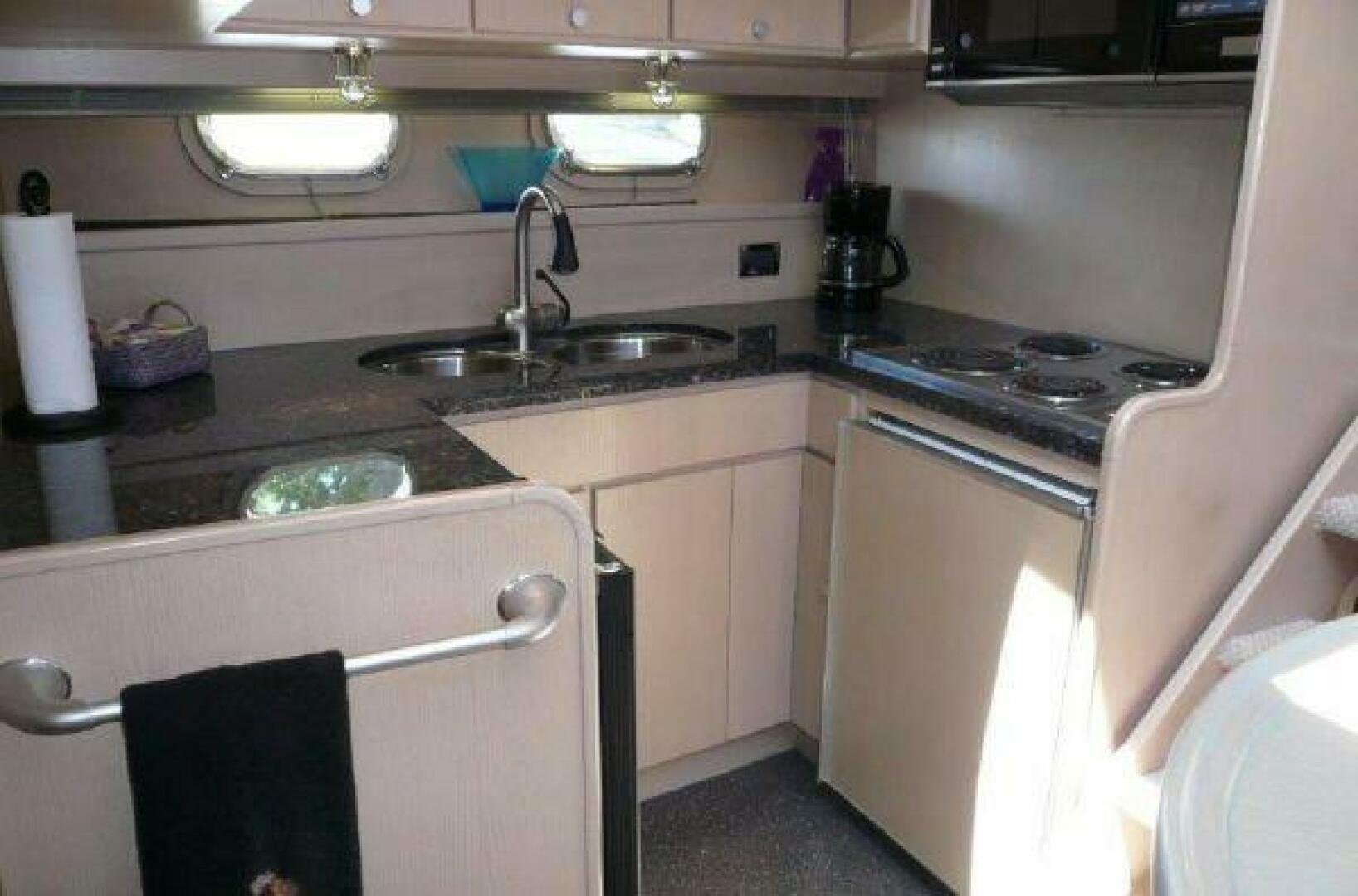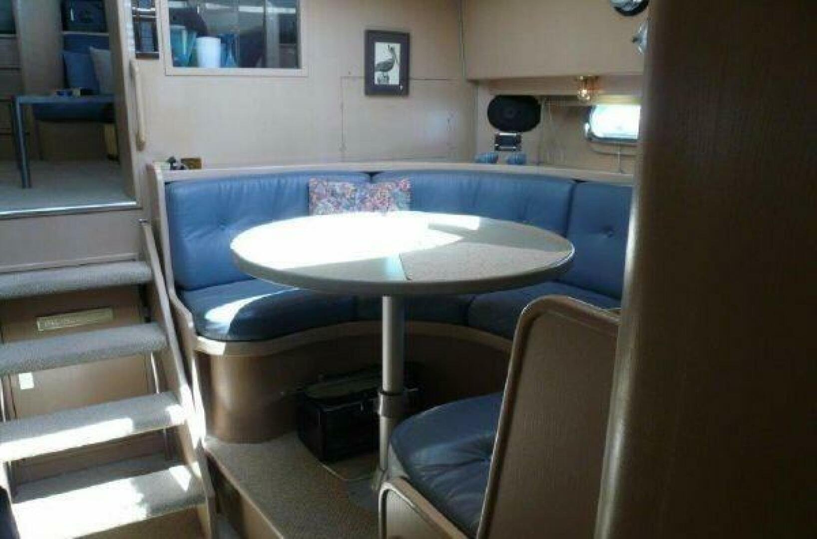 The layout below has a chain locker at the bow, next aft is the V-berth stateroom with a twin and double berth, guest stateroom to starboard with twin bunk beds adn electric head to port. Next aft is the U-shaped galley to starboard, and opposite to port, a circular dining table and circular settee. The galley and dining area are open overhead to the salon.