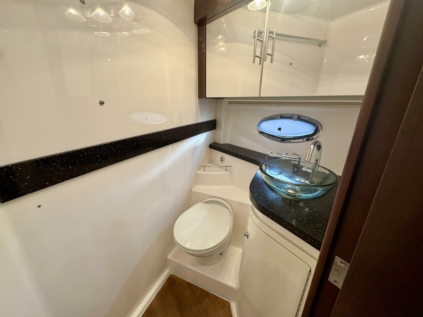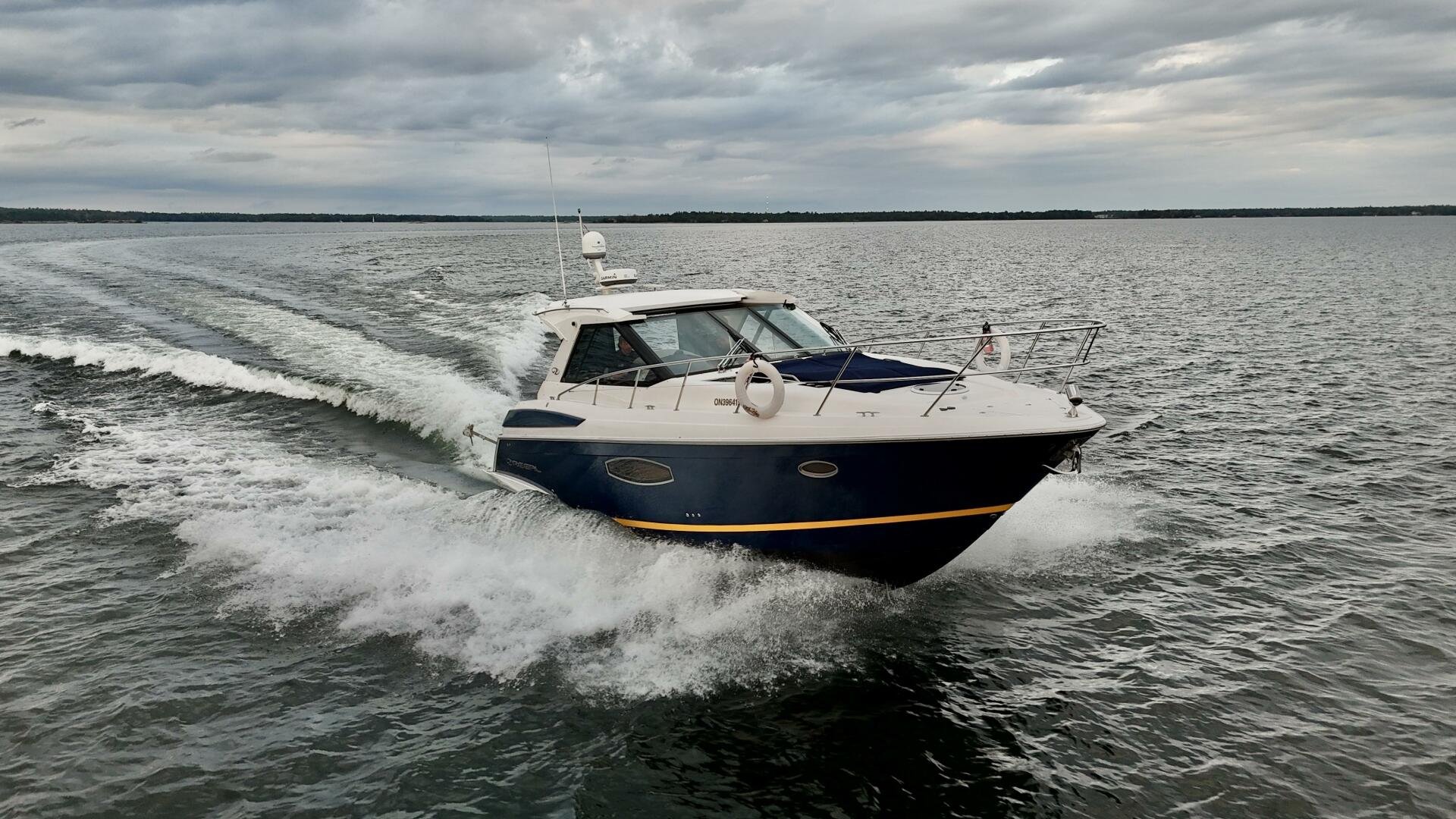 A cutting-edge design when she was introduced in 2011, the Regal 42 Sport Coupe is a sleek Eurostyle express designed for cruising in comfort and style. The full-beam convertible hardtop electrically slides back from the windshield frame to reveal an enormous opening, and sliding glass door and windows convert open aft to give the boat an open feel, with the option to be enclosed with air conditioning. Below deck, the two-stateroom two-head interior of the 42 Sport Coupe includes a private master stateroom forward with an island queen berth. The mid-cabin stateroom features twin berths, an en-suite head, and a pocket door for added privacy. A U-shaped sofa and full-service galley occupy the salon, which is notable for its full standing headroom. The cockpit can be accessed from both sides of the extended swim platform, and the center section of the deck lifts for access to the engines. Unlike some manufacturers of this era who installed pod drives in hulls originally designed for inboard power, Regal engineers designed the hull of the 42 Sport Coupe specifically for Volvo IPS pod drives.