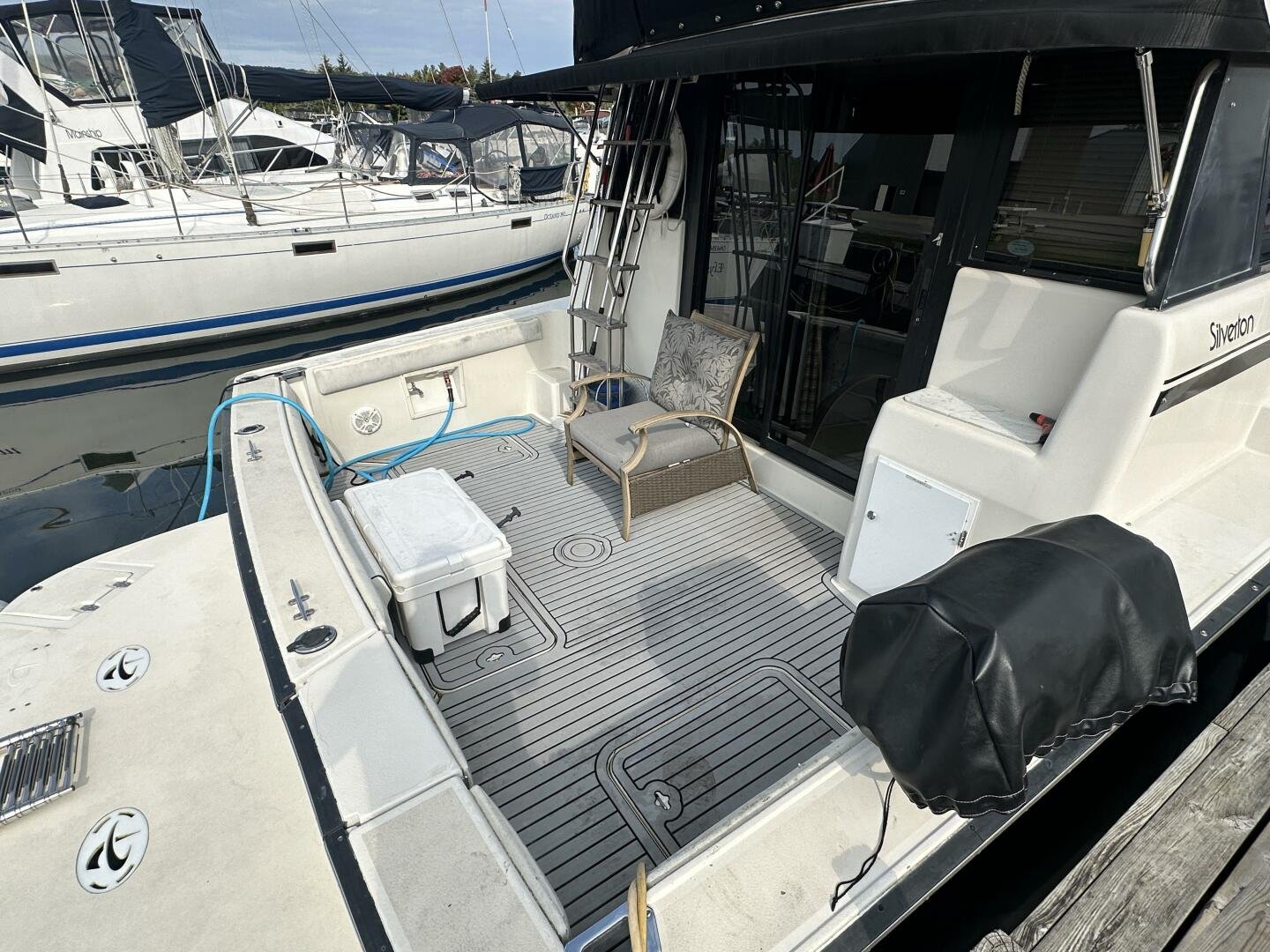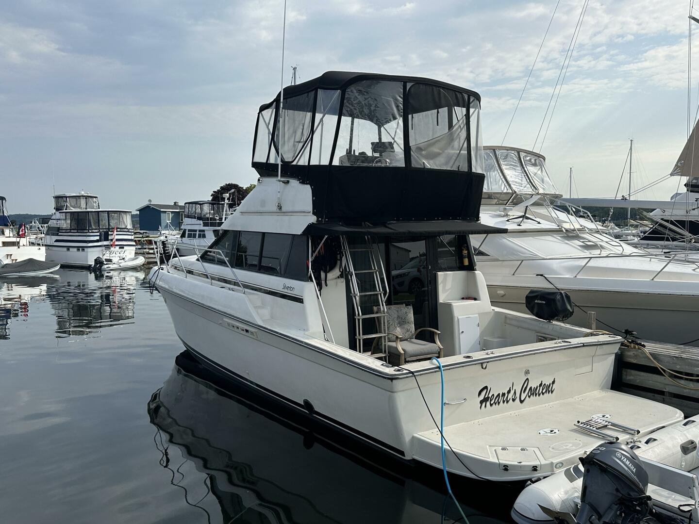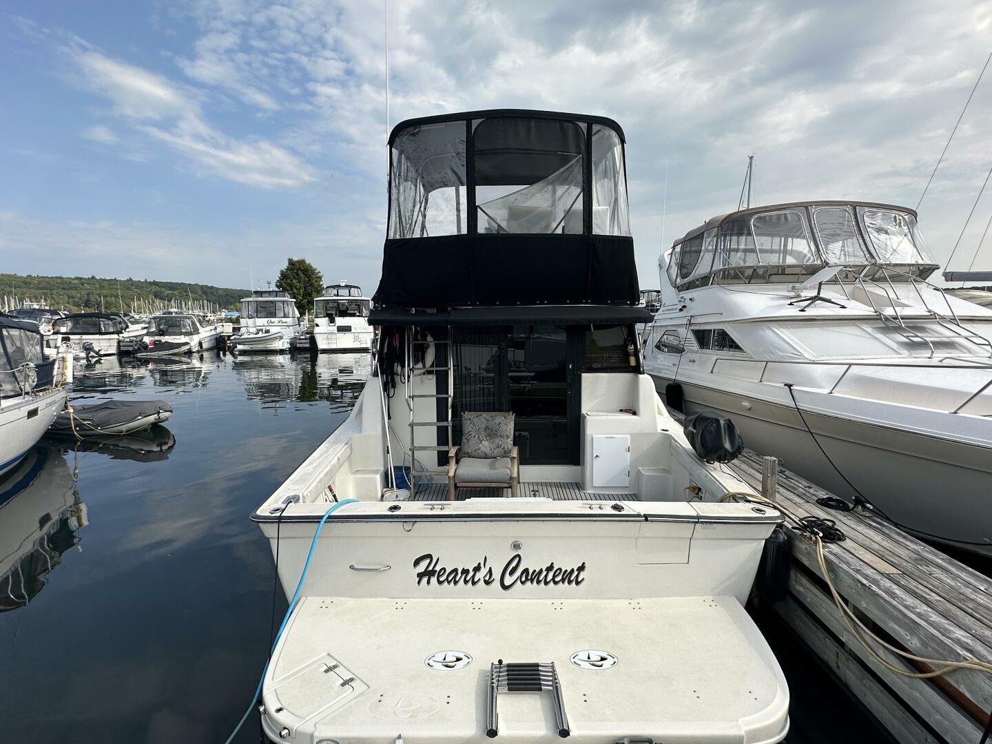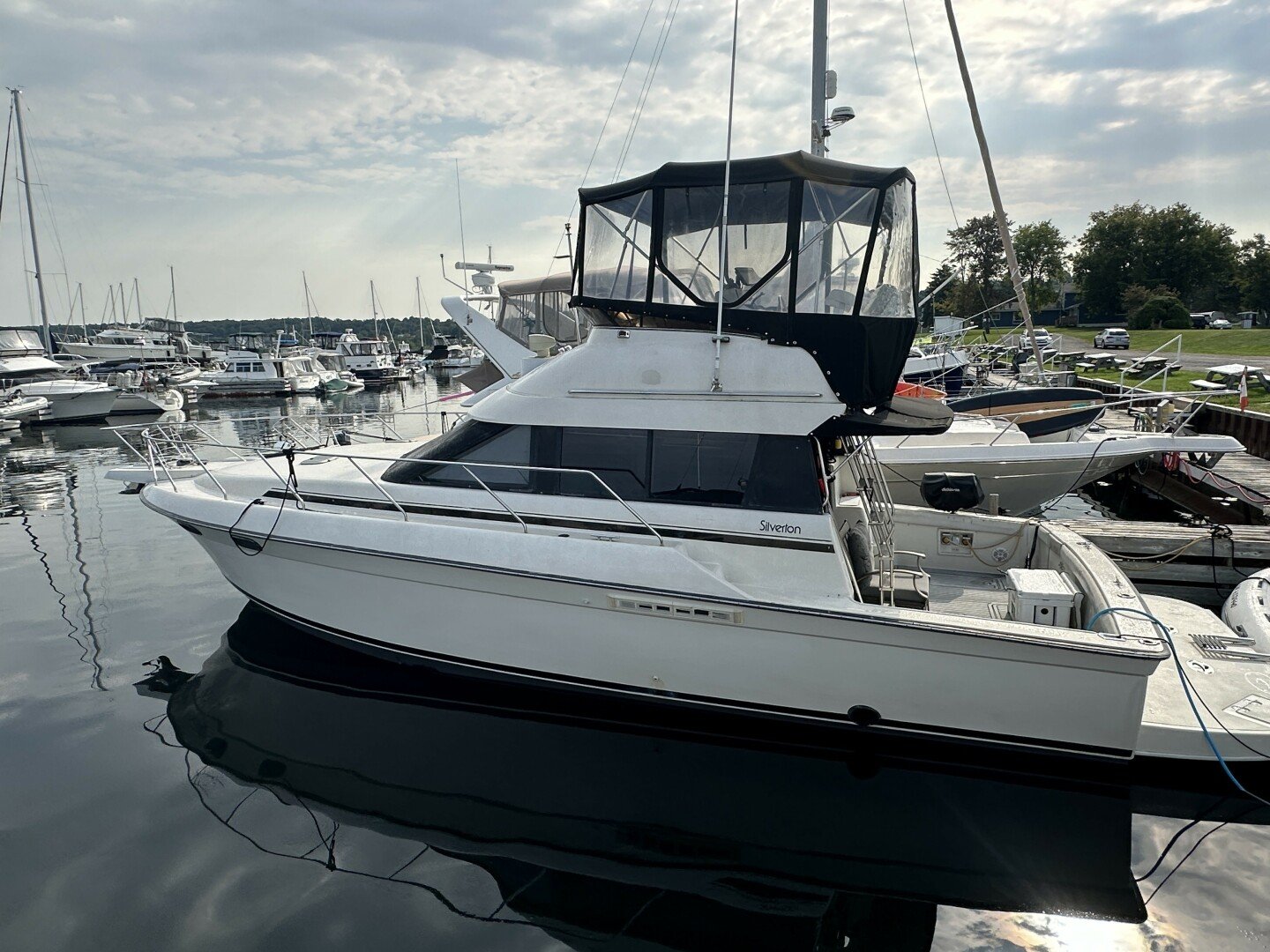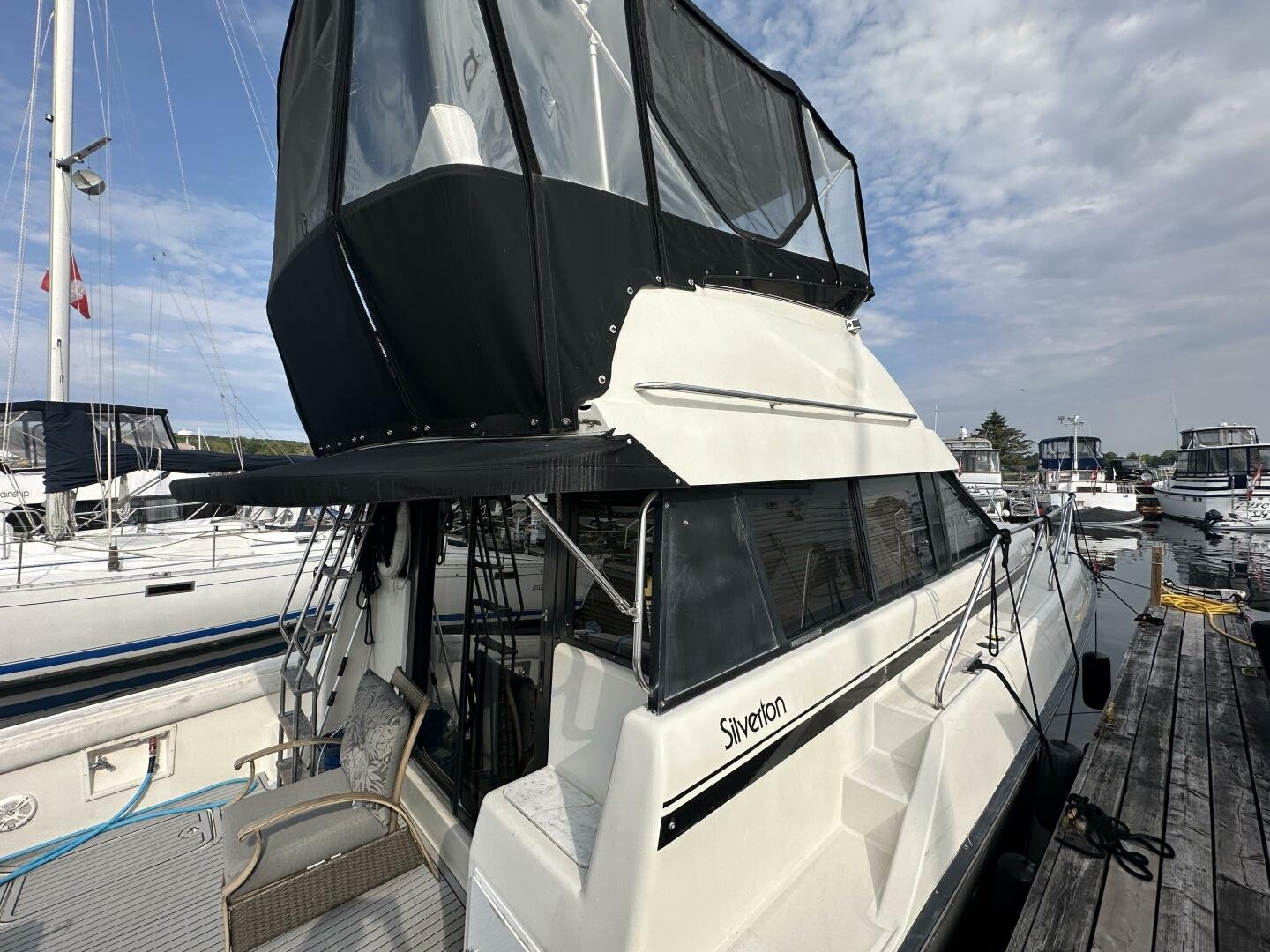 Currently located in the water at Beacon Bay Marina in Penetanguishene, the Silverton 37C offers an excellent layout for cruising or fishing. It features an 80 sq. ft. cockpit and a large extended swim platform. The vessel boasts a spacious single stateroom with a "galley-down" layout. The private forward stateroom includes a centerline queen berth and ensuite access to the head. The galley is conveniently situated next to the dinette on the lower cabin level for easy meal service. The bright and spacious salon includes a convertible sofa, lounge chair, and entertainment center. The bridge is equipped with upgraded Raymarine electronics and large bench seating, all within a full canvas enclosure. Call today to book your private showing.