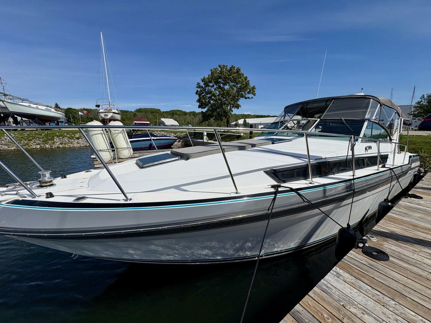 The Largest of the Formula PC (Performance Cruiser) fleet in the late 1980s, the 35 PC is a roomy family express cruiser. The PC's wide-open floorplan includes a superb U-shaped galley area-still among the best found in any express boat this size-and a step-down mid-cabin with facing settees that convert into a big double bed at night. There's a centerline island berth in the forward stateroom (with a draw curtain for night time privacy). The cockpit is arranged with a big L-shaped lounge opposite the helm and foldaway bench seating at the transom. Additional features include side-dumping exhausts, a transom door, bow pulpit, radar arch, and swim platform. Construction is solid fiberglass, and her deep-V hull is designed with prop pockets to reduce the draft. Accessed via a motorized hatch lift, twin 340hp MerCruiser 7.4L Bluewater engines (with V-drives) will cruise the Formula 35 PC at 21-22 knots and reach a top speed of around 30 knots.