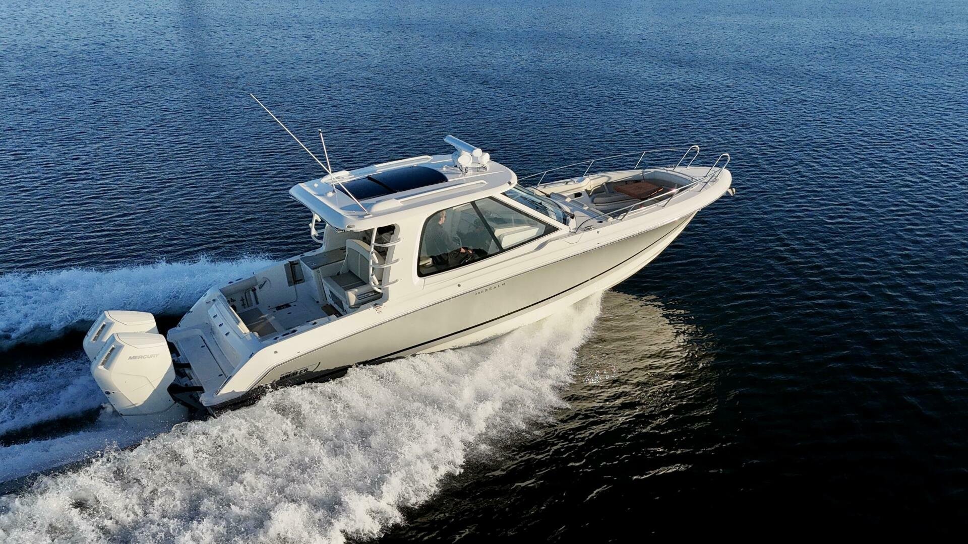 At nearly 40 feet, the 380 Realm express cabin cruiser is a sleek and powerful offshore boat that synthesizes sumptuous comfort amenities, advanced power and performance, and a peerless fishing experience. The commanding center console layout provides seamless Simrad® integration with all navigation and power functions, and the customizable aft deck is ideal for angling or entertaining. Below deck, you’ll find a stunningly appointed cabin with refined and relaxing features that make short or long stays on the water transformative. Explore the many benefits of this 38-ft. express cruiser boat today, and finally make your grandest boating dreams real.