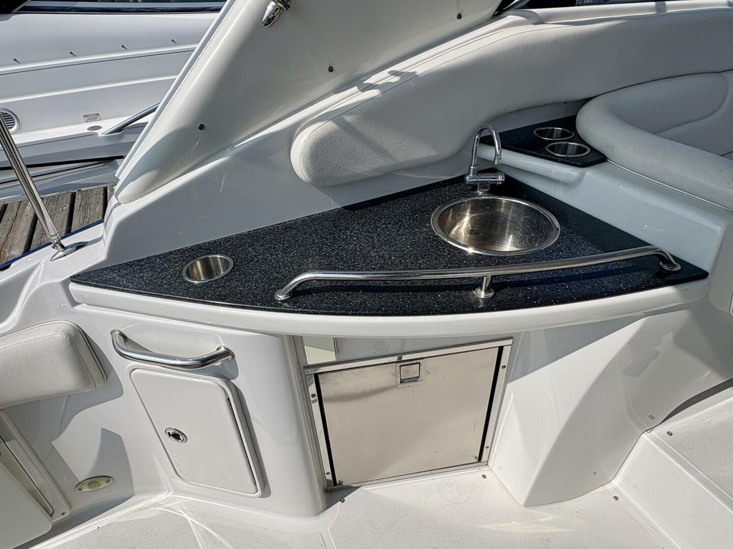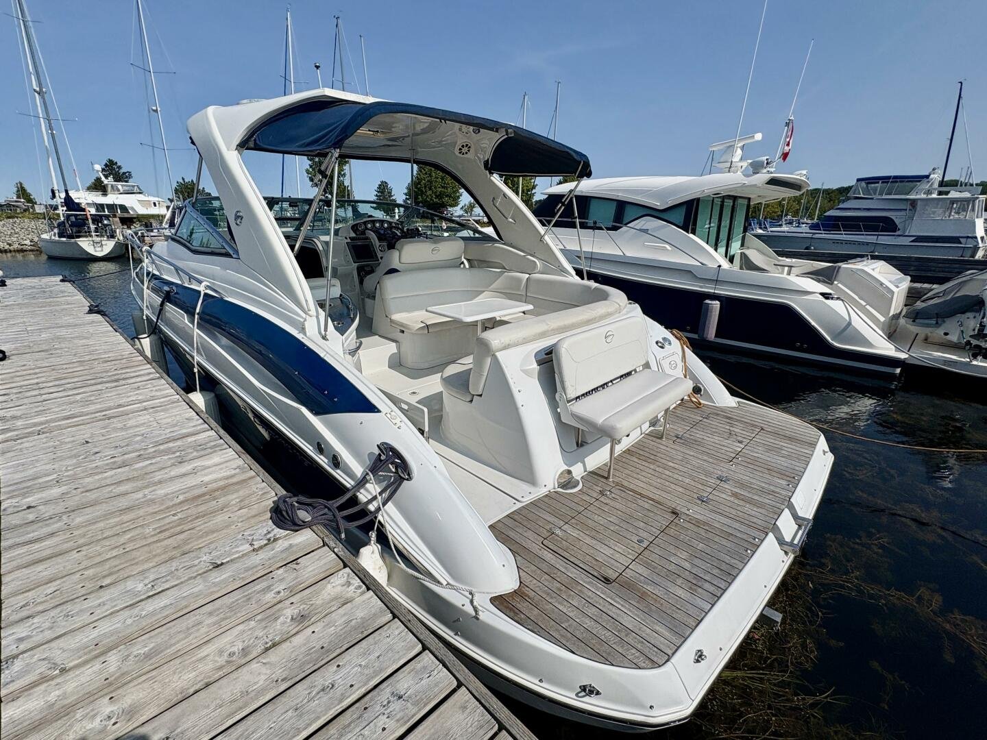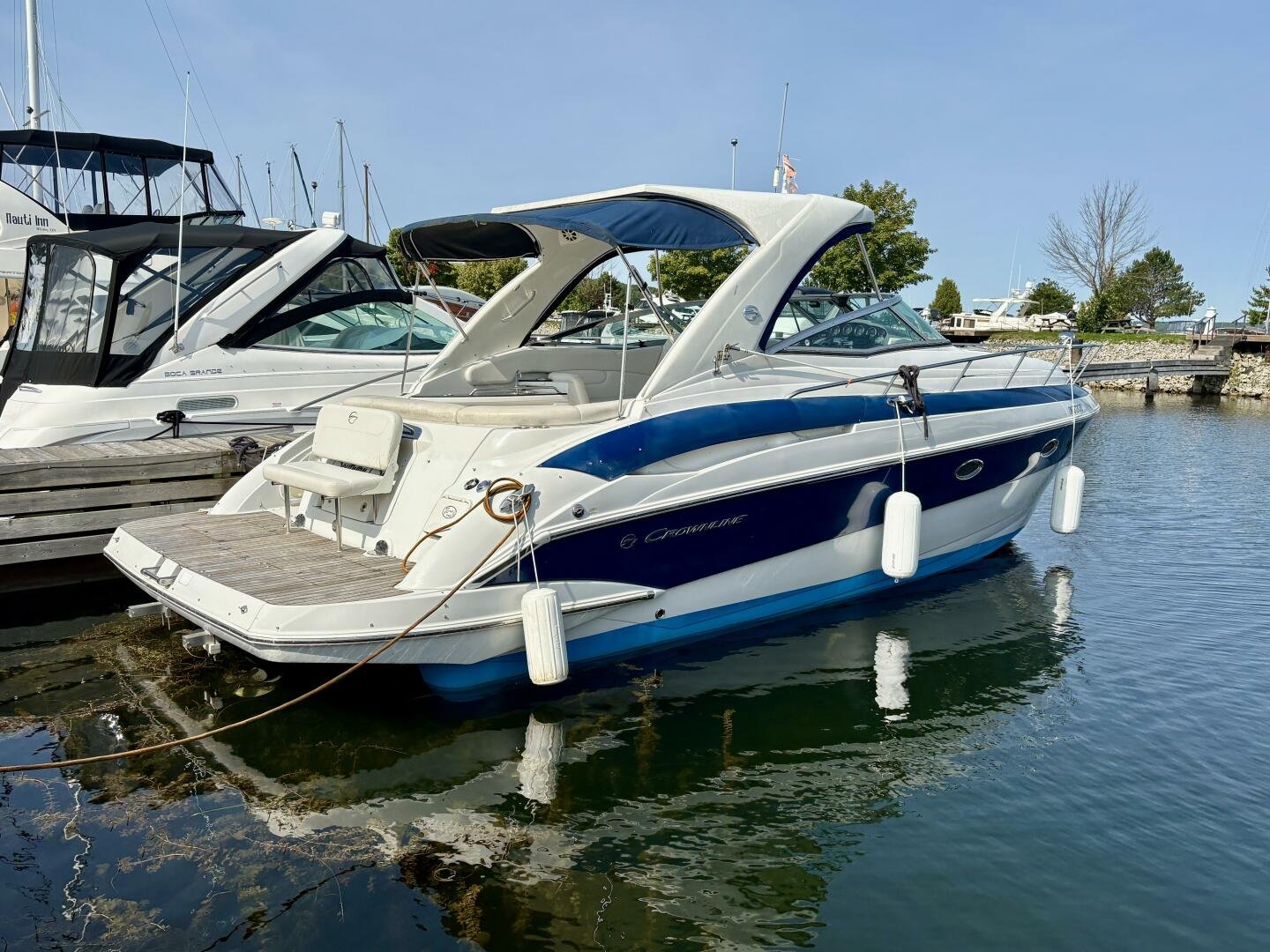 This 2007 Crownline 340 CR features gorgeous navy blue gel coat, only 527 hours on twin 320hp MerCruiser MX 6.2 MPI Horizon engines, Bravo III drives paired with MerCruiser DTS (digital, throttle and shift control). Electronics include a large Raymarine E120 plotter and a new Garmin 7” touchscreen unit. Additional highlights include the standard full hard top, large molded-in teak swim platform, Kicker speakers with Sony stereo, wet bar and stainless cockpit fridge, along with a removable transom rumble seat.