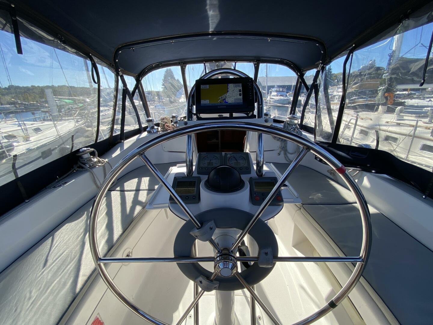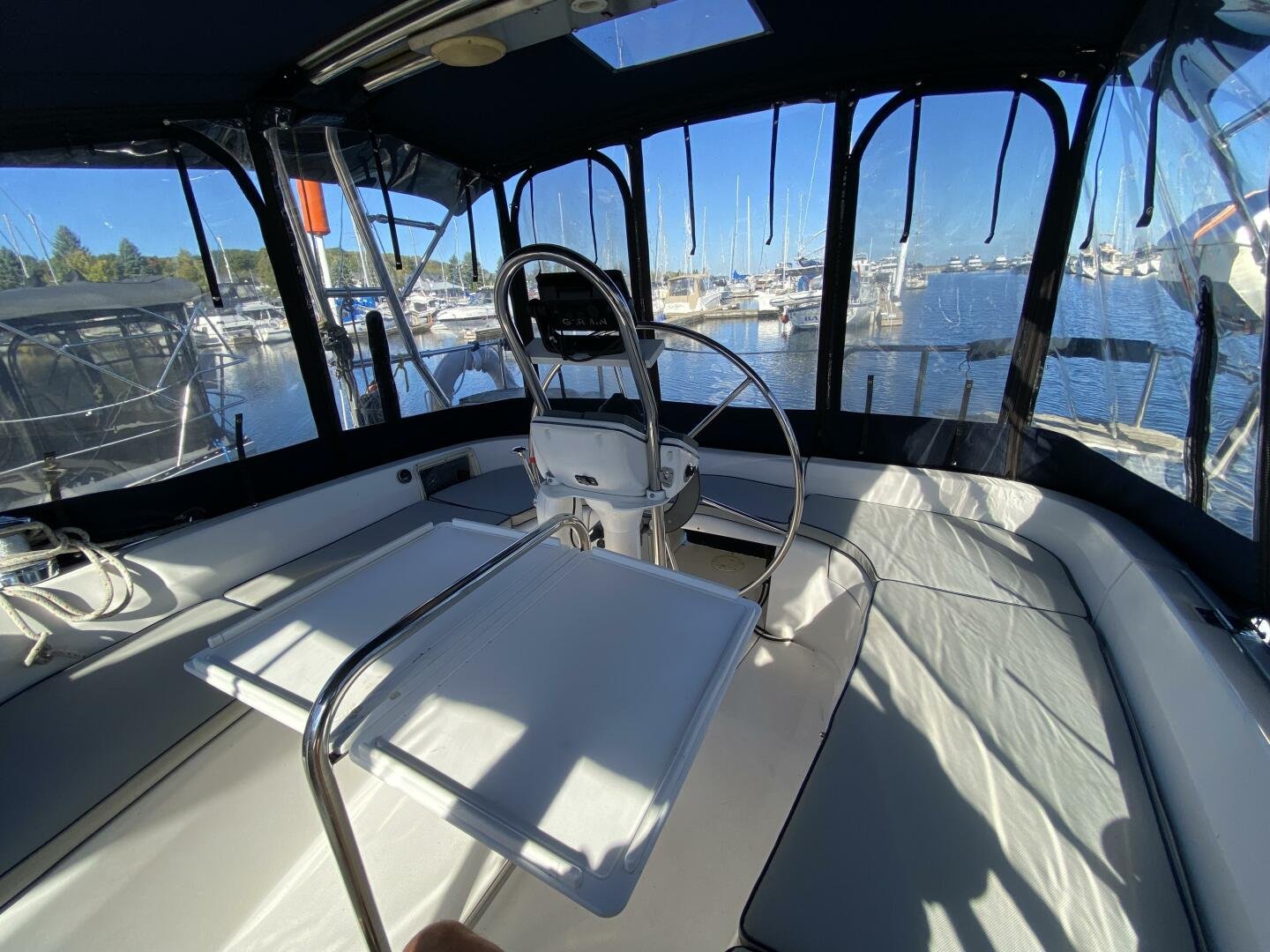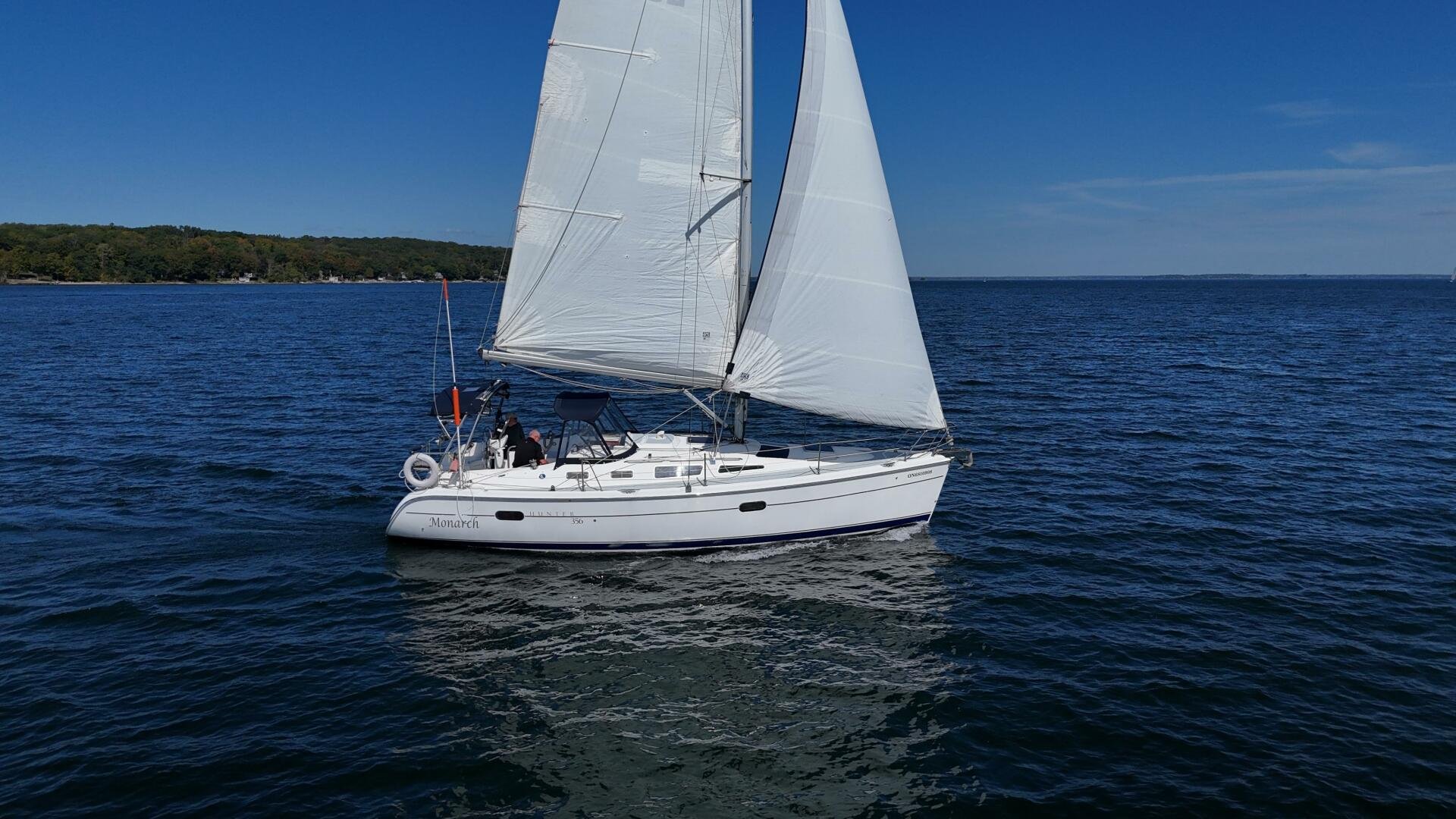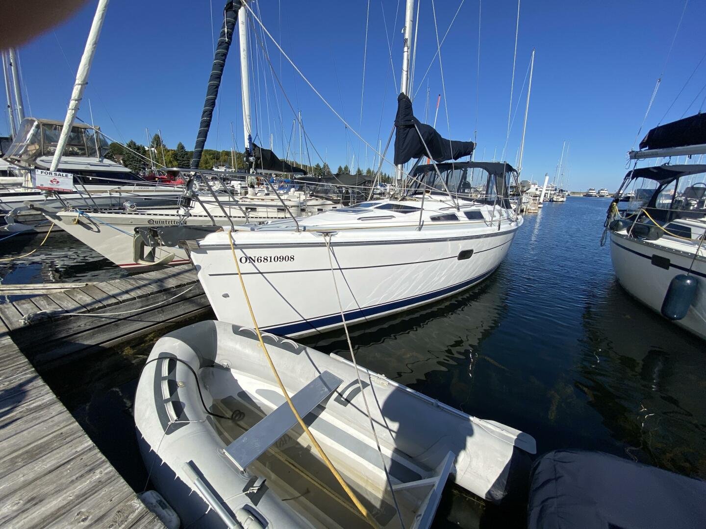 NEW FULL ENCLOSURE, COCKPIT CUSHIONS, LARGE AFT CABIN, GARMIN CHART PLOTTER, 2019 DINGY, SHOAL DRAFT, READY TO CRUISE. This 2003 Hunter 356 is a 35′6″ cruising sailboat with a 12′ beam and 5' draft. It also features Hunters proven fractional “B&R” style rig for easier sail handling. Below deck you’ll find comfortable accommodations for family or guests: with two private cabins, a convertible salon berth, full galley, and decent tankage for extended weekends or cruising. On deck, the layout emphasizes ease: all control lines led aft, a spacious cockpit, and a walk‑through transom with swim platform make it a friendly boat for cruising, sailing, and just relaxing at anchor or at the dock. In short: The Hunter 356 offers a strong blend of comfort, ease of handling, and cruising capability.