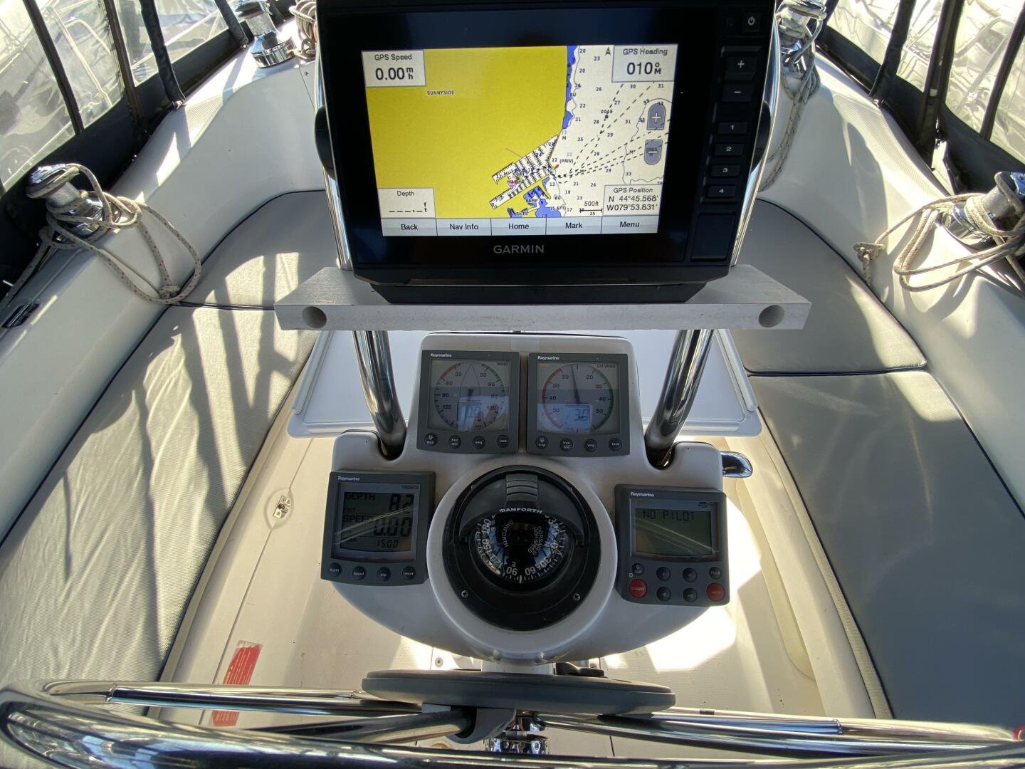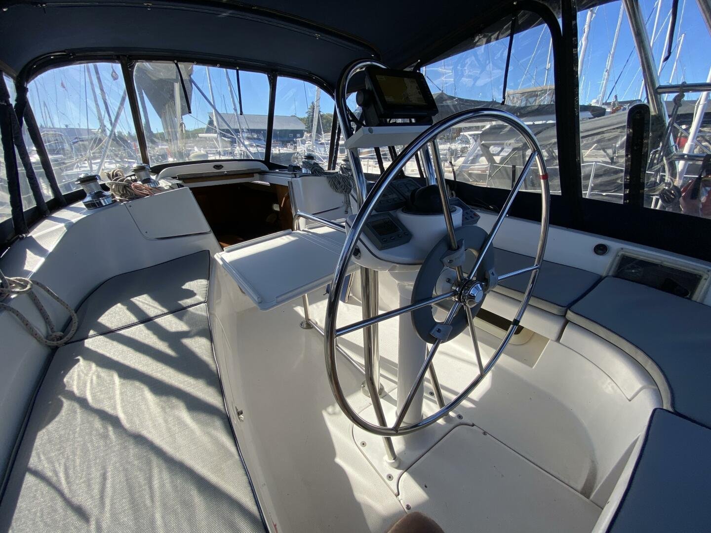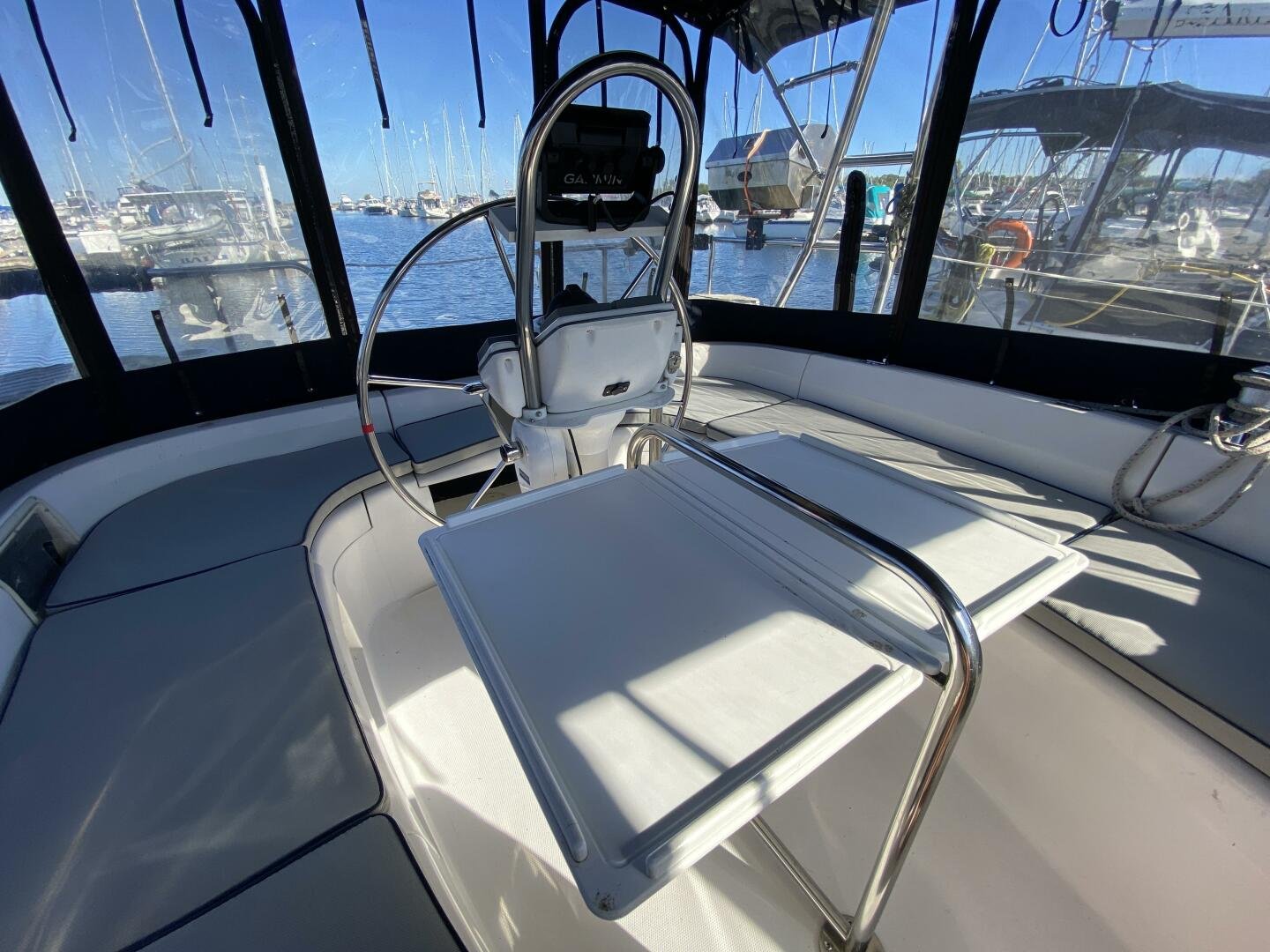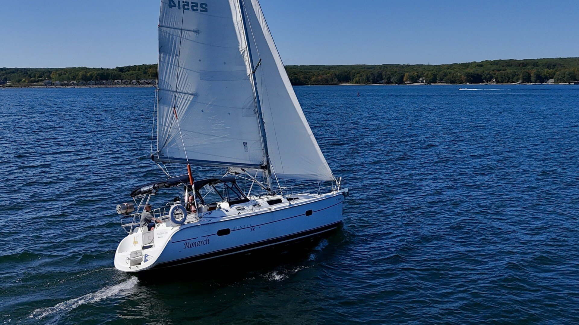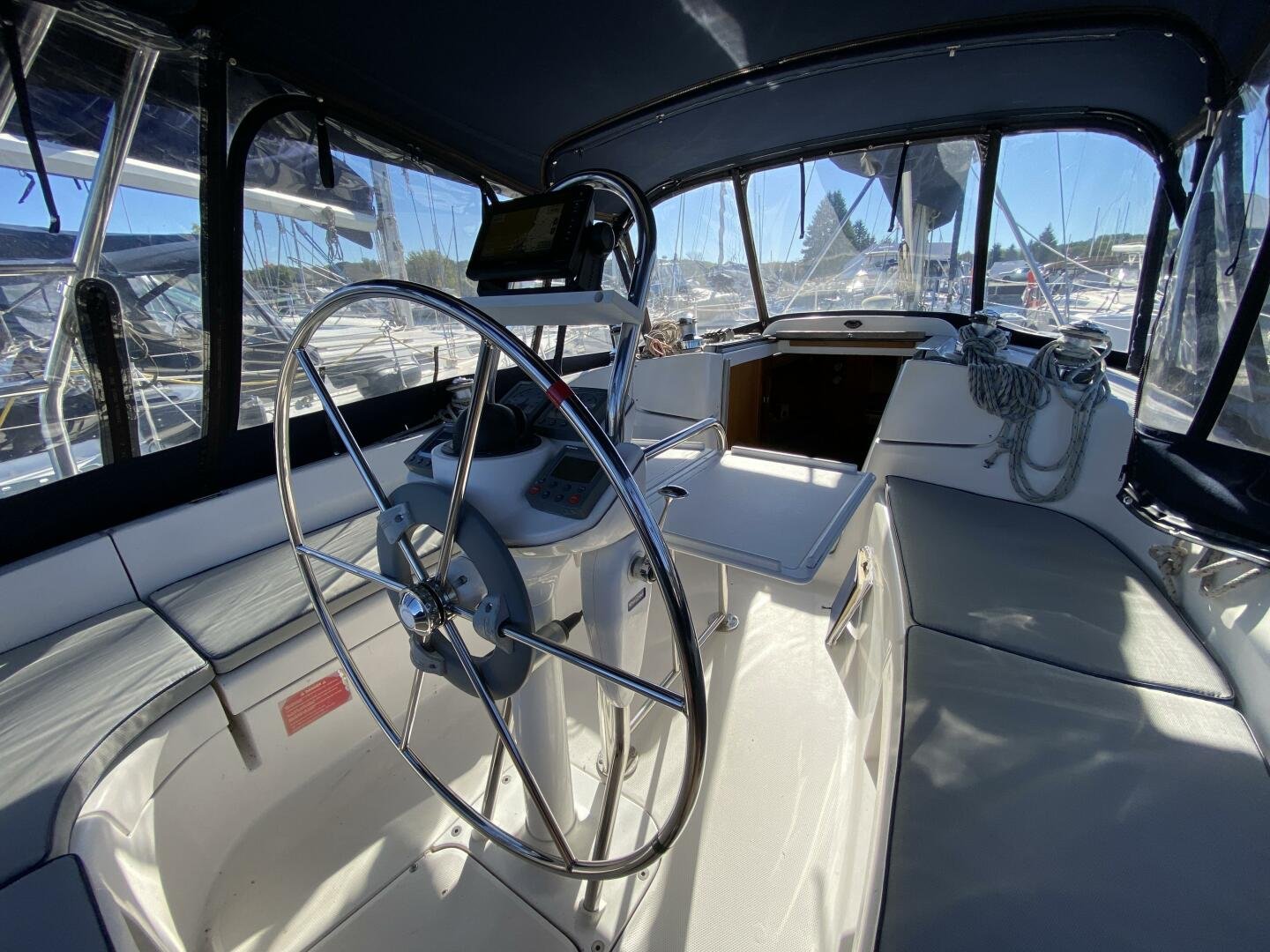 NEW FULL ENCLOSURE, COCKPIT CUSHIONS, LARGE AFT CABIN, GARMIN CHART PLOTTER, 2019 DINGY, SHOAL DRAFT, READY TO CRUISE. This 2003 Hunter 356 is a 35′6″ cruising sailboat with a 12′ beam and 5' draft. It also features Hunters proven fractional “B&R” style rig for easier sail handling. Below deck you’ll find comfortable accommodations for family or guests: with two private cabins, a convertible salon berth, full galley, and decent tankage for extended weekends or cruising. On deck, the layout emphasizes ease: all control lines led aft, a spacious cockpit, and a walk‑through transom with swim platform make it a friendly boat for cruising, sailing, and just relaxing at anchor or at the dock. In short: The Hunter 356 offers a strong blend of comfort, ease of handling, and cruising capability.