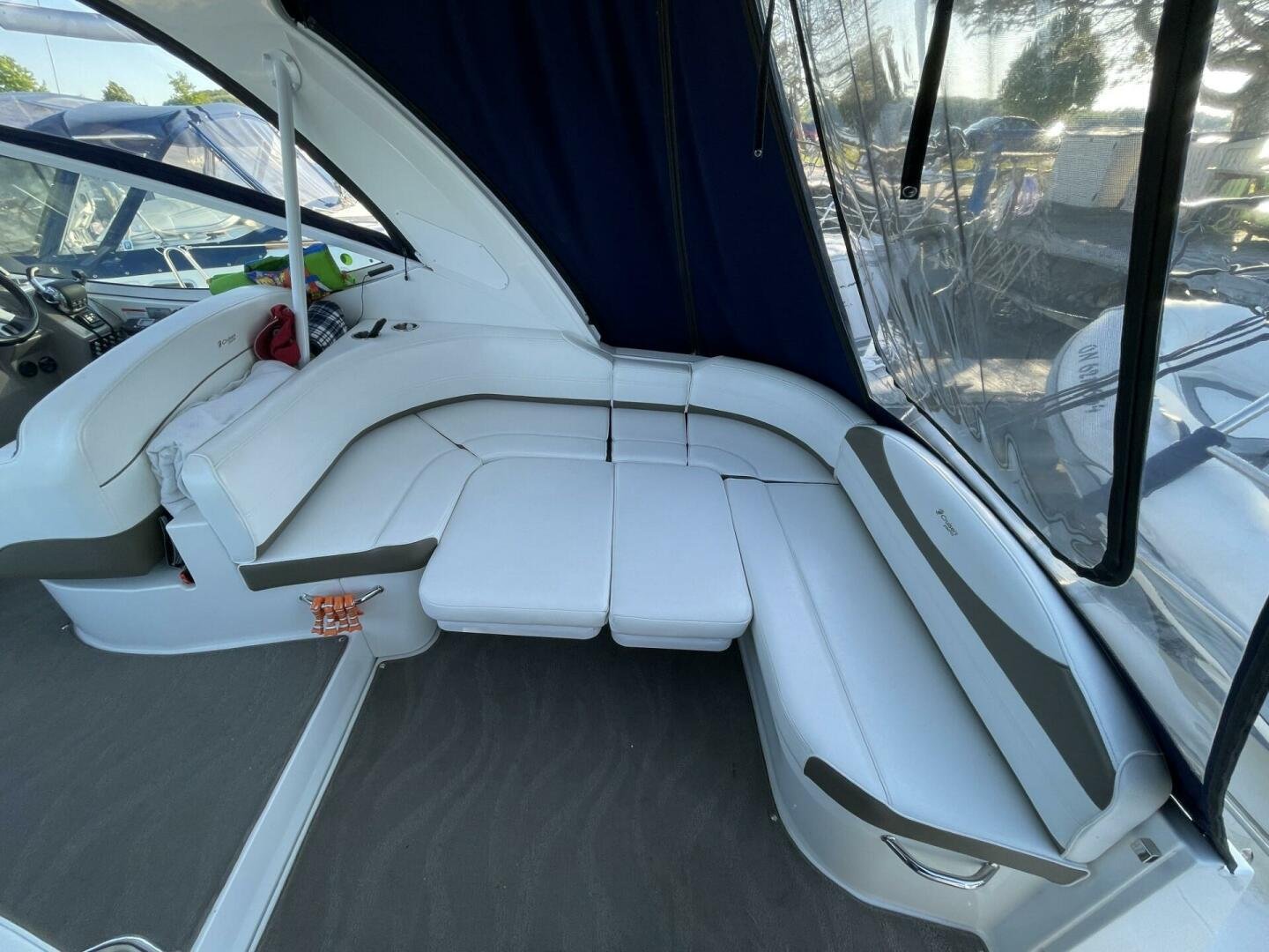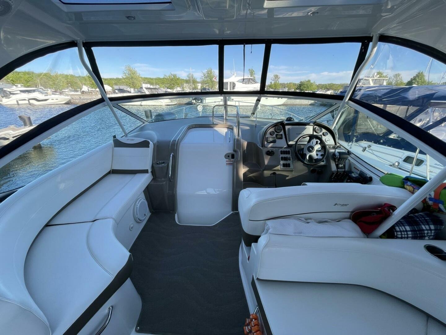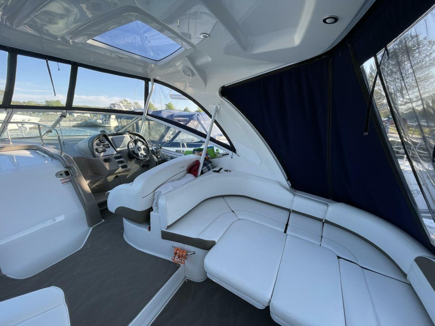 The 2012 Cruisers 350 Express is a striking blend of sporty styling and luxurious comfort. Designed with space efficiency in mind, her open-plan interior is bathed in natural light thanks to six vertical portlights and features rich cherrywood trim, faux granite countertops, and elegant upholstery.