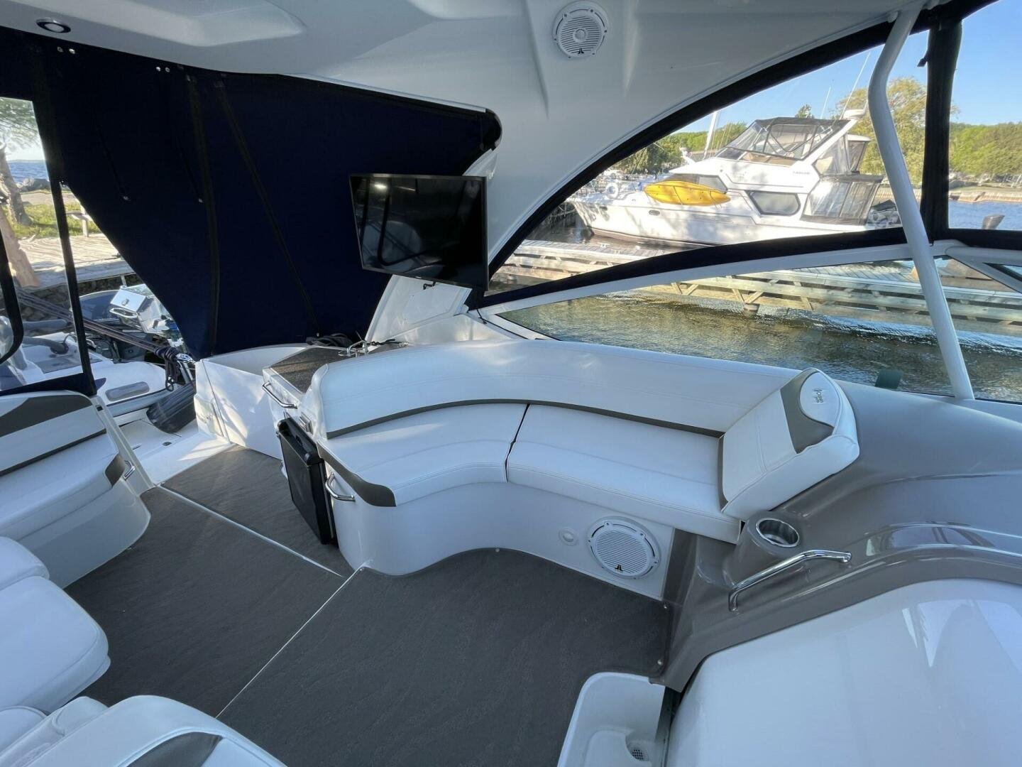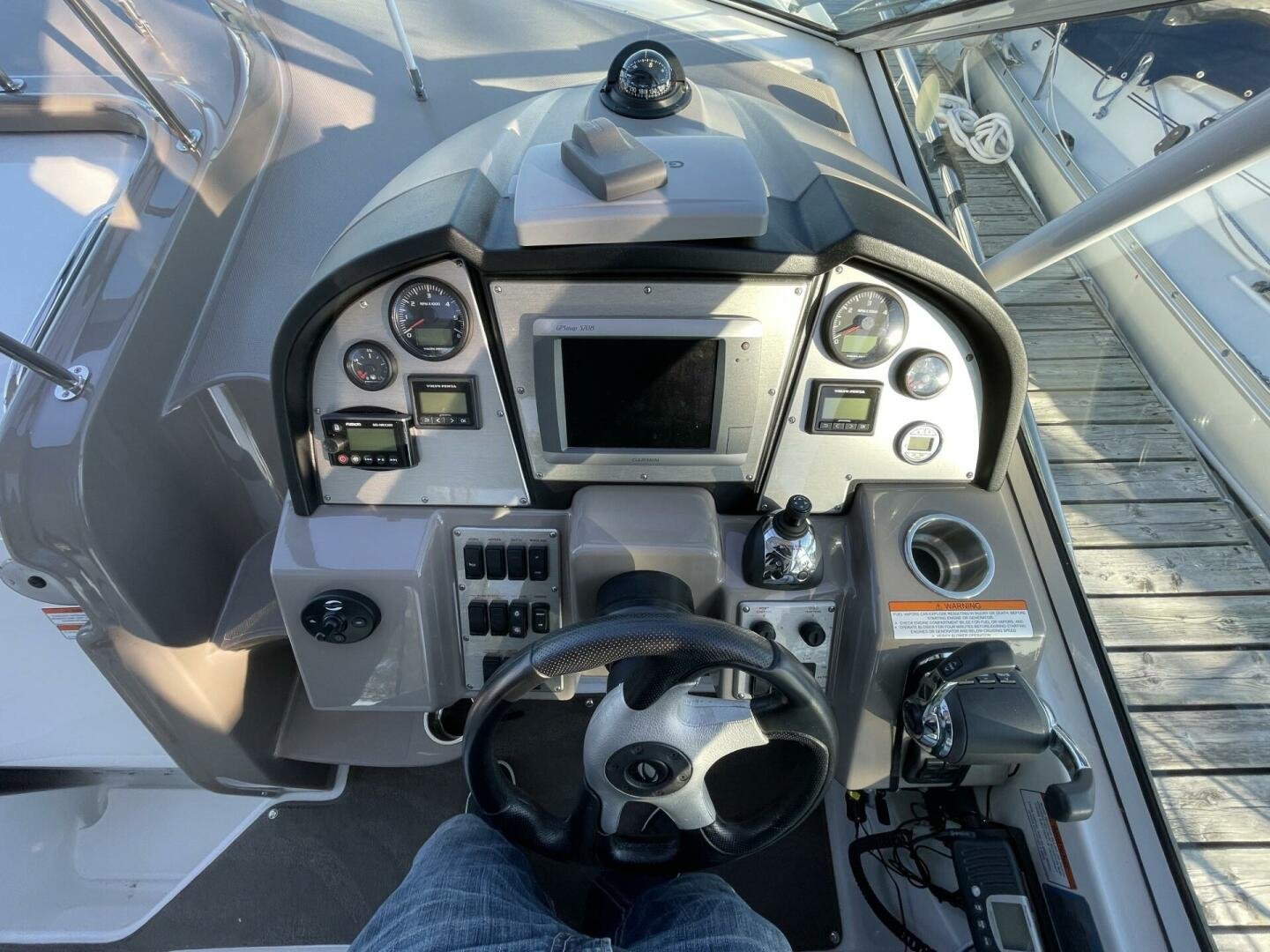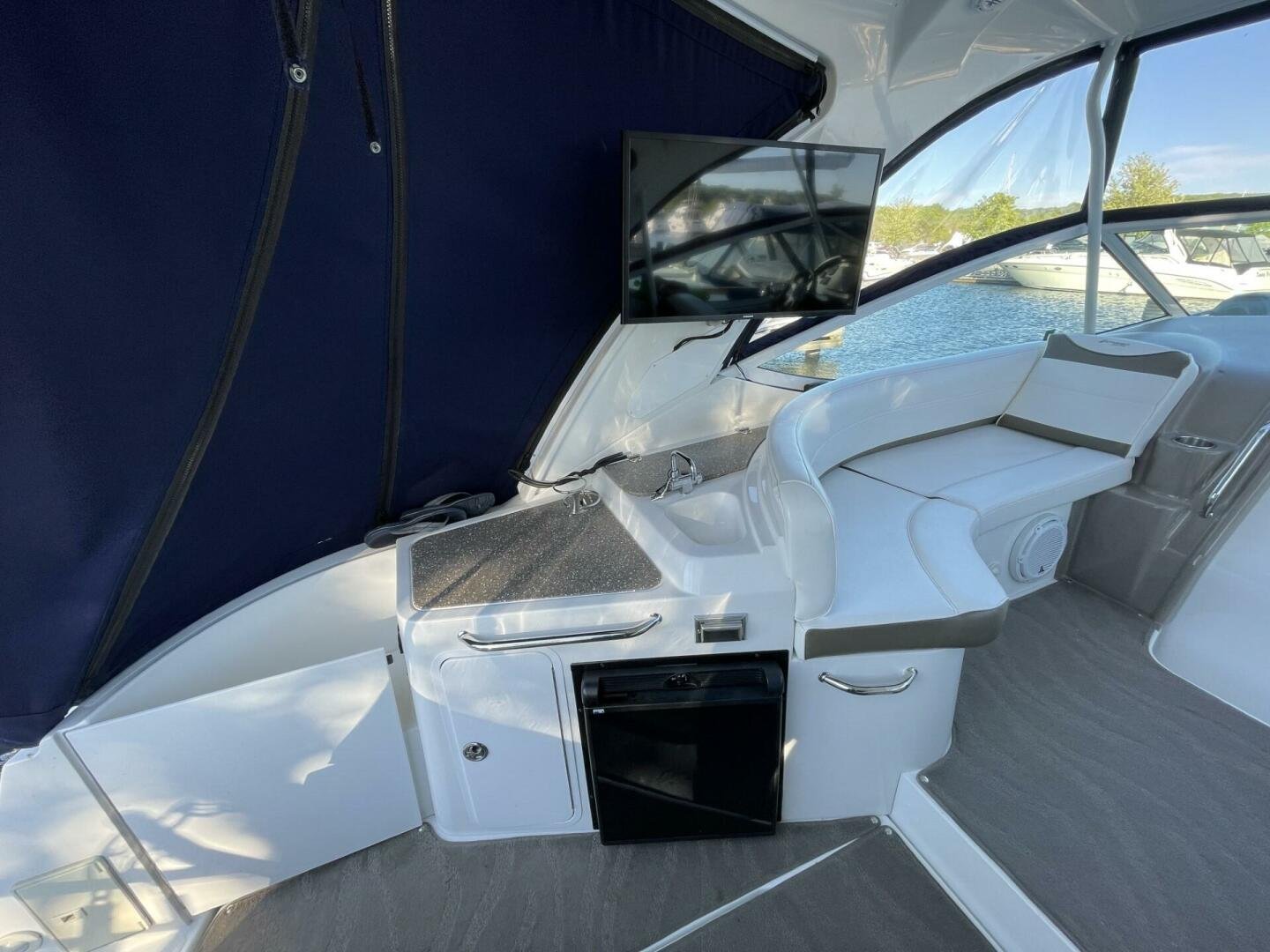 The 2012 Cruisers 350 Express is a striking blend of sporty styling and luxurious comfort. Designed with space efficiency in mind, her open-plan interior is bathed in natural light thanks to six vertical portlights and features rich cherrywood trim, faux granite countertops, and elegant upholstery.