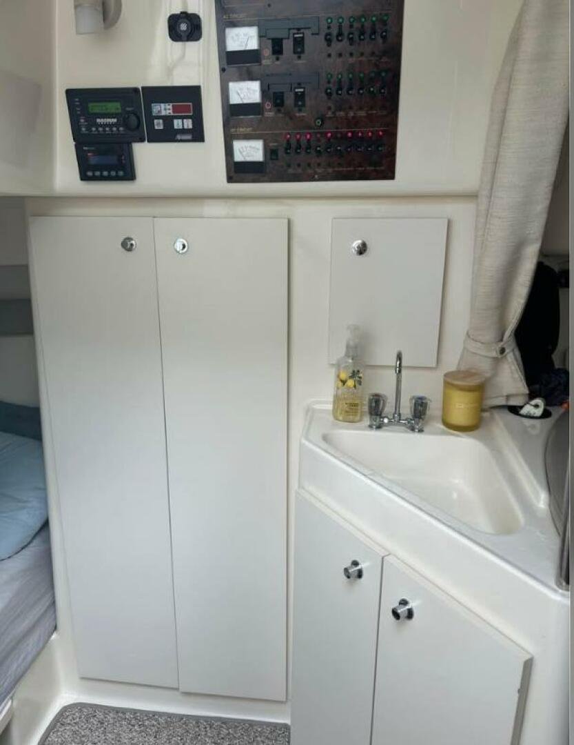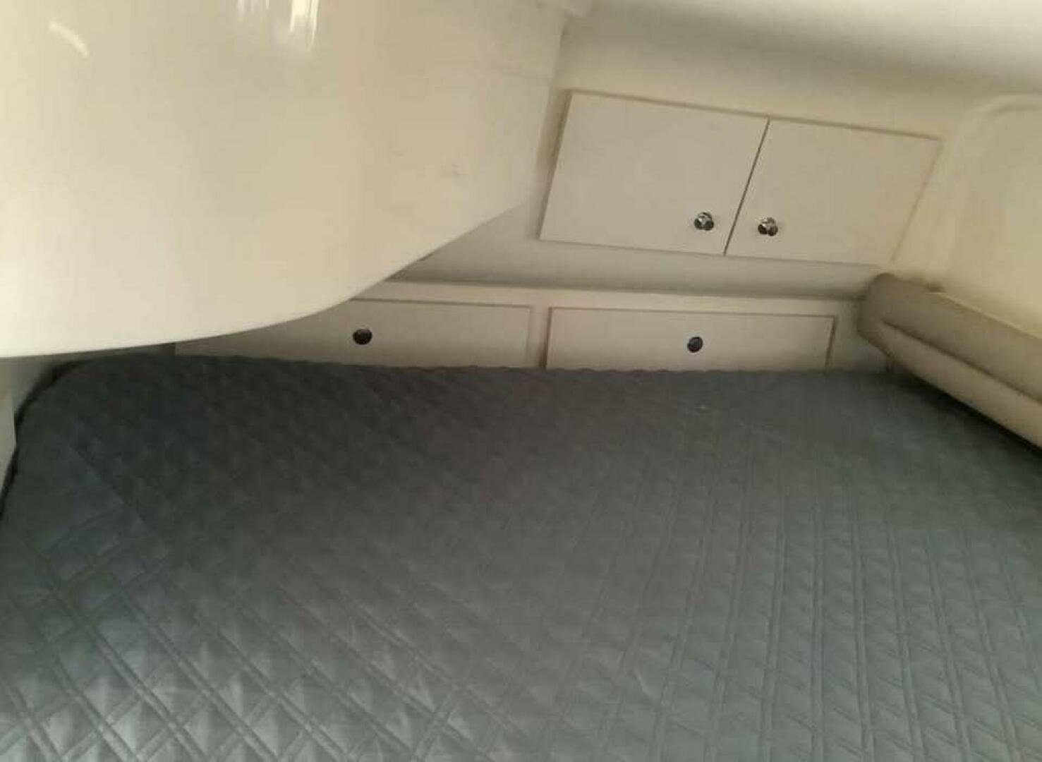 Aft stateroom features a queen size bed with newer foam mattress sink and closet