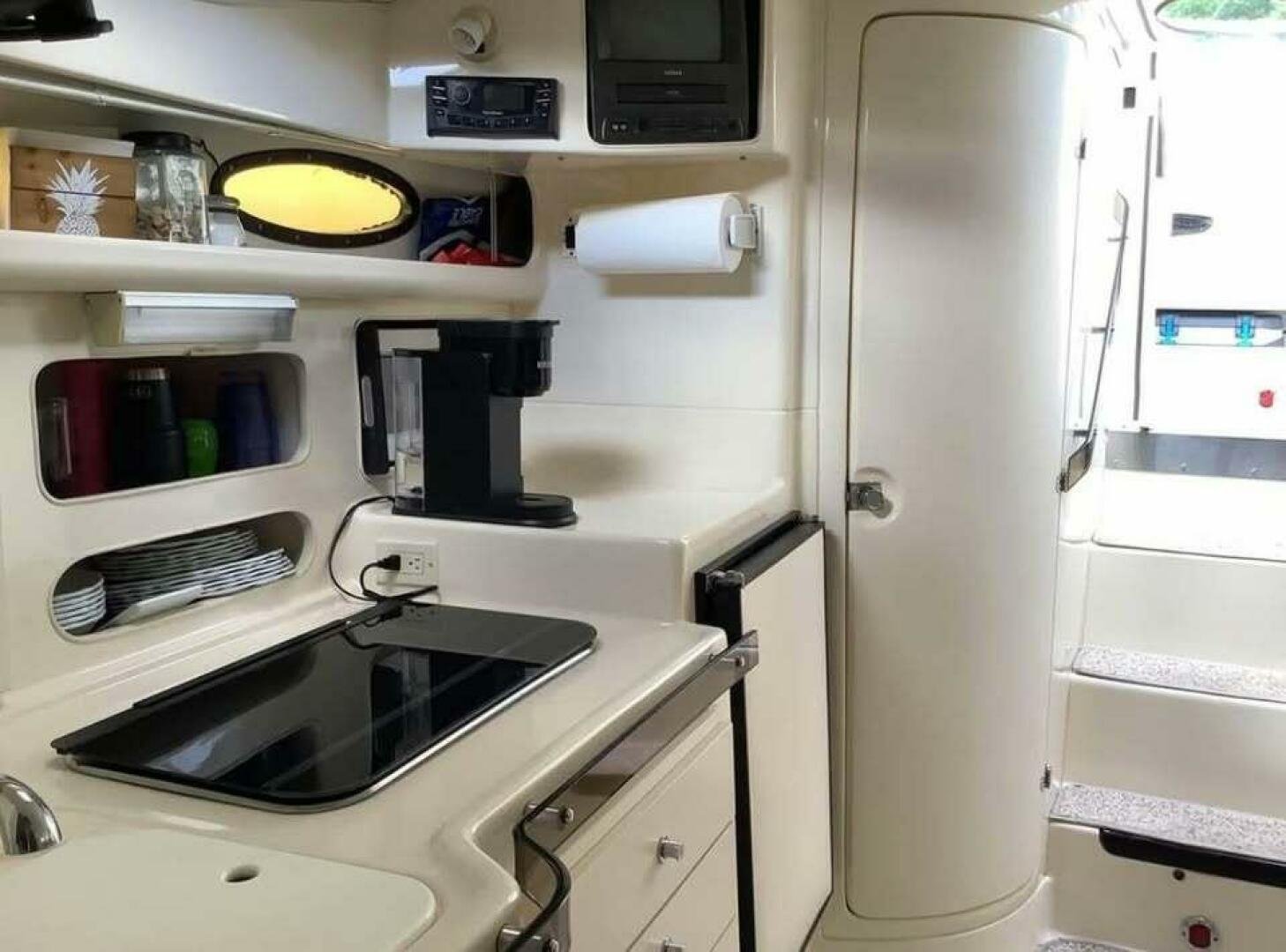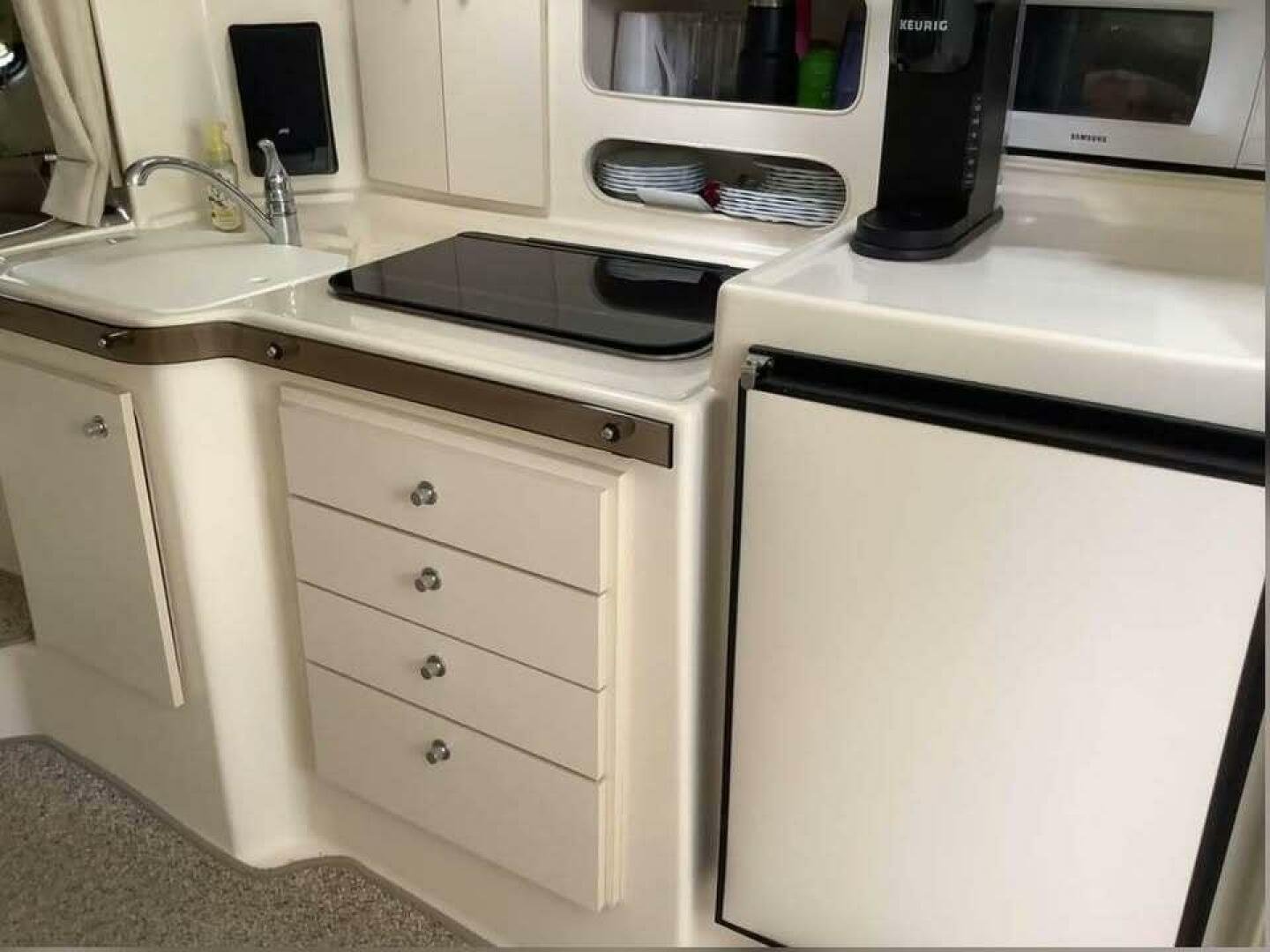 Good size galley with fridge freezer, 2 burner electric stove and microwave