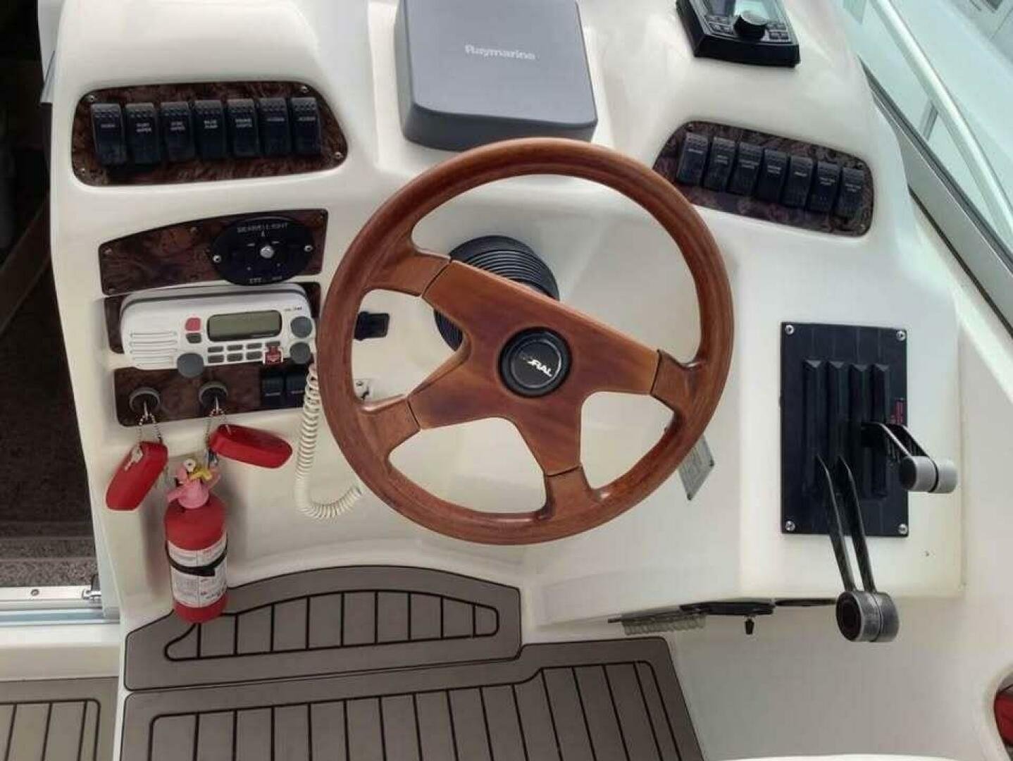 a notably stylish helm with a wood-grain steering wheel and