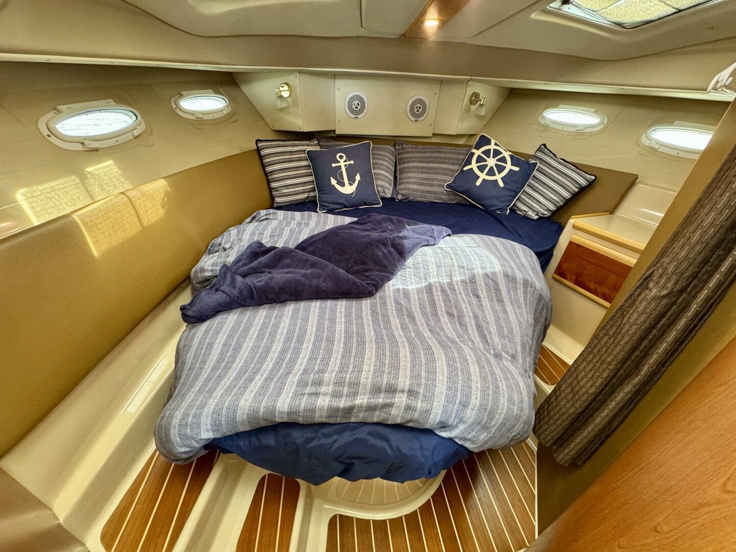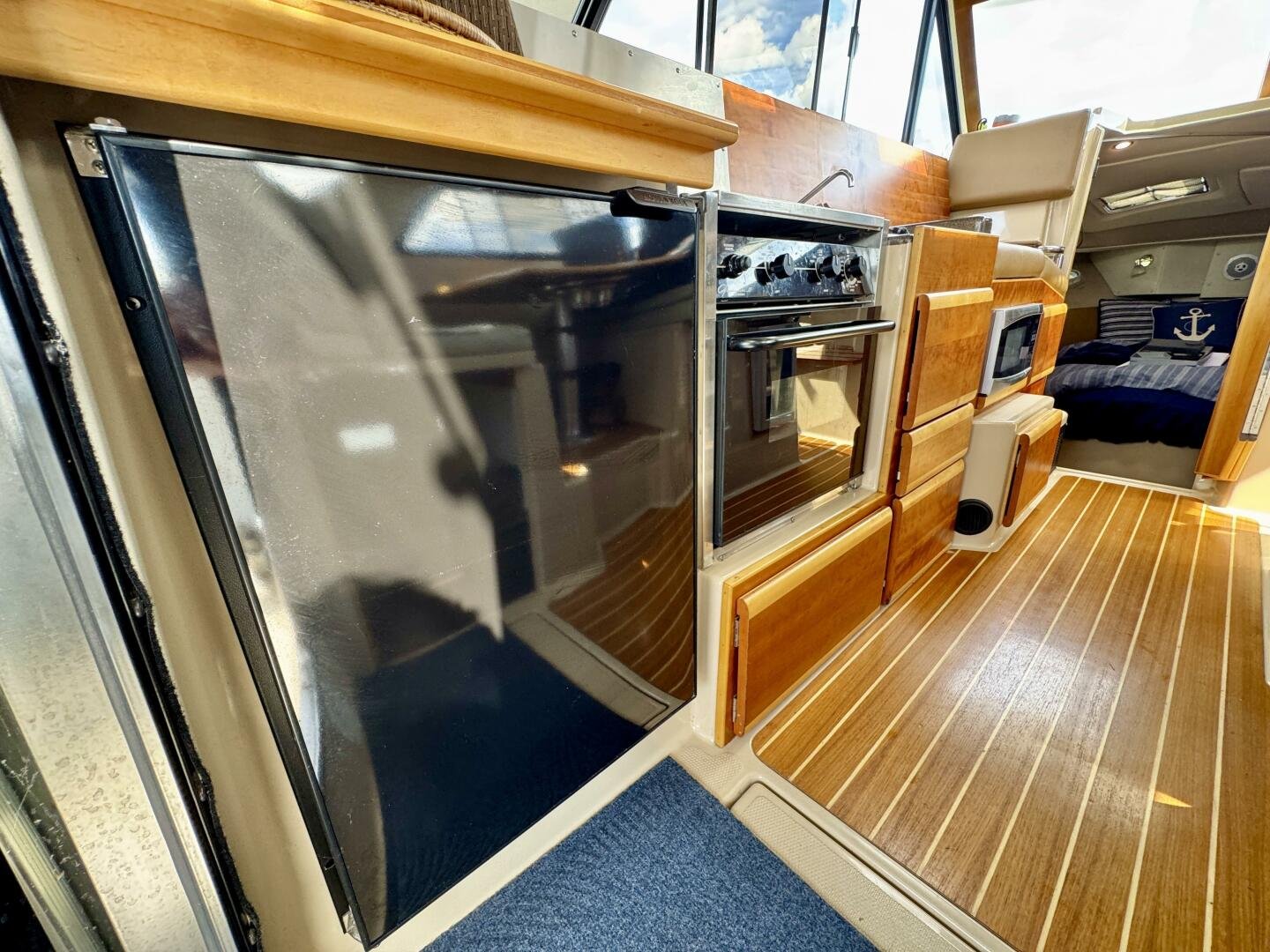 An expanse of opening windows brightens the roomy main-deck salon. Here, a four-place dinette converts to a double berth, and features a beautifully finished custom maple pedestal table with integral beverage holders and grab rail. A European-style galley counter with under-counter fridge spans the full length of the salon’s port side, and opens for access to a double stainless-steel sink and electric cooktop, and to a contoured aft-facing lounge. Just opposite is the fully instrumented helm station featuring a handsome double-stitched ultraleather console and double-wide helm seat. Beneath the raised dinette is a private guest cabin with gear storage, reading lamp, two hullside portlights and a 6’ 8” double berth.