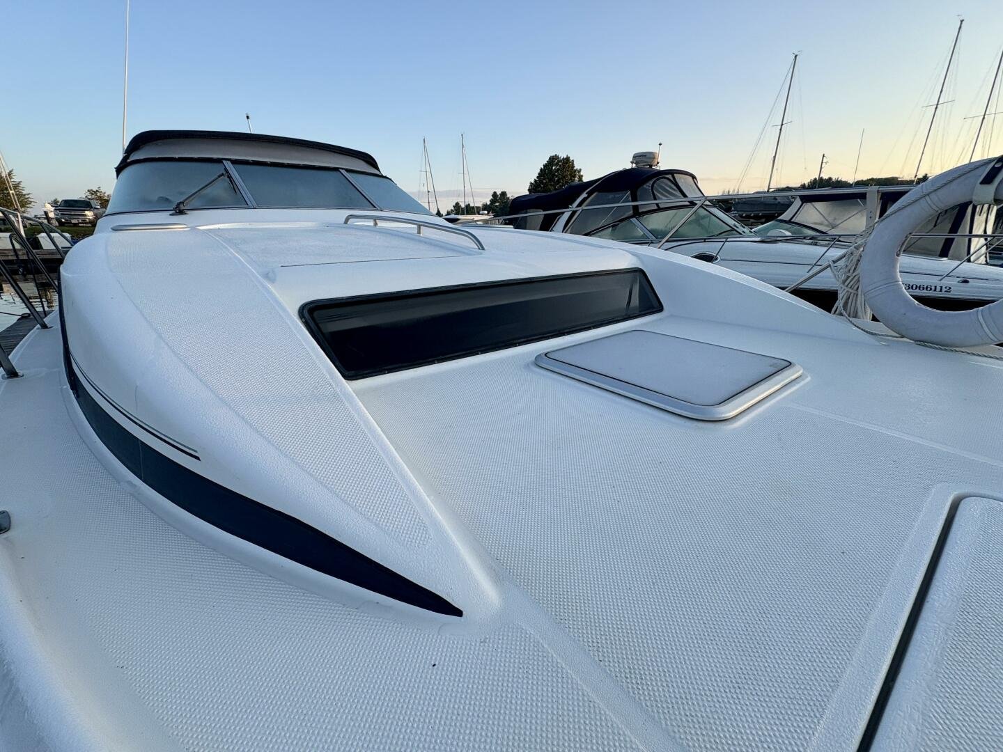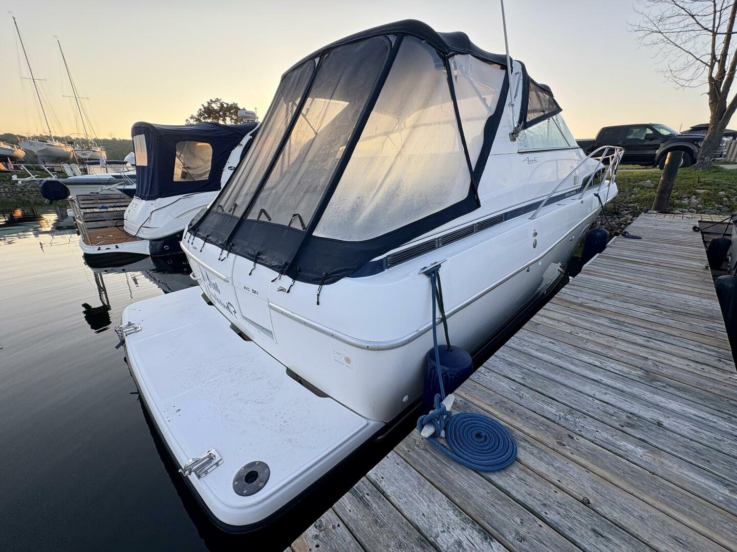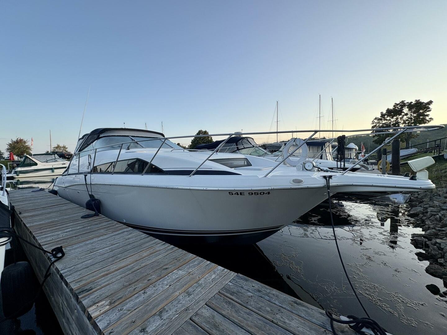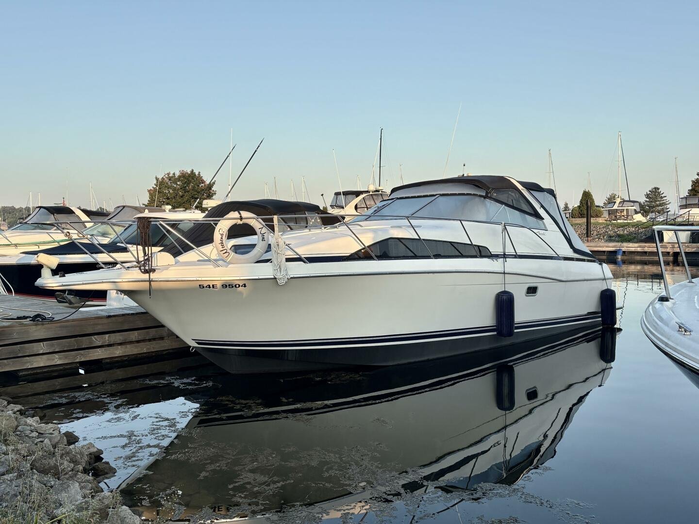 The Bayliner 3255 Avanti Sunbridge is a conservative family express cruiser offered at an affordable price, known for its generous cabin accommodations and large windows that create an open, airy feeling. Built on a lightweight solid fiberglass hull with a wide beam, the 3255’s signature styling feature is its reverse arch. The mid-cabin floorplan is arranged conventionally with double berths fore and aft, a full galley, enclosed head with shower, convertible dinette, and a good-size hanging locker in both the salon and mid-cabin. An accordion pocket door separates the forward stateroom from the salon for added privacy. On deck, a U-shaped settee with removable table sits opposite the helm in the bi-level cockpit. Additional features include a cockpit wet bar, transom door, integral bow pulpit, swim platform, and twin foredeck sun pads.