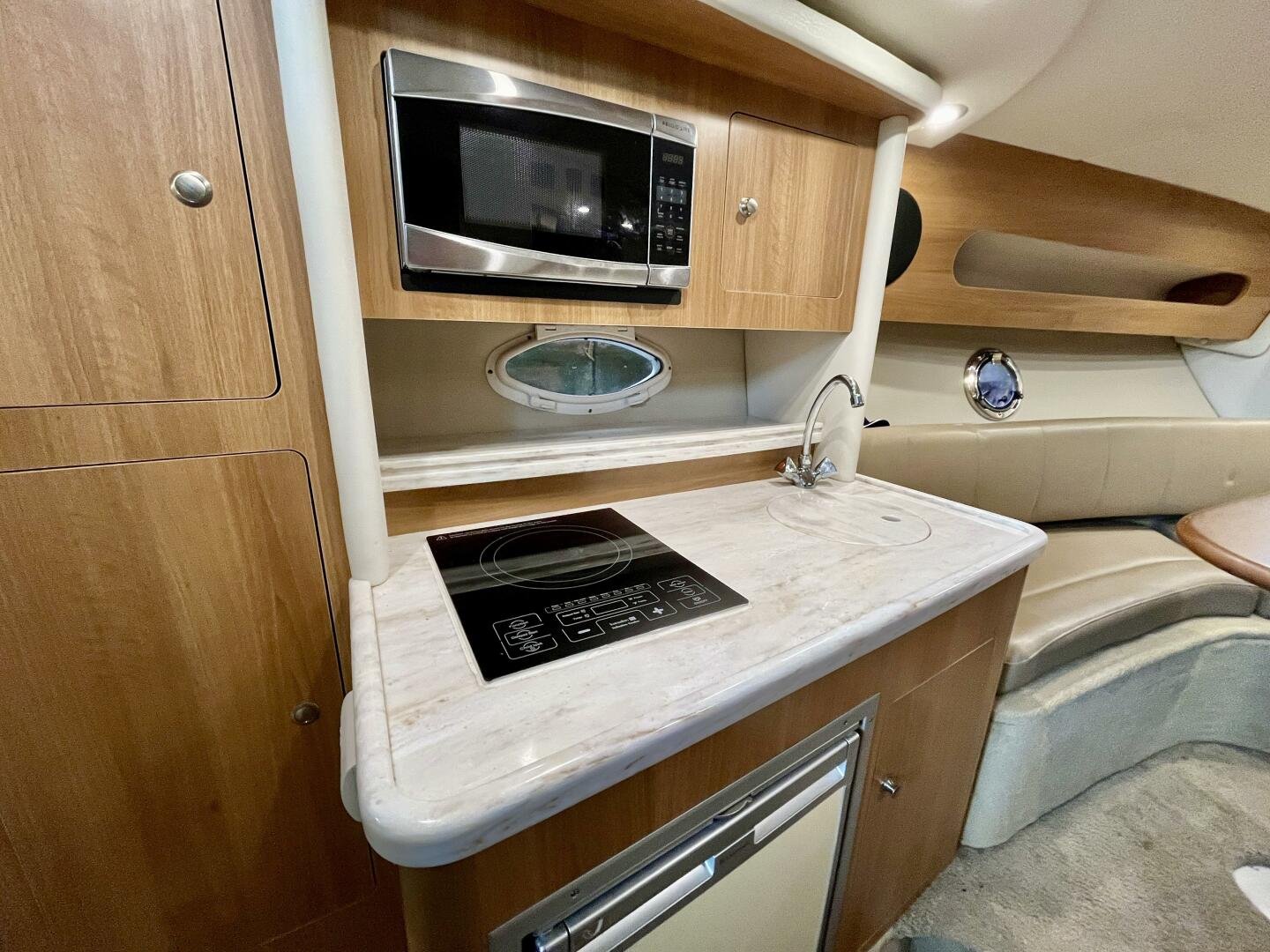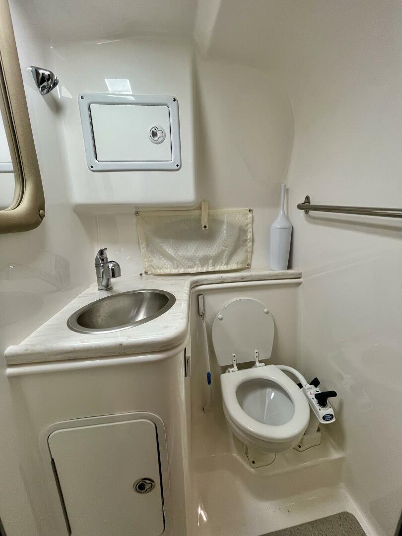 - Full Galley: Equipped with solid surface countertops, complemented by a well-appointed head with toilet, sink, and shower.