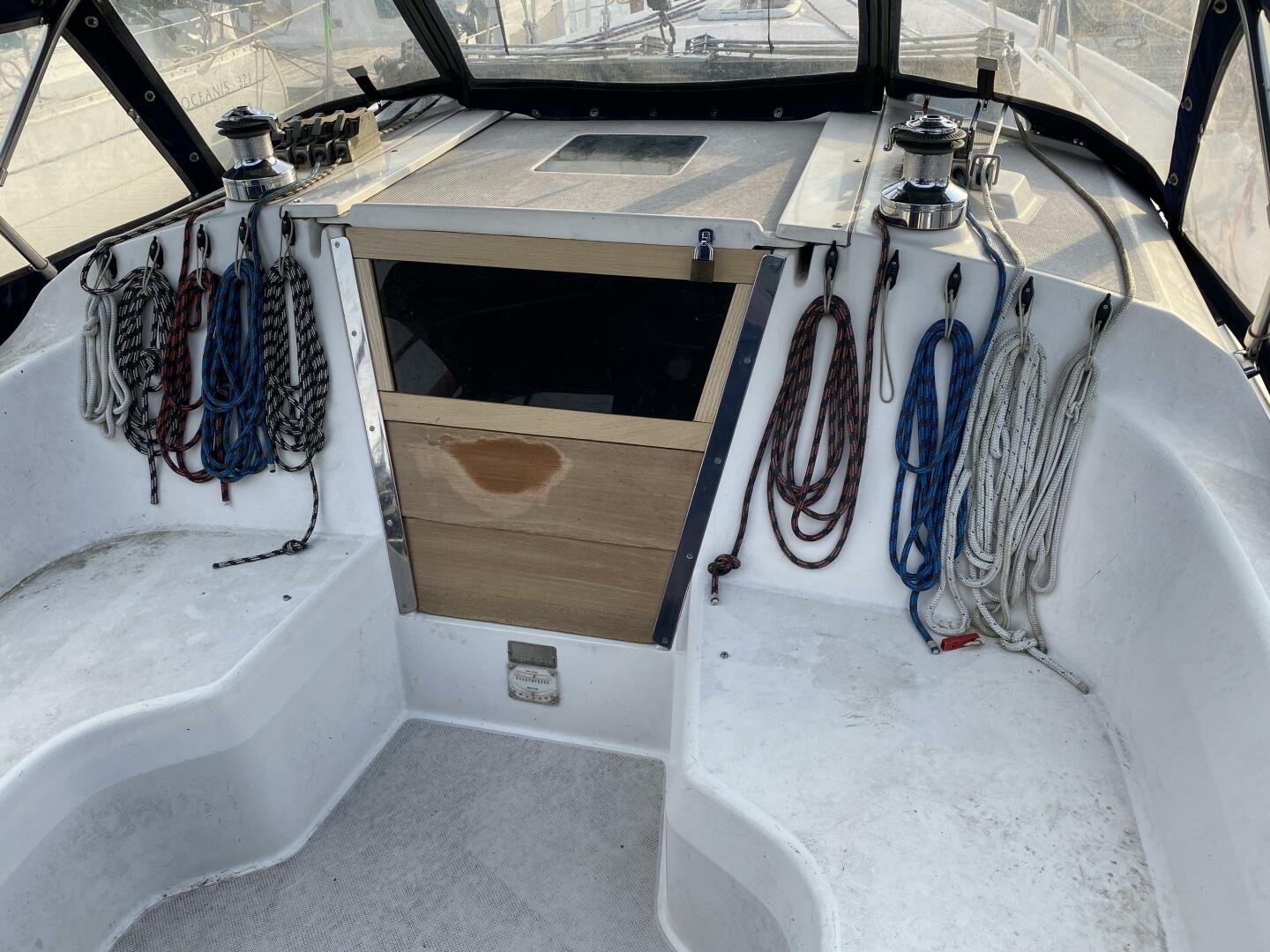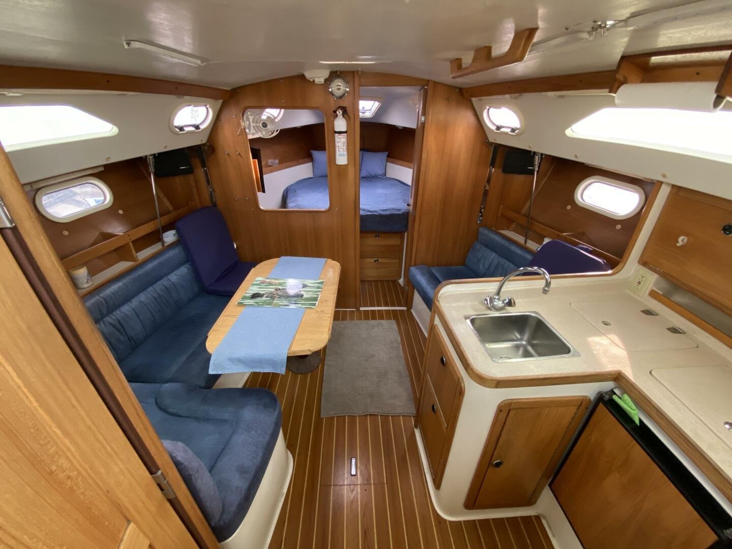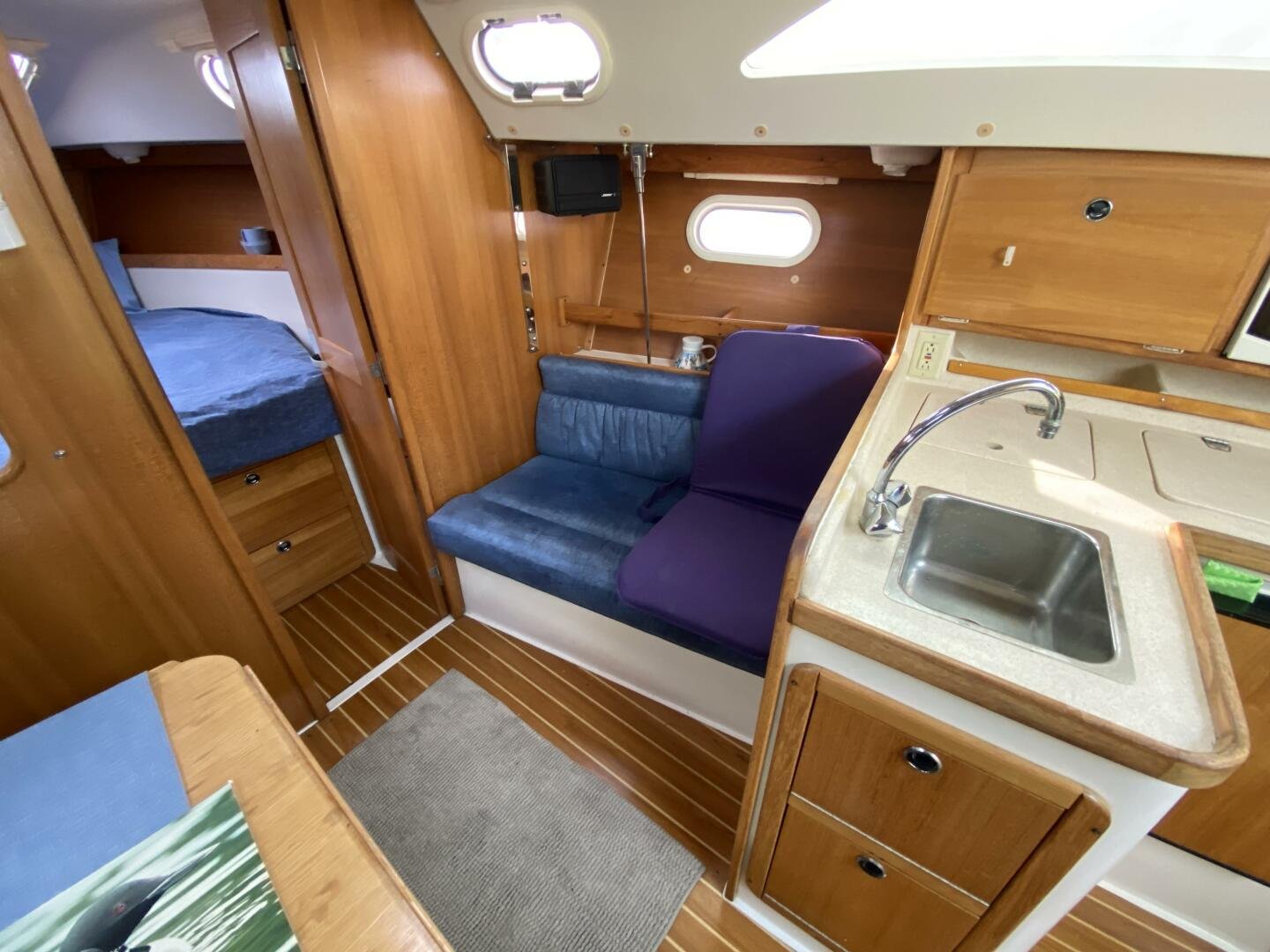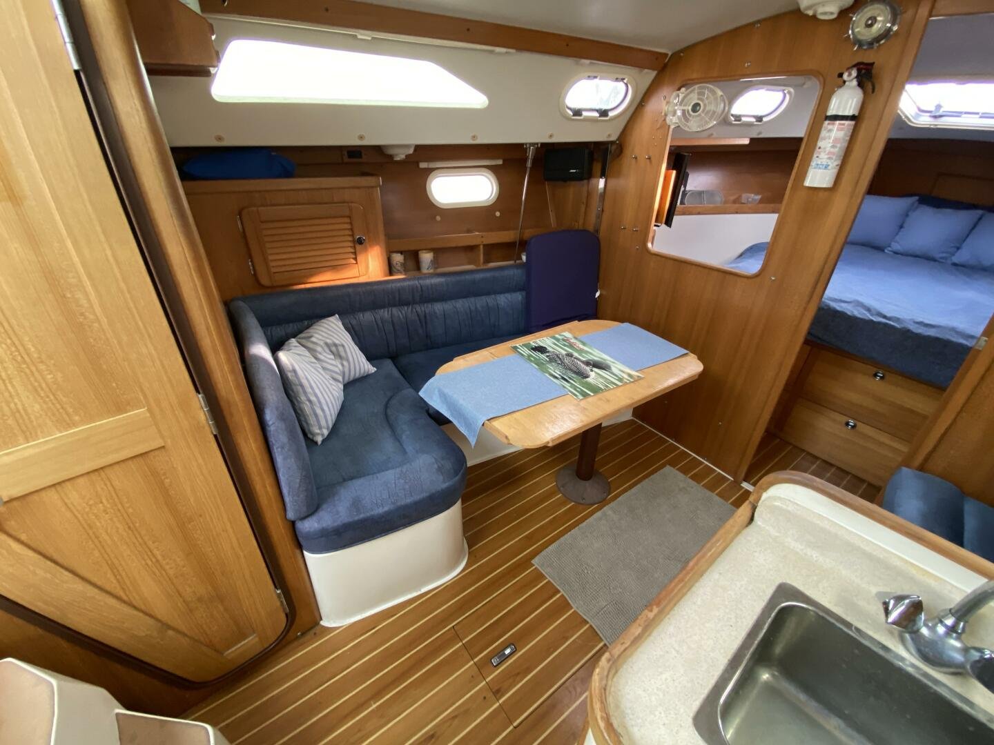 "Everyone who boards Loon Seeker comments on the spacious cockpit. Then they admire the light, bright, teak interior. We were told the 310 was designed to be safe and comfortable. It is! She confidently sails in winds over 20 knots and delivers good performance in lighter winds. The boat is well equipped for long trips, and we have loved anchoring in a bay to swim and relax with good music, comfortable seats and a VERY comfortable bed. She also offers an upgraded battery system so that you don't have to worry about being unable to use the engine after being away from shore power for an extended period of time. Most V-berths are small. but Loon Seeker's forward cabin offers the feeling of a much larger space. And if children and grandchildren are part of the crew, she offers great fun in a boat, whether learning to sail or swimming when anchored. After swimming, 2 people can also have privacy for changing at the same time - one in the roomy head and one in the forward cabin. The swim ladder has 4 rungs with rubber treads making it easier for those sailors with back or knee problems. And when it comes to performance, experienced sailors and racers, have envied Loon Seeker's performance so much so that they invested in new sails and a folding prop in an attempt to match that of our Catalina 310."