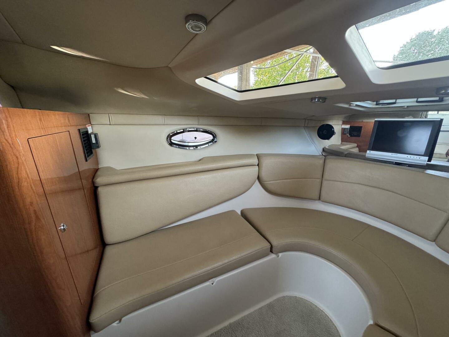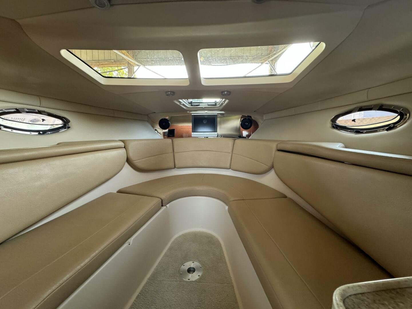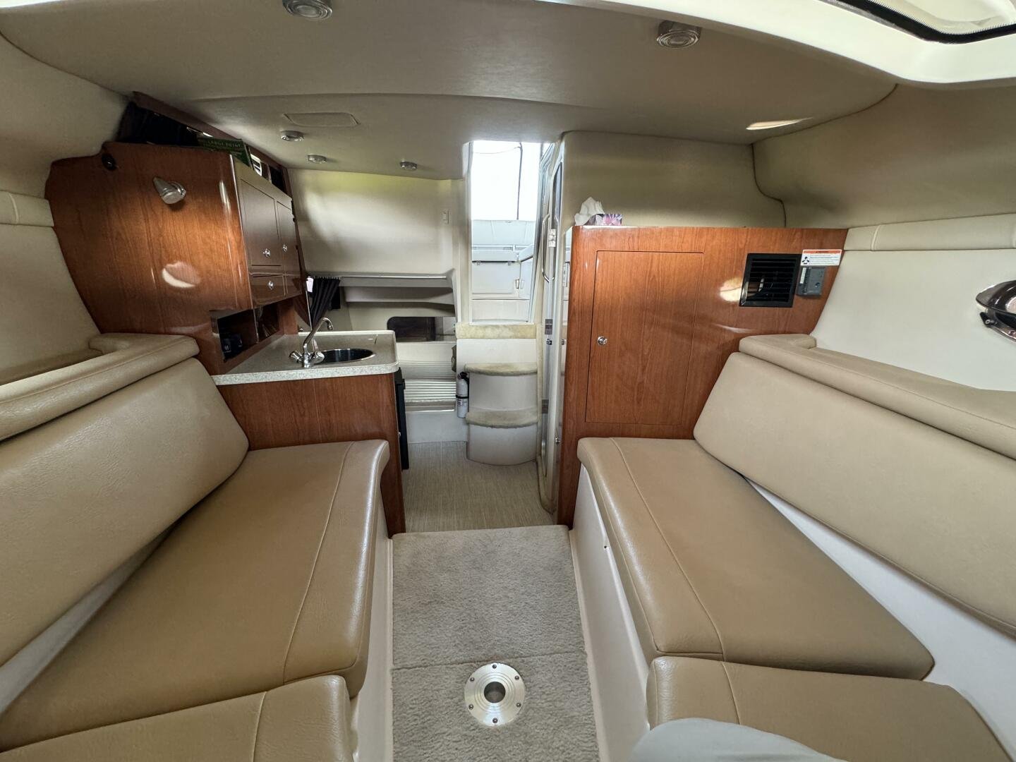 Down below there is a galley to starboard which features a sink, single burner stovetop and more storage. This boat does have AC and Heat in the cabin. To port there is a wet head. Forward is a convertible berth for seating of sleeping and aft is a queen size berth with privacy shade.