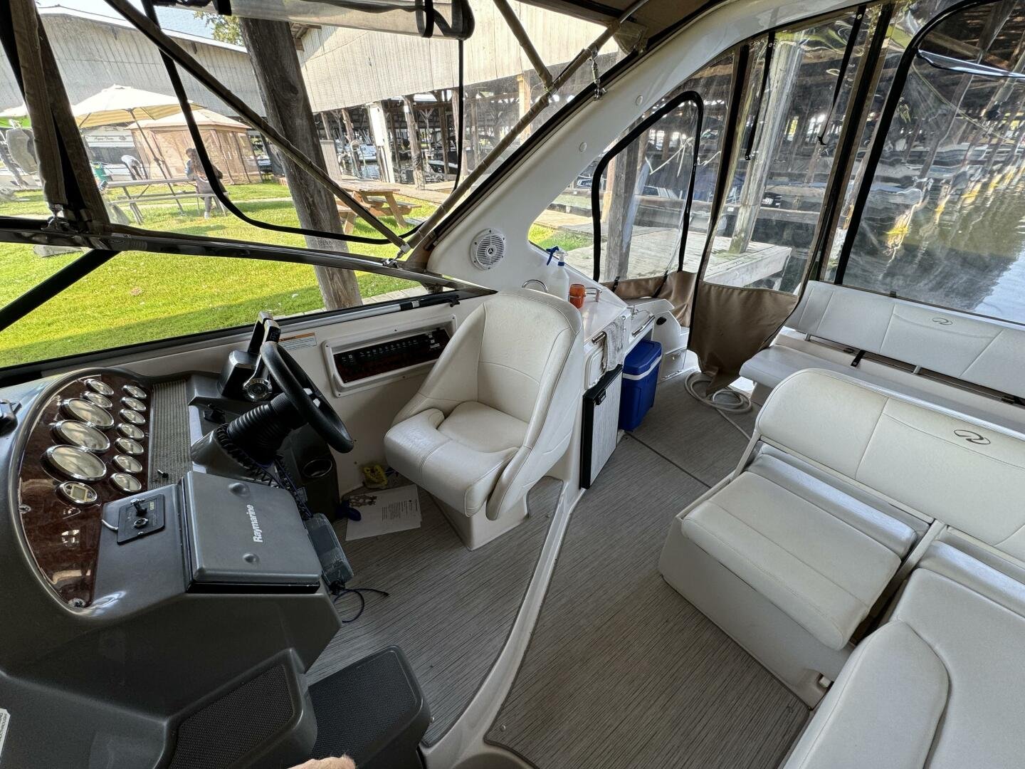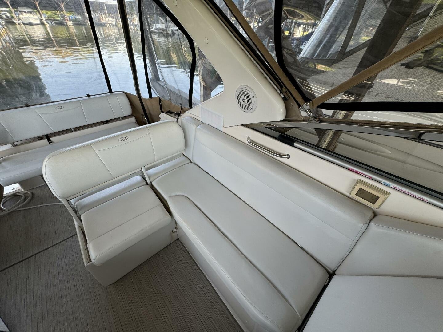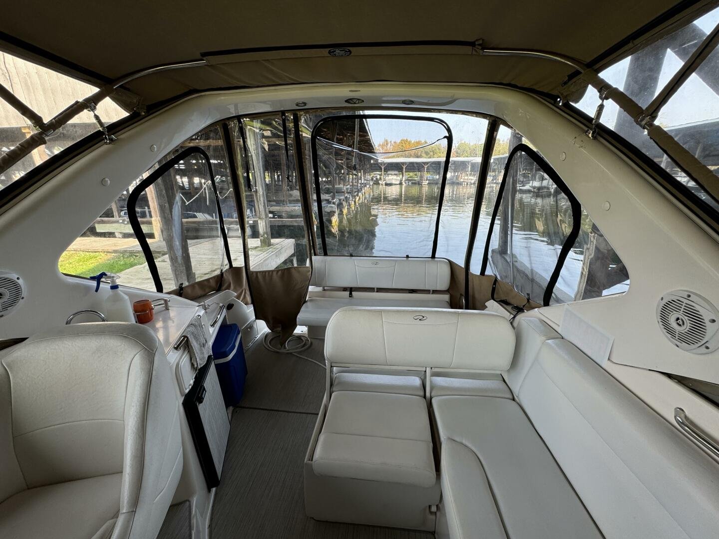 The cockpit offers lots of seating, a hot/cold freshwater shower and a prep station with sink and fridge. There is a removable snap in carpet on the decking and a full camper enclosure. At the helm you'll find a Raymarine, Raymarine VHF radio, depth finder, spotlight, stereo control and trim tabs. This boat also features a walk-through window to access the bow.