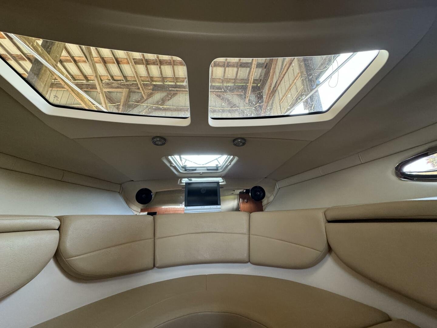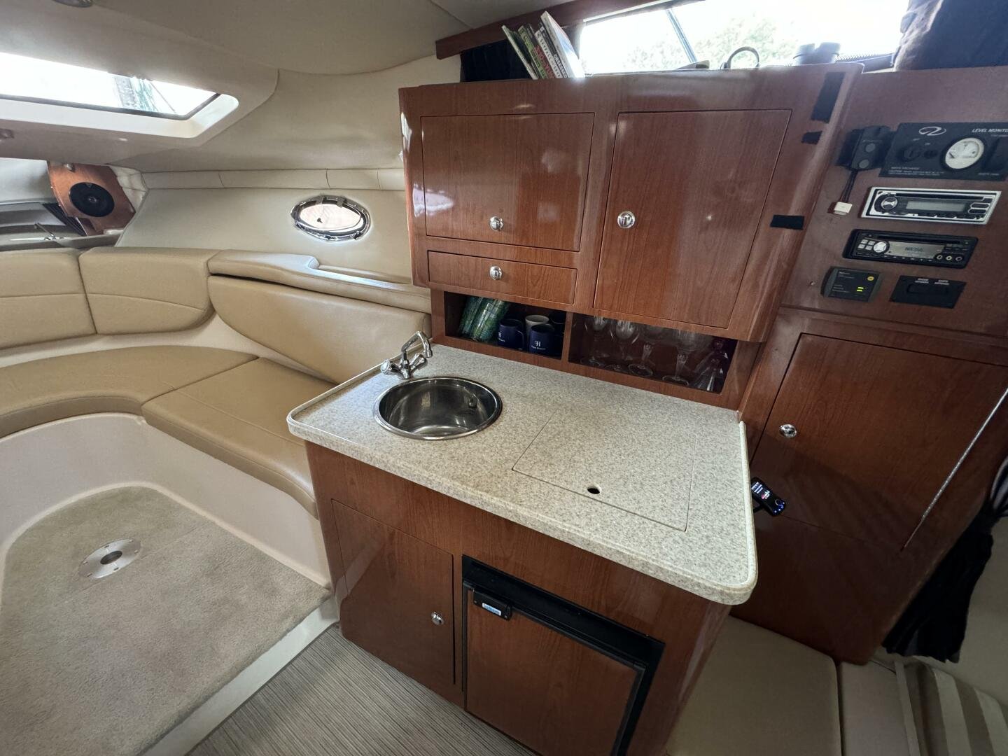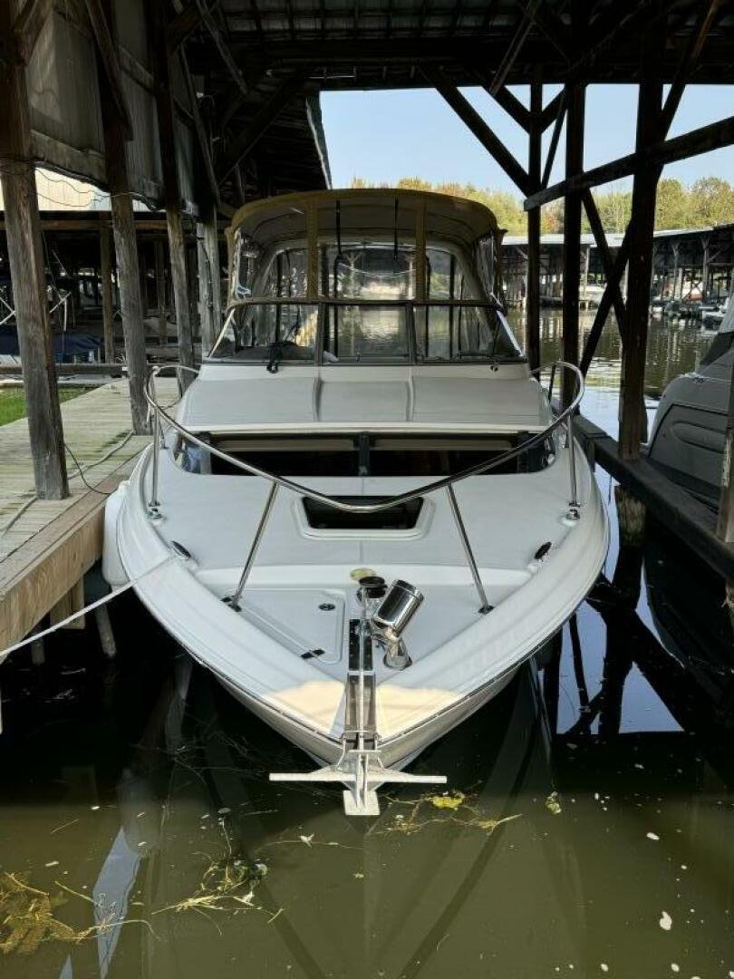 The cockpit offers lots of seating, a hot/cold freshwater shower and a prep station with sink and fridge. There is a removable snap in carpet on the decking and a full camper enclosure. At the helm you'll find a Raymarine, Raymarine VHF radio, depth finder, spotlight, stereo control and trim tabs. This boat also features a walk-through window to access the bow.