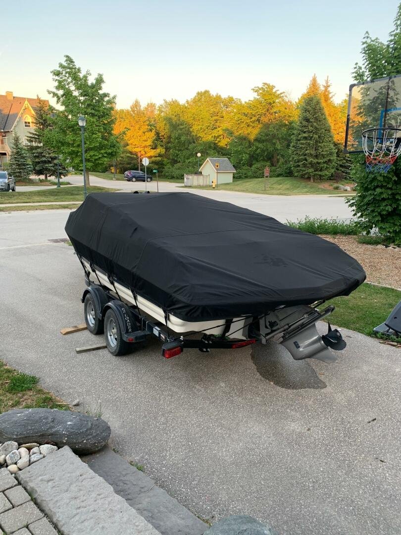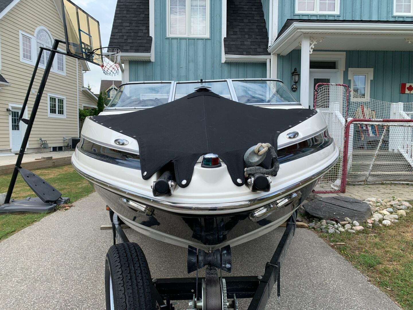 Full bimini top for shaded relaxation and a custom tandem-axle trailer included – no hassle, just hit the highway and go!