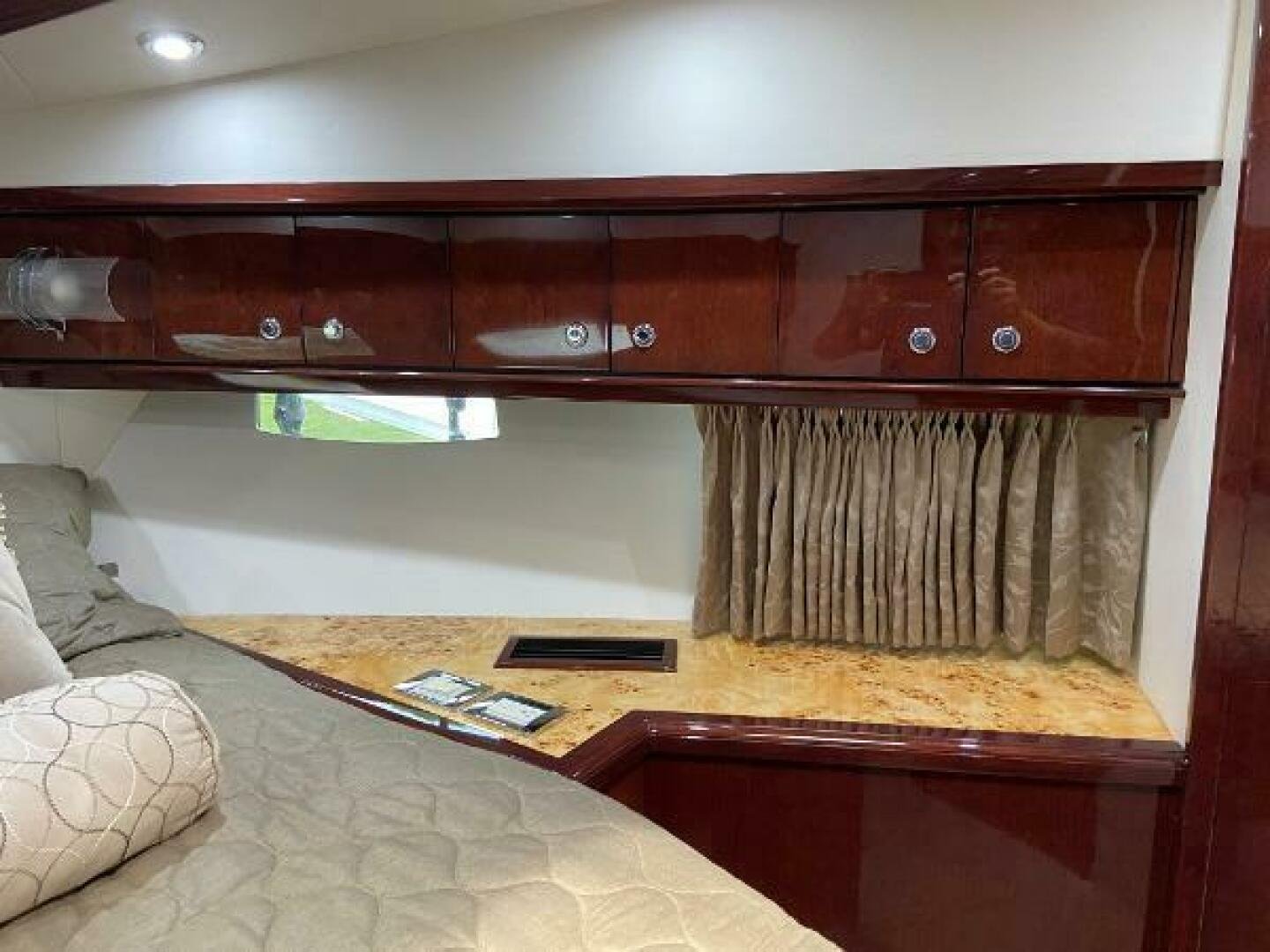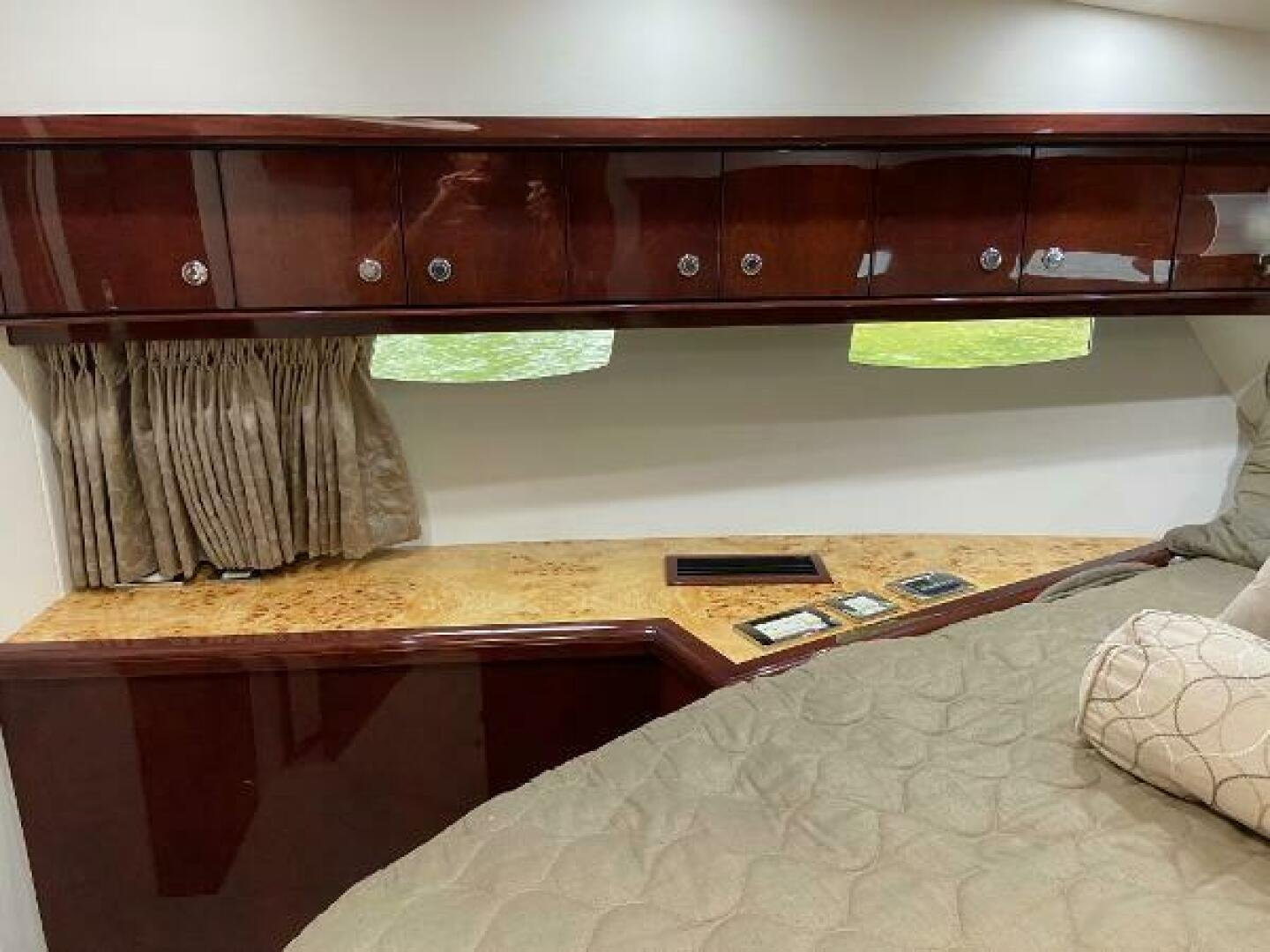 Directly off the lower salon aft the full beam master stateroom boasts a queen size berth with a custom headboard, and two burlwood-topped cherry nightstands with two drawers each. A reading light in the soffit above for each side of the berth. To both port and starboard are full-sized cedar-lined hanging lockers, as well as cherry banks of drawers with burlwood tops. There is also drawer storage under the berth.