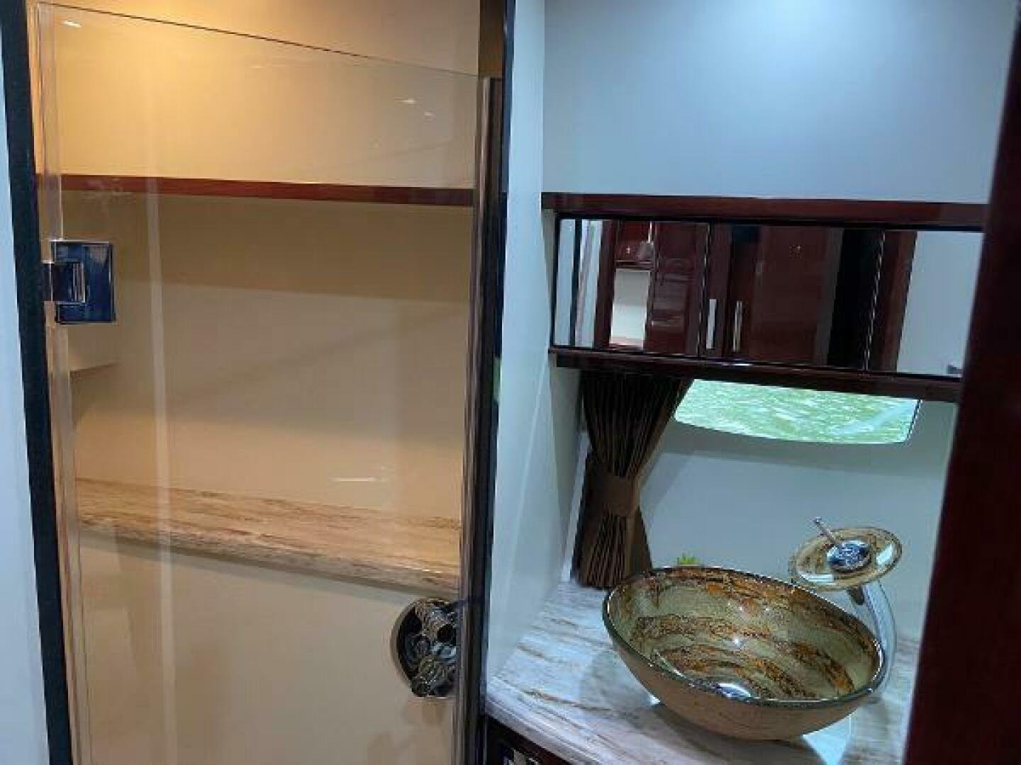 Port side forward is the VIP/guest head. This head is used by the VIP stateroom, and also functions as a day head for guests. There are dual access door for this purpose. The cherry cabinet has one cabinet door below, mirrored cherry cabinets above. A vessel sink above the Corian counter top and a very unique waterfall faucet is above. The head has a large shower with a frameless door, exhaust fan and a fixed port light.