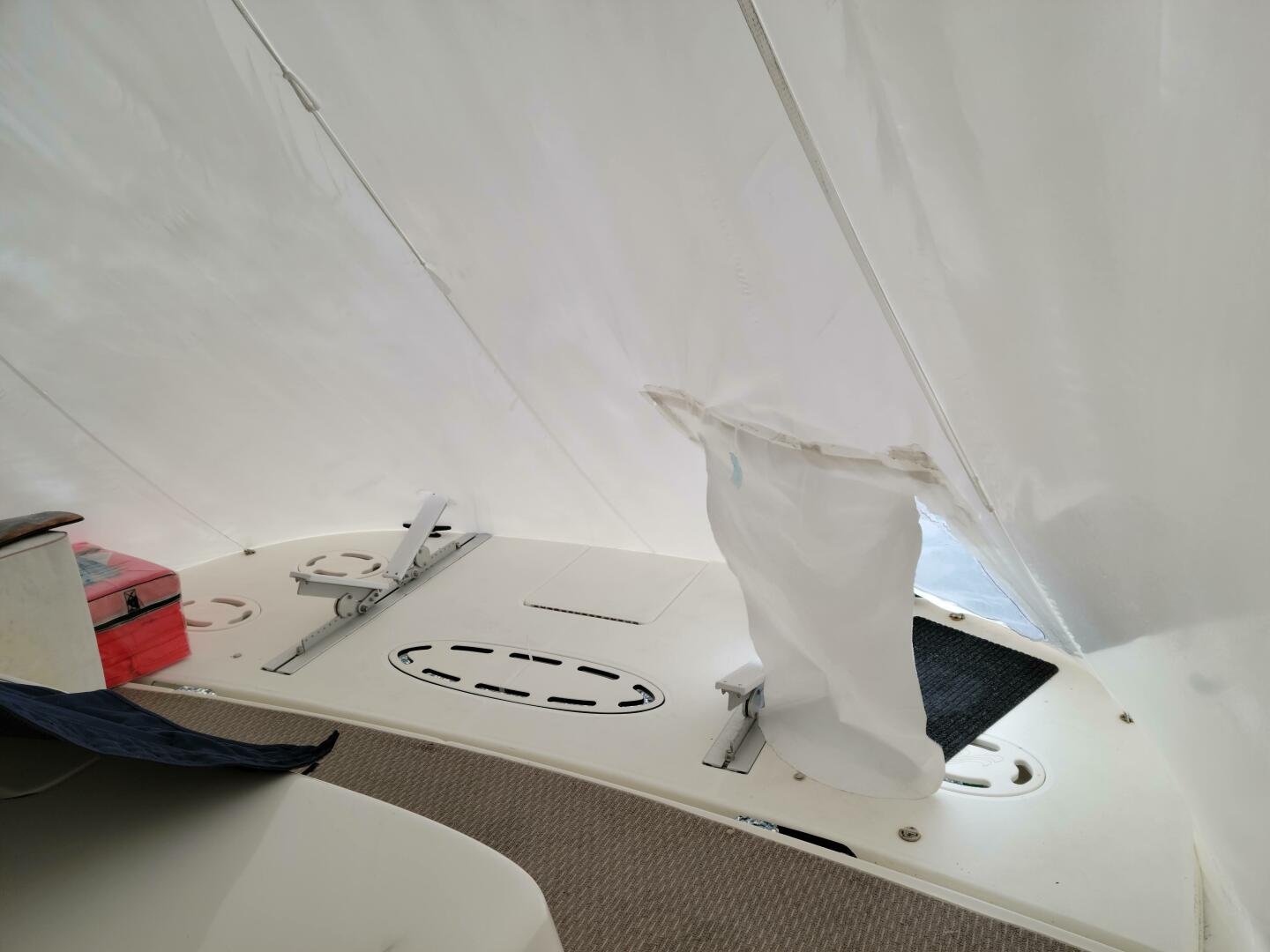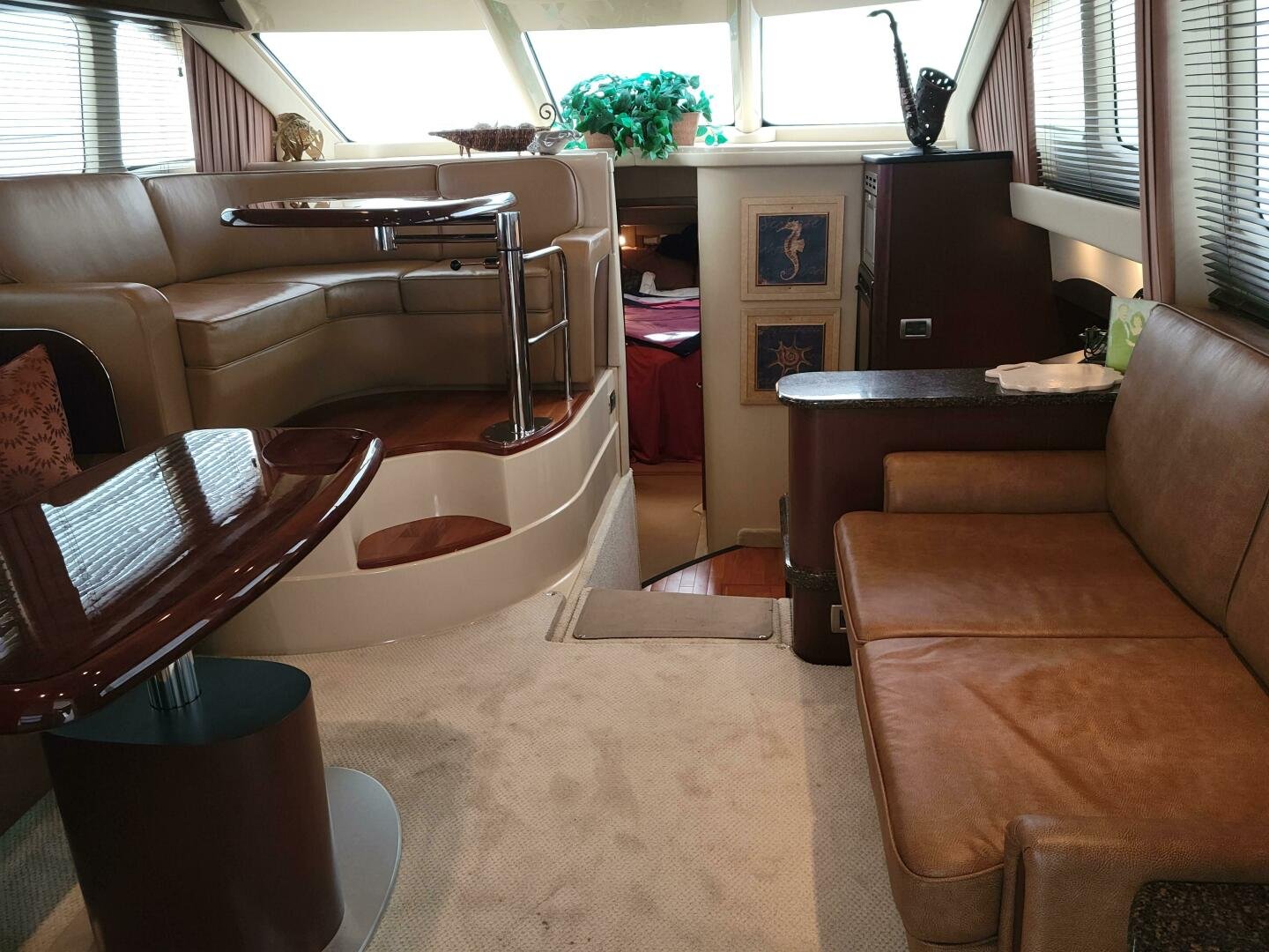 - Port side salon sofa converts to berth, starboard side sofa with storage.