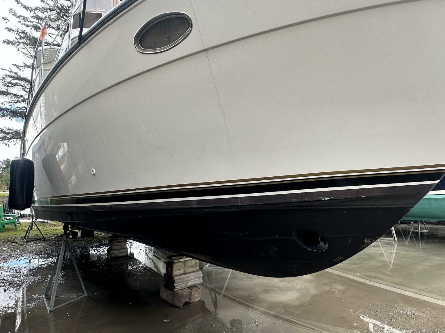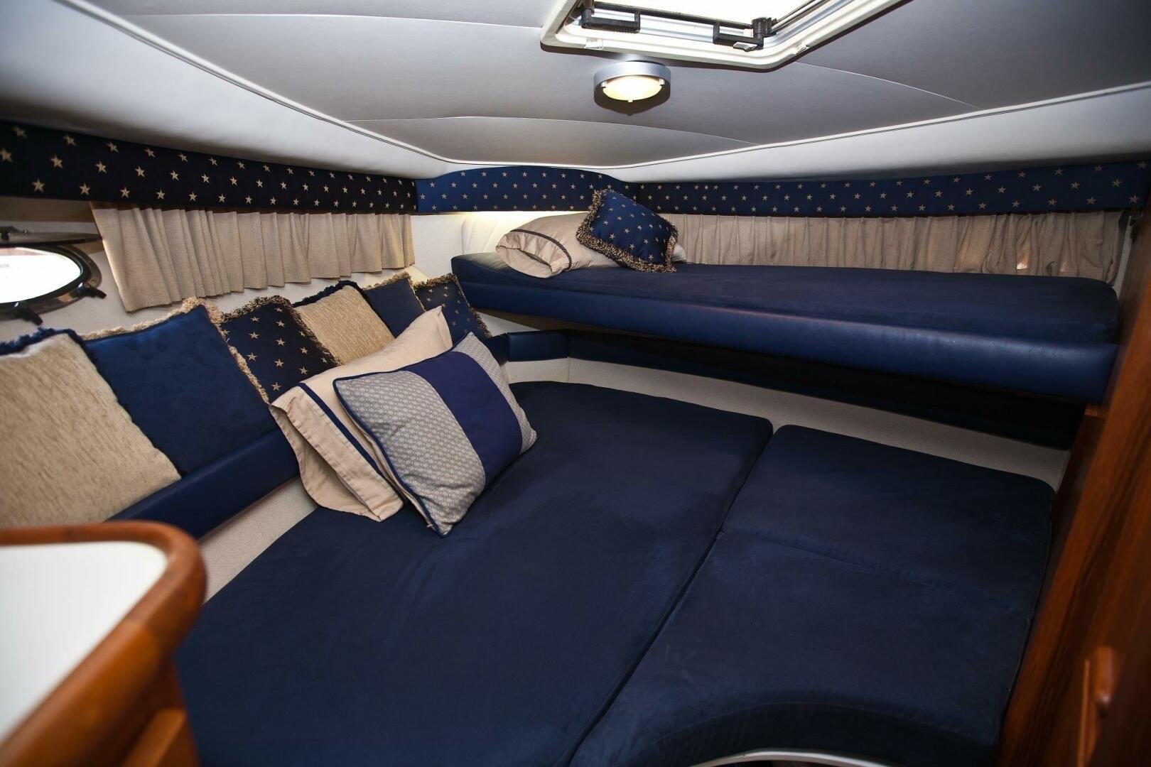 At the helm there you have a Raymarine chart plotter, VHF, autopilot, and through hull bow thruster controls. Down below you have an expansive salon with access to the generator and engines. There is also a large entertainment center. Stepping down you have a well-appointed galley with oven, three burner stove, sink, coffee maker, and 3/4 fridge/freezer. At the bow you have the secondary stateroom and day head. The master is in the aft, with a large bed and separate head/shower.
