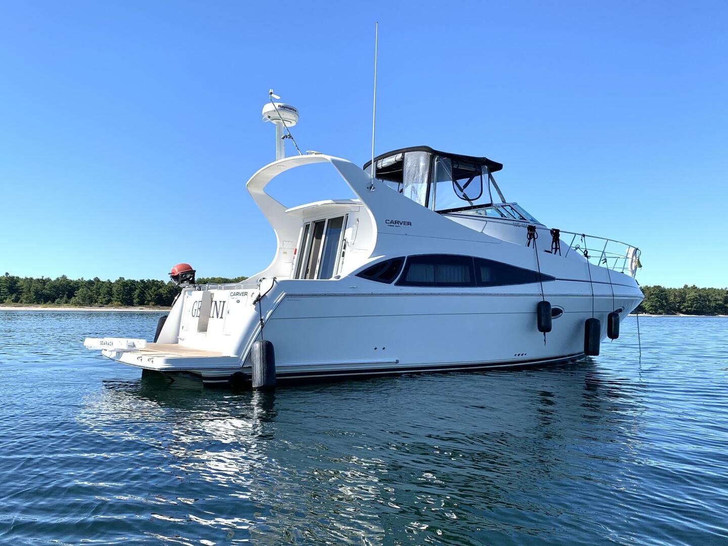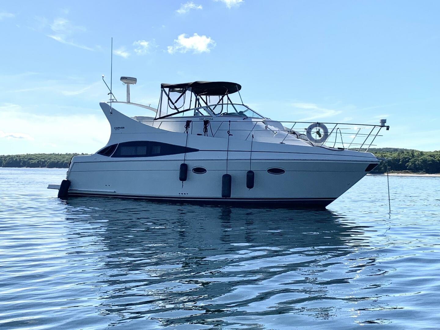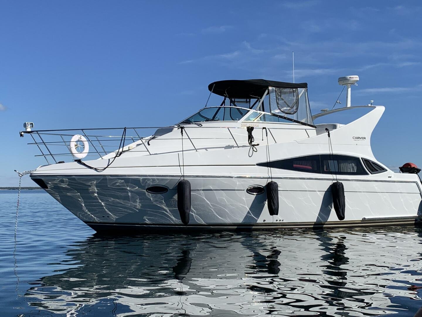 This freshwater boat is clean and ready to go for summer 2025, with a 2023 survey available! The Carver 360 Mariner has an extremely desirable layout. With a large extended swim platform (with a swivel carrier rack), entering through the starboard transom door you are met with an open cockpit, and large molded steps on both sides to the bridge. The bridge is fully enclosed and provides comfortable seating for up to 10 guests. You enter the main cabin through sliding doors and are met with a large couch to port (pull-out), and a dinette with seating for four to starboard that converts to an additional sleeping area. The galley is well appointed with a sink, twin electric burners, microwave, and fridge/freezer. There is a large head and separate shower with a separate entrance from the main salon, as well as an en-suite entrance. The main cabin has a center-line island bed with twin hanging lockers and ample storage.