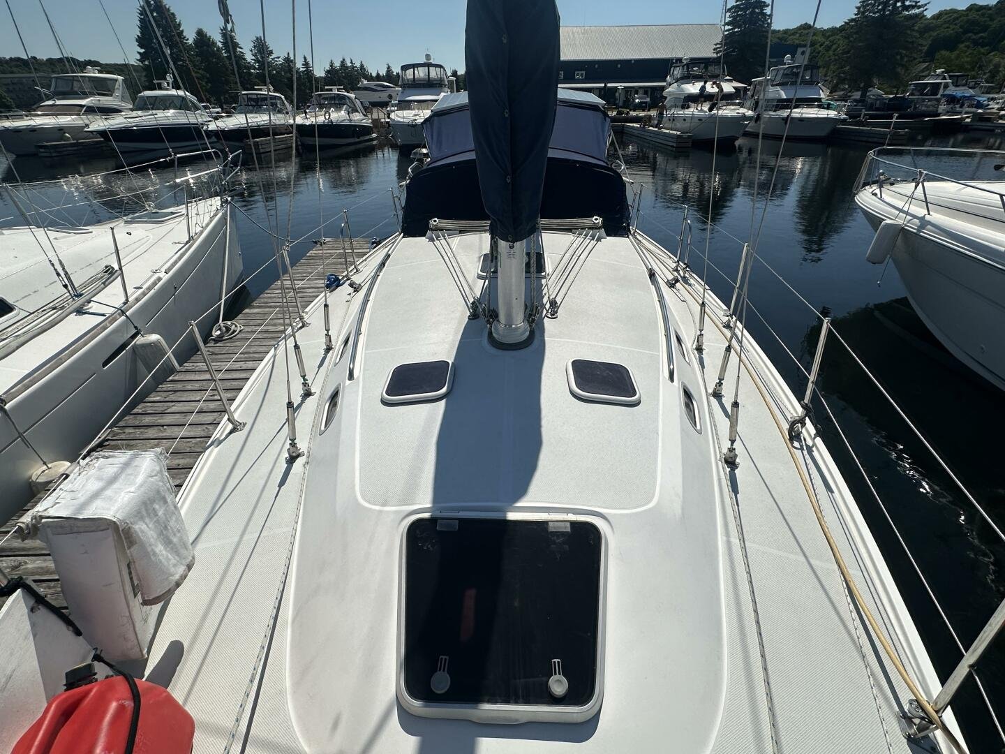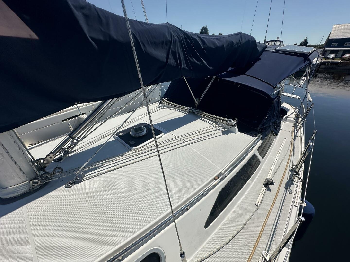 - Fiberglass hull & decks; white hull, white/grey 2-tone factory non-skid decks, navy blue striping . Light & ventilation provided by 7 hatches, 4 opening ports, all with screens. There are two fixed ports in the hull to provide additional light.