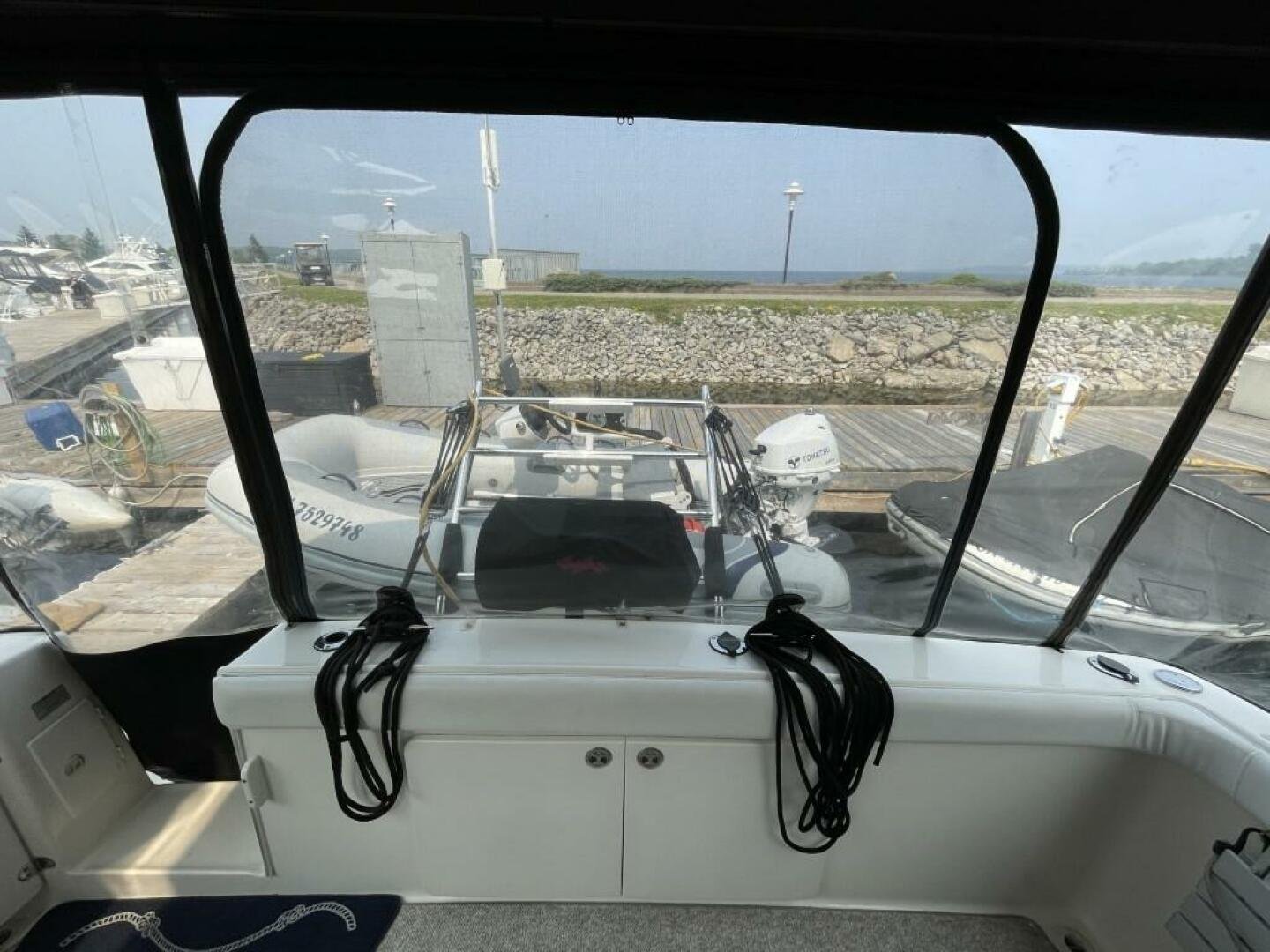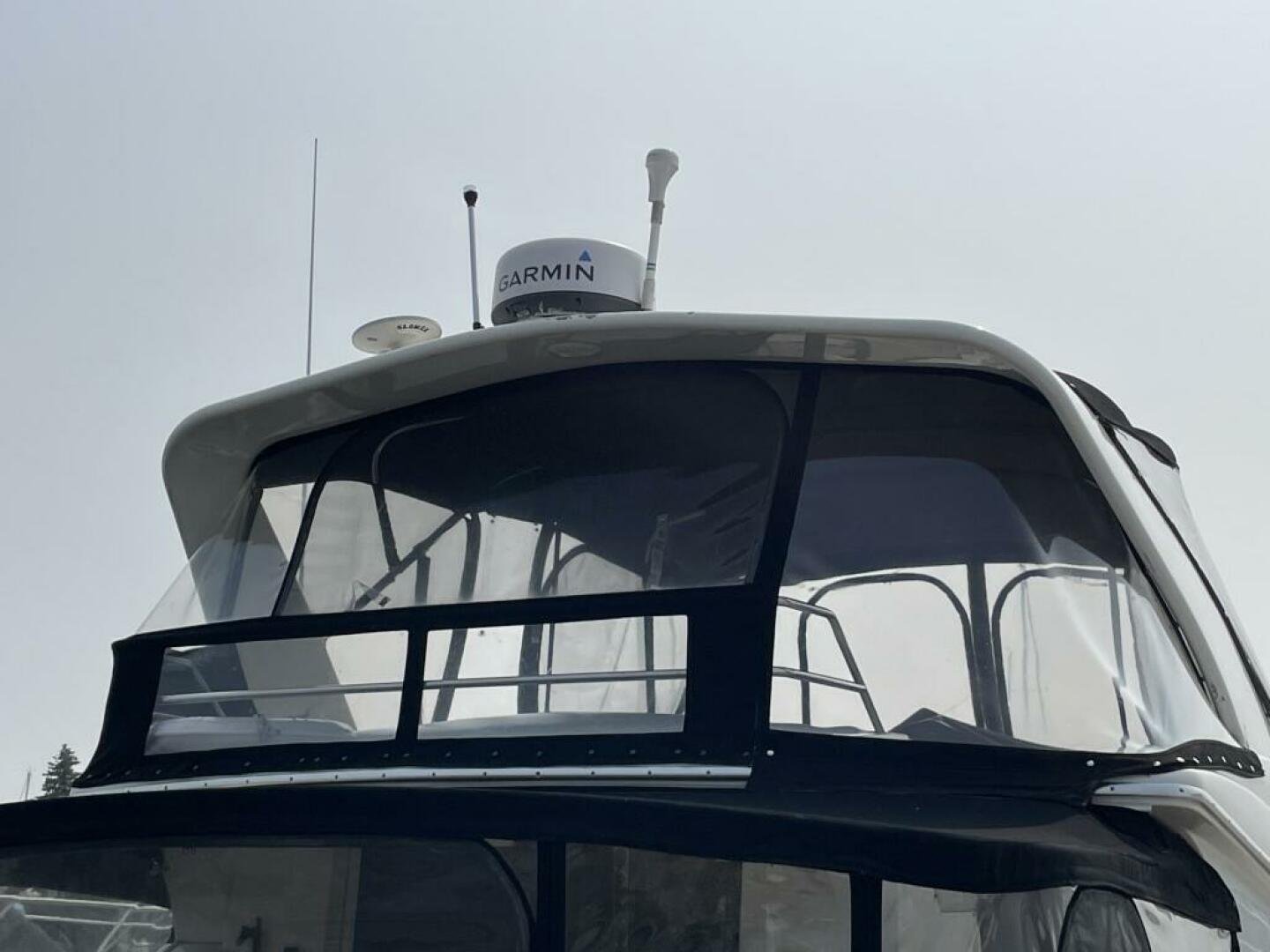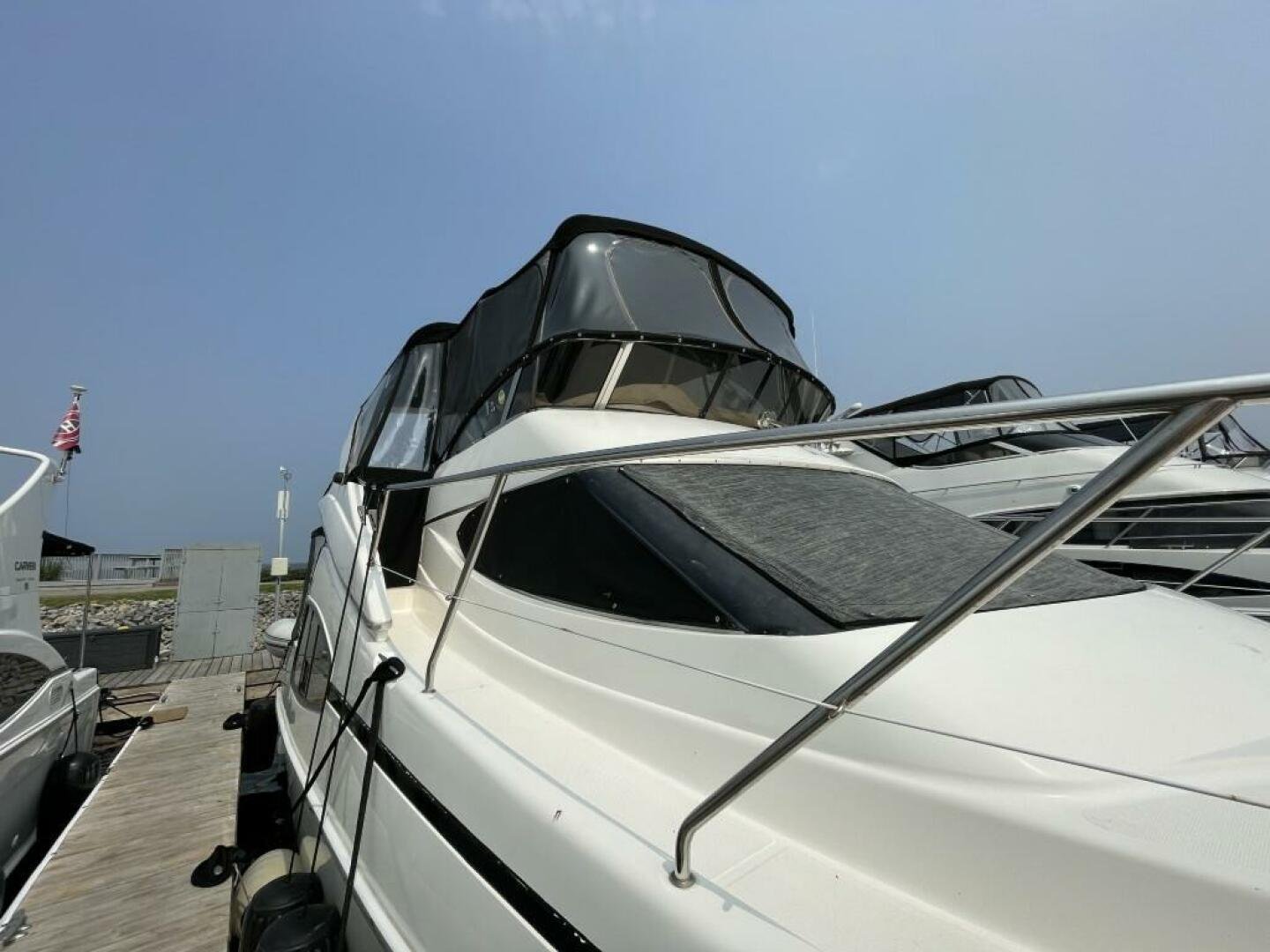 The helm features an autopilot, radar, VHF, chart plotters, bow/stern thruster controls, trim tabs, and windlass, as well as an array of gauges and rocker switches. A large swim platform and enclosed aft cockpit make for a great relaxing space.