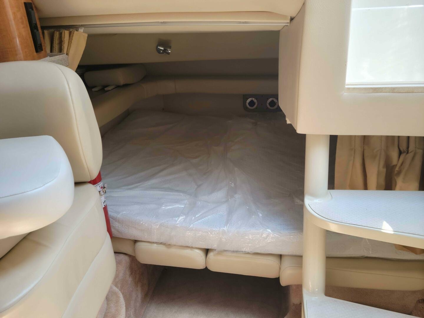 The Regal Commodore 3060 has a large, deep cockpit with generous surround seating, refreshment center and removable table, that provides the means for gracious, uncomplicated, outdoor entertaining. Below, the light, airy interior is remarkably spacious and comfortable. The 3060 does it all, with noticeably high-performance attitude. Choose Twin V-6 or V-8 power and get exceptional acceleration, a smooth, stable ride, enhanced handling, and top speeds up to 50-plus mph. The spacious midcabin features U-shaped seating that converts to a queen-size berth with a cedar-lined hanging locker and oval portholes with screens. The stylish main salon features a very complete galley with microwave oven, stove, fridge, and coffee maker. Galley countertops are real Corian for long lasting beauty and easy care. The forward berth has a fitted designer comforter and lots of storage under. A cedar-lined hanging locker, plenty of drawer space, and a swivel TV / VCR are also included in the forward berth area. The spacious booth-style dinette with pear wood table converts to another berth and provides under-seat storage. Transom door offers easy access to the cockpit from swim platform. Stainless steel ladder makes for easy boarding when swimming.