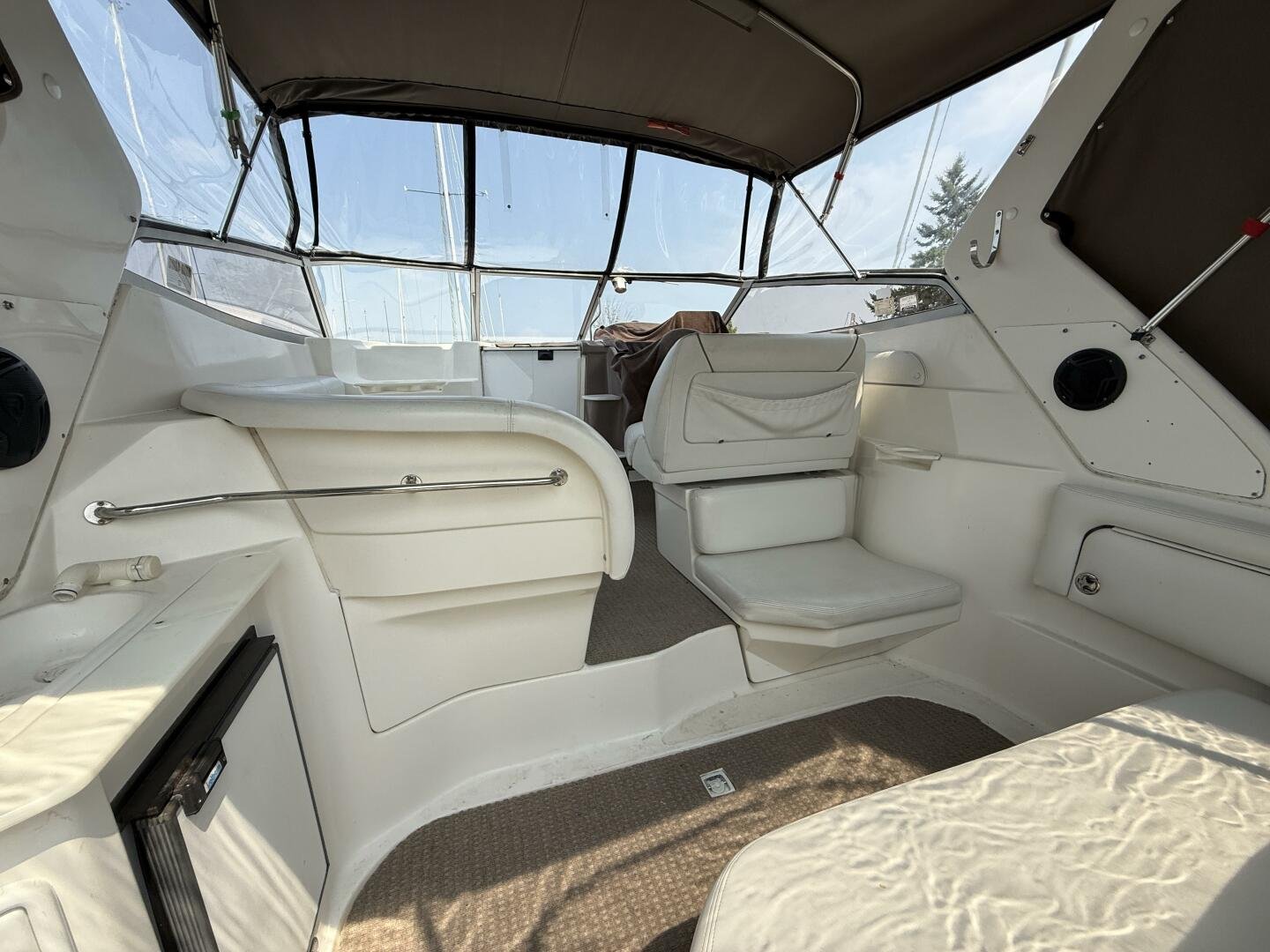 Maxi-volume express cruiser with innovative topside seating is versatile, stylish, agile. Broad 9'11" beam allows for spacious interior with large head, cherry cabinetry, berths for six. Refrigerator under forward berth allows storage space under galley counter. Pivoting helm seat, aft L-shaped lounge with removable table, foldaway aft settee maximize cockpit space. Note walk-through windshield, performance-enhancing stepped hull.
