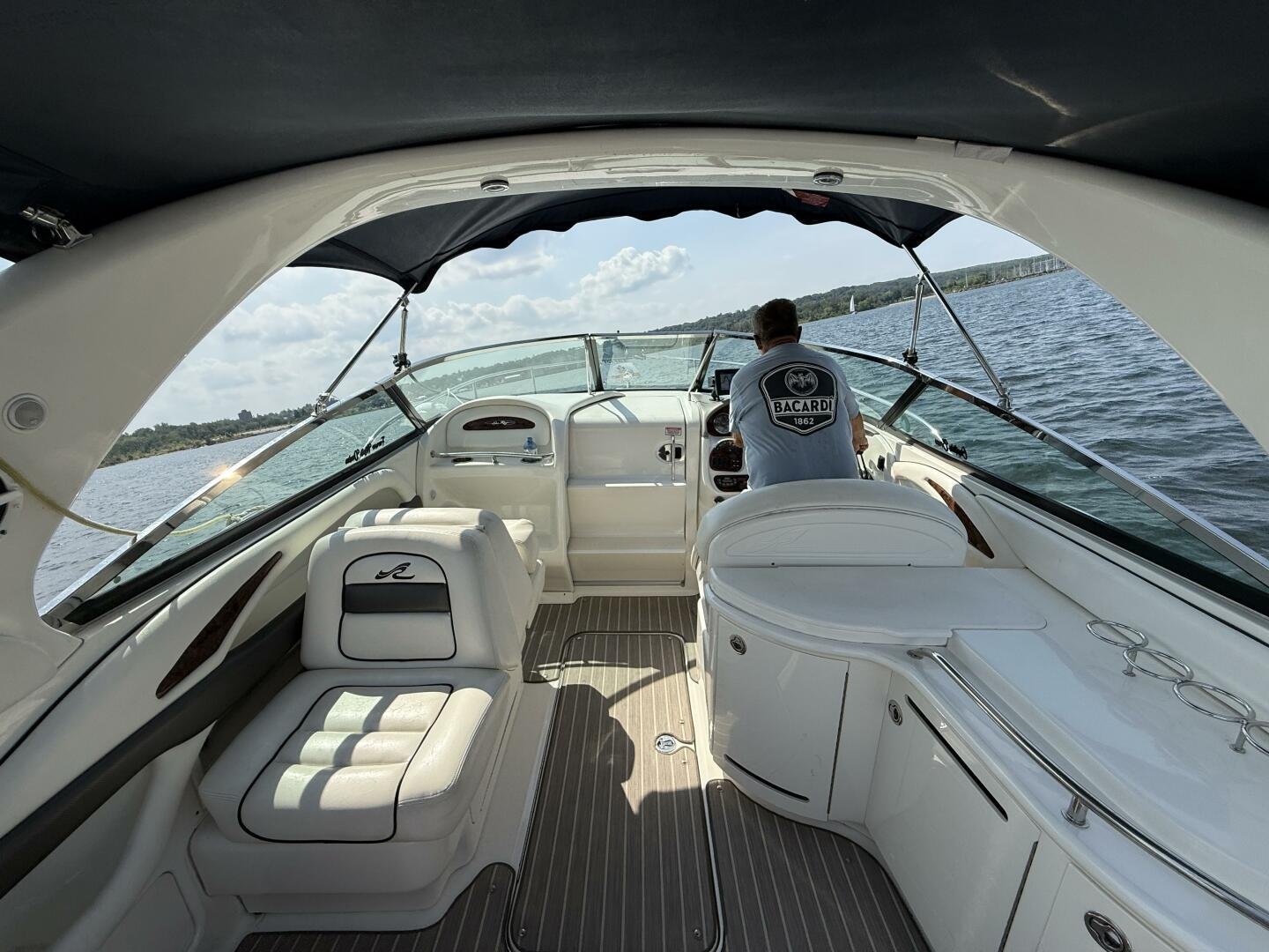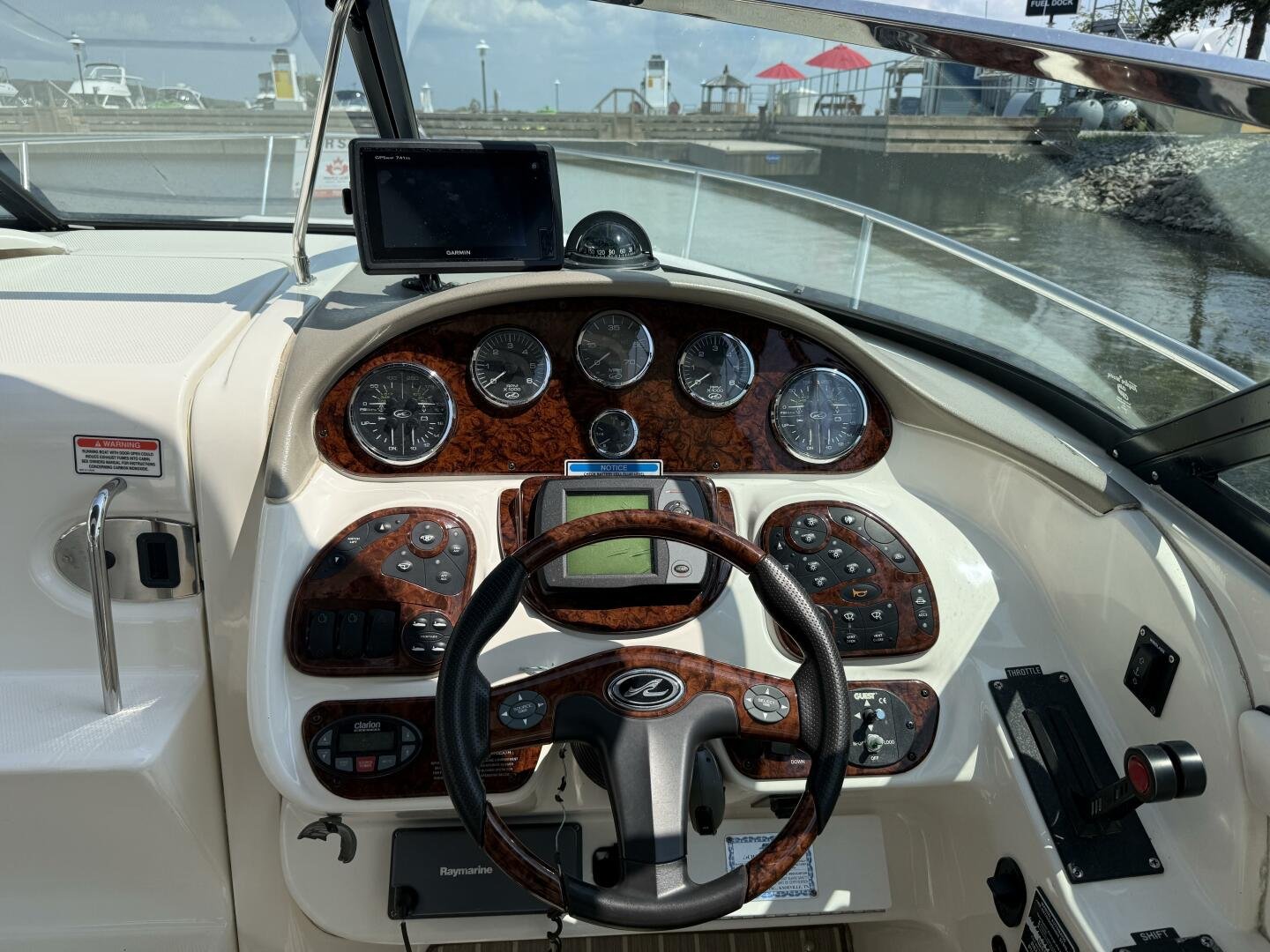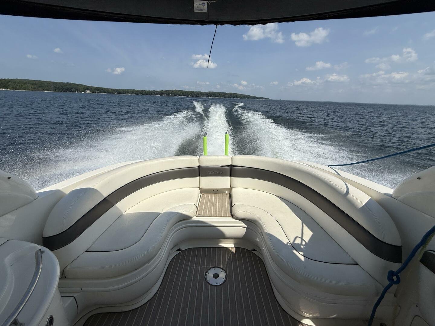Stepping through the center-line transom door you have an expansive cockpit with large u-shaped seating, back-to-back seating to port, and storage & wet-bar to starboard. At the helm, there is an upgraded Garmin chartplotter. Down below there is a vaccu-flush head, microwave, tv-set, 12/110v fridge, dining table, and bed.