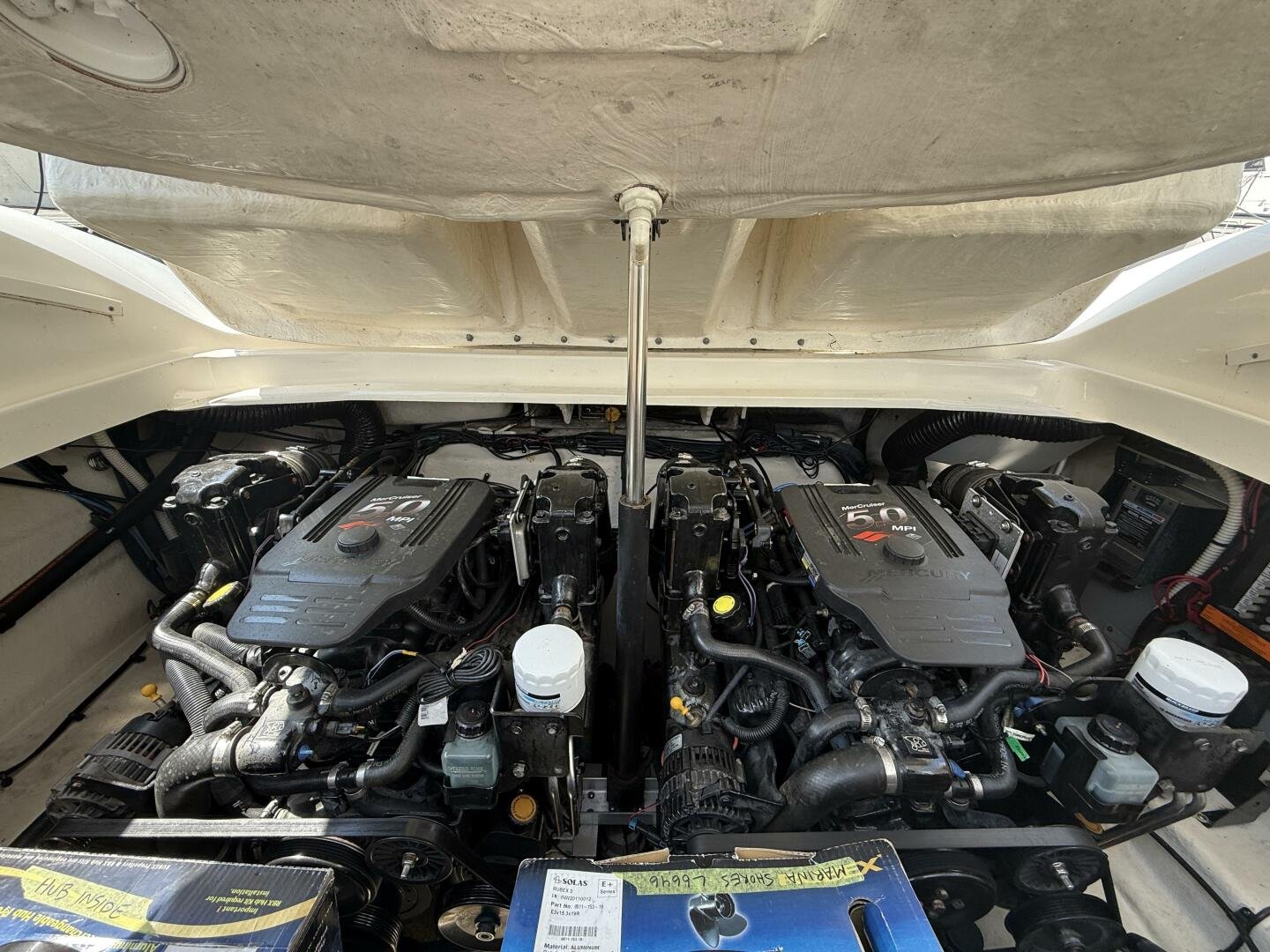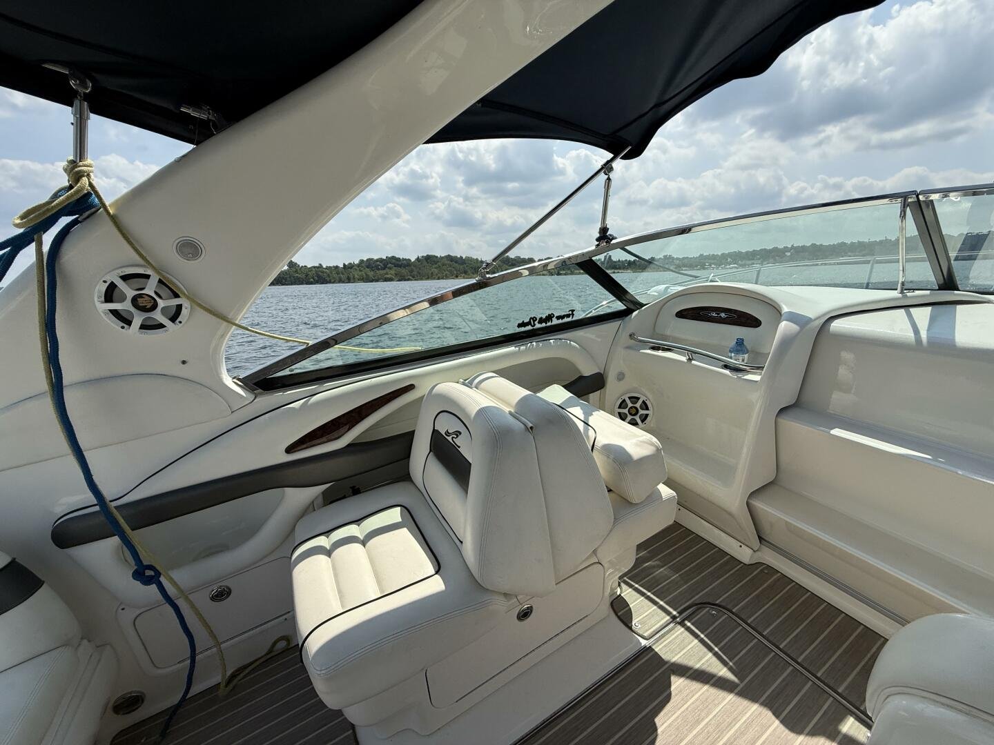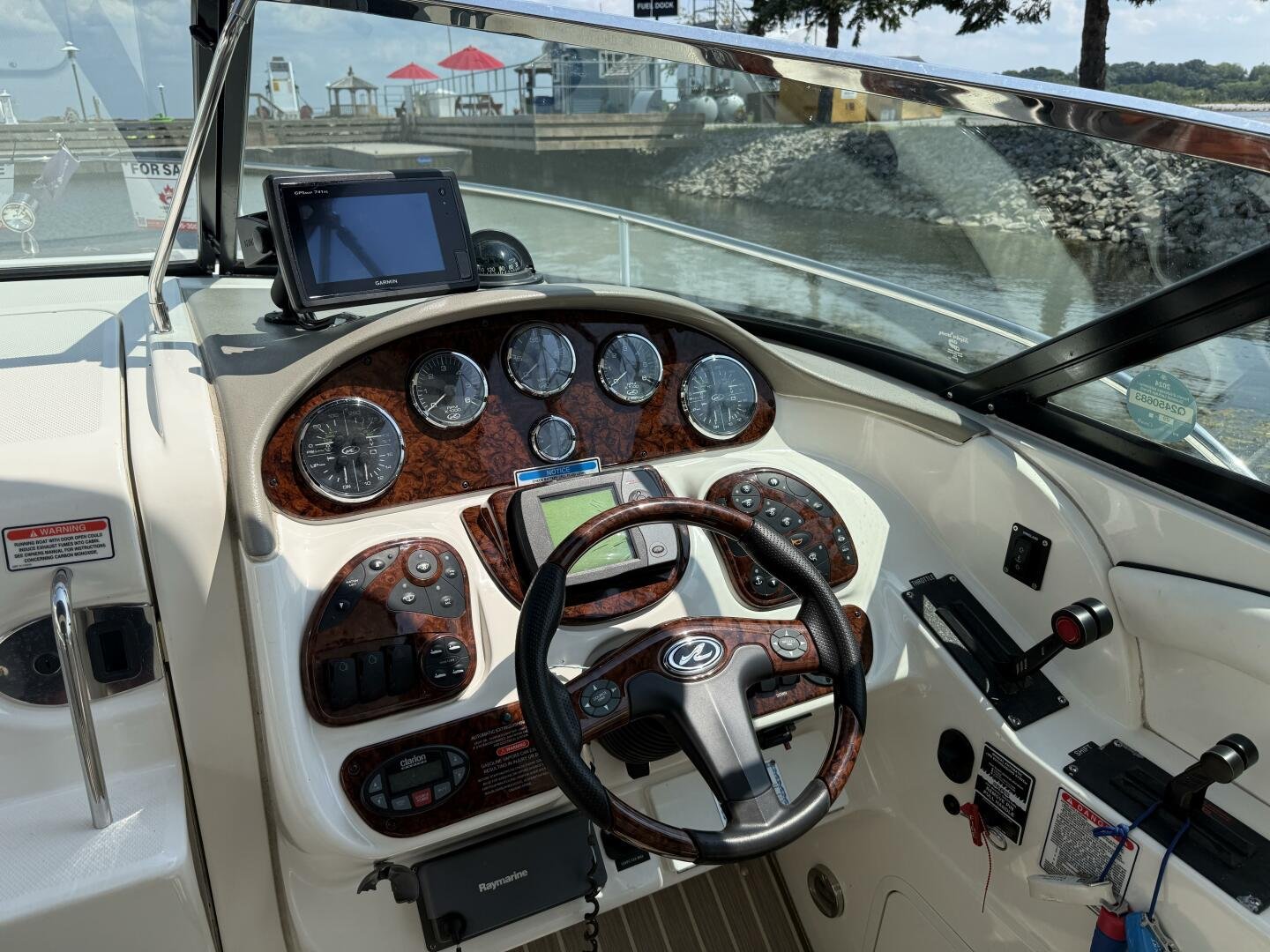 Stepping through the center-line transom door you have an expansive cockpit with large u-shaped seating, back-to-back seating to port, and storage & wet-bar to starboard. At the helm, there is an upgraded Garmin chartplotter. Down below there is a vaccu-flush head, microwave, tv-set, 12/110v fridge, dining table, and bed.