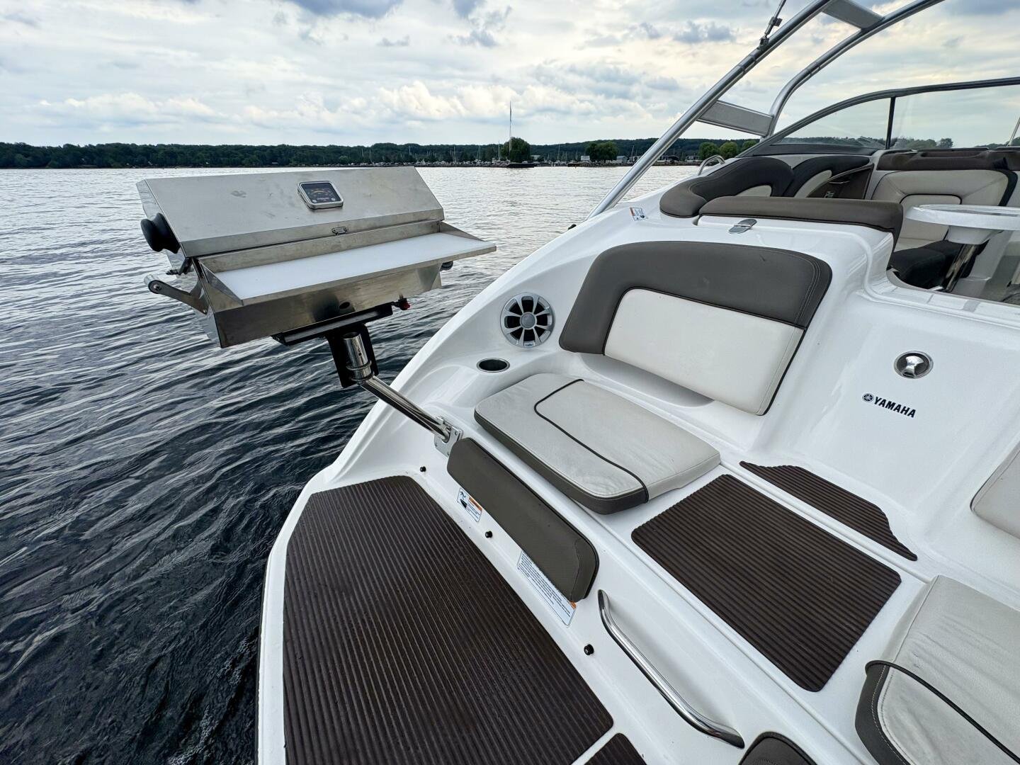 Featuring Yamaha’s award-winning stern lounge area with rear-facing seats, a swim platform with easy water access, along with an Integrated bow boarding ladder. This boat also features the optional no wake mode & cruise assist, premium sound system, wakeboard tower with integrated Bimini top, head with holding tank, transom shower, transom mounted BBQ, and underwater lights. A tandem axle trailer in excellent shape is included.
