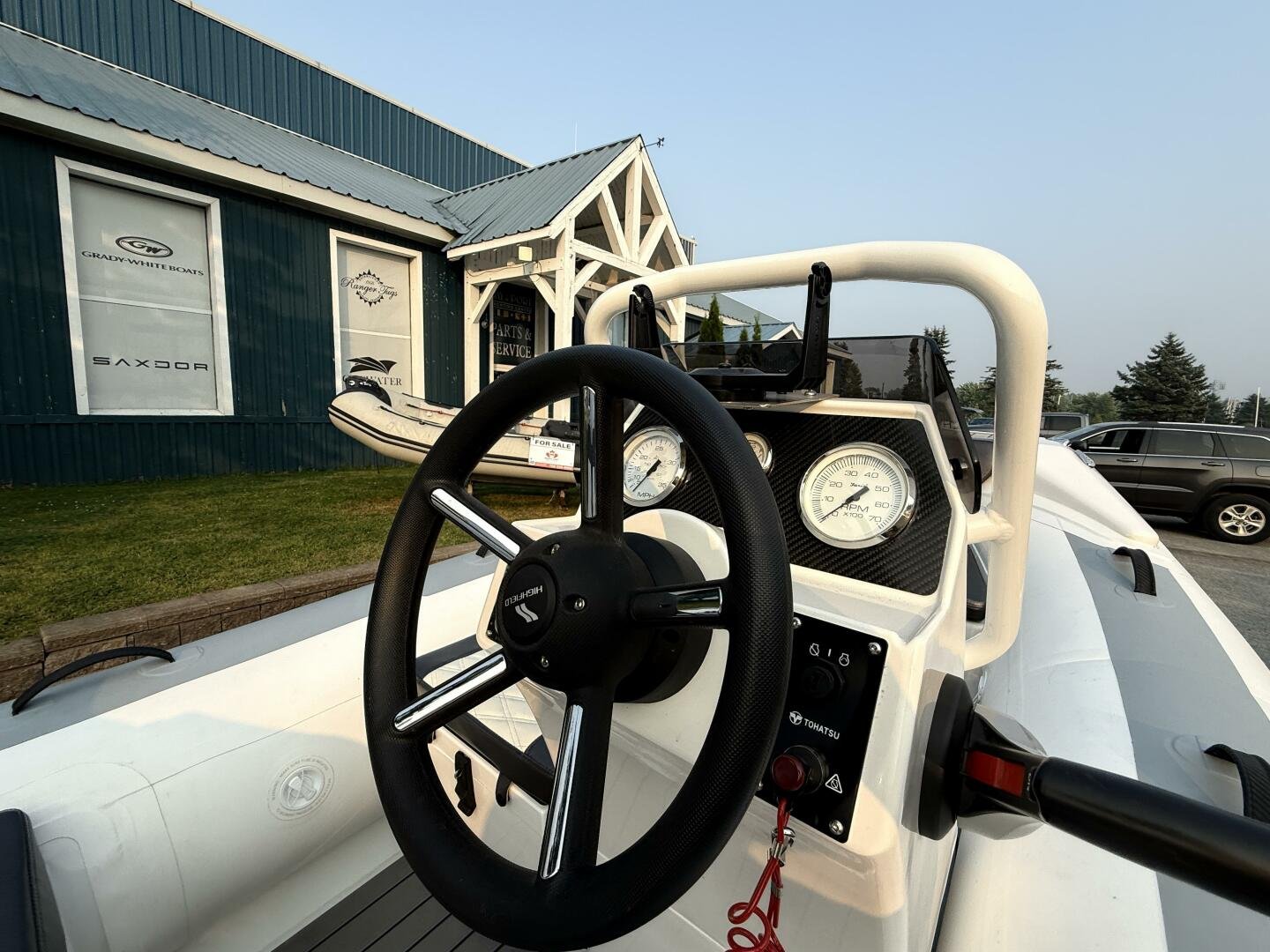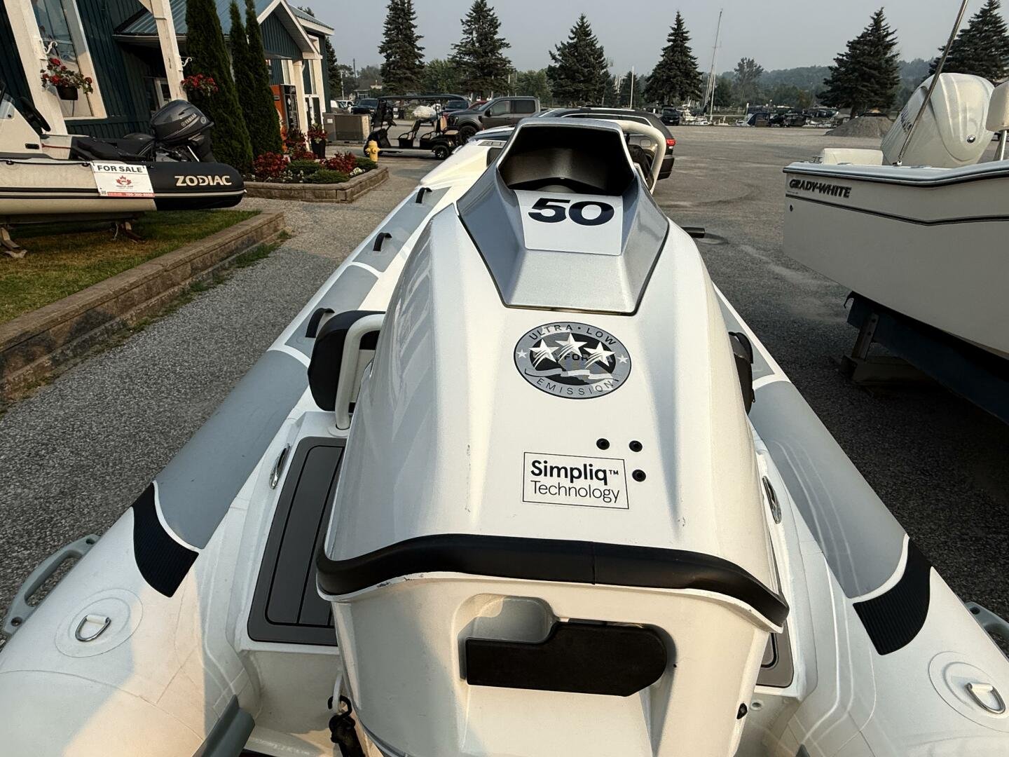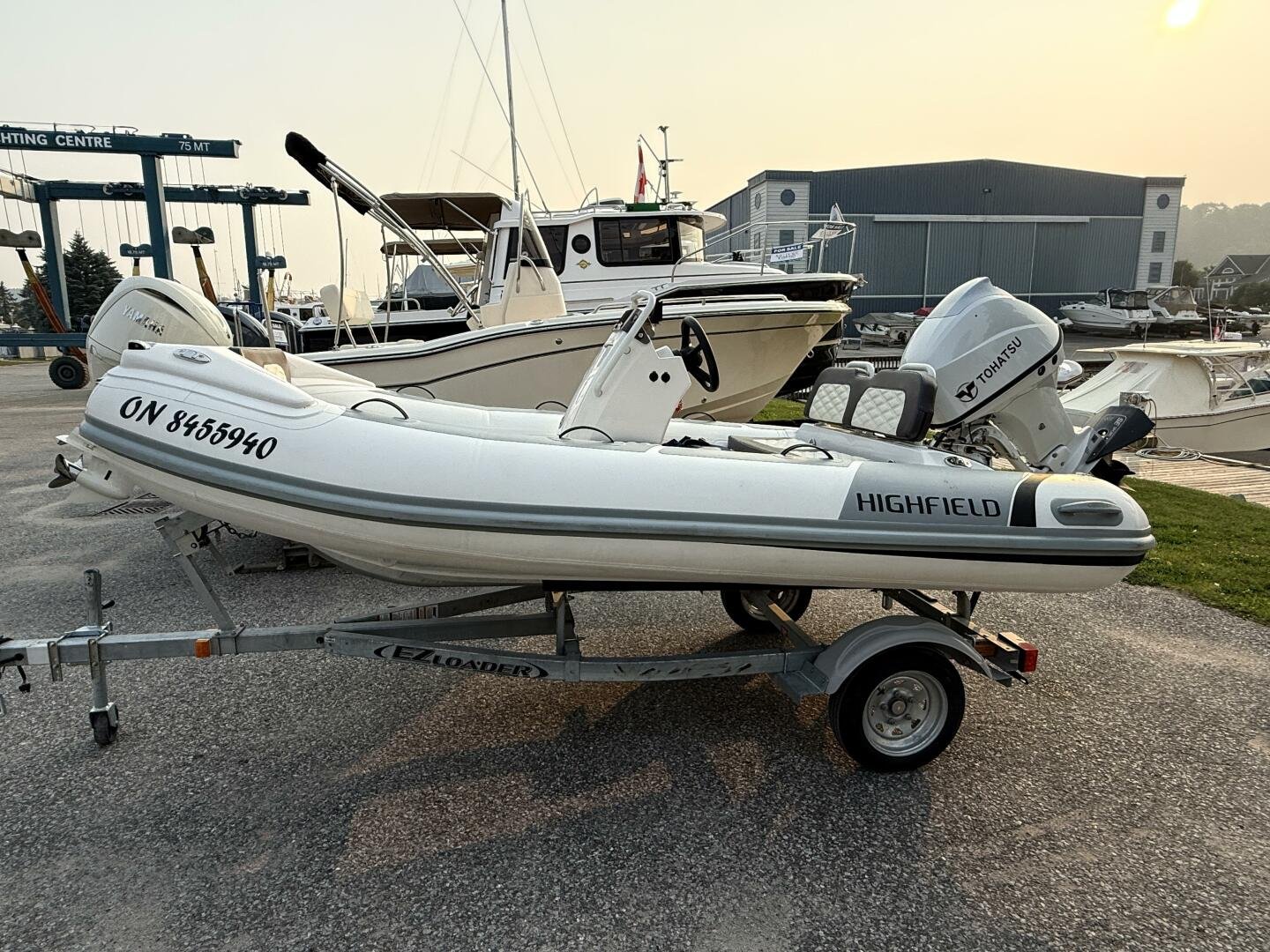 A clean tender on the trailer and ready for immediate delivery. Equipped with a 50hp Tohatsu, and an added Garmin Echomap Chartplotter.