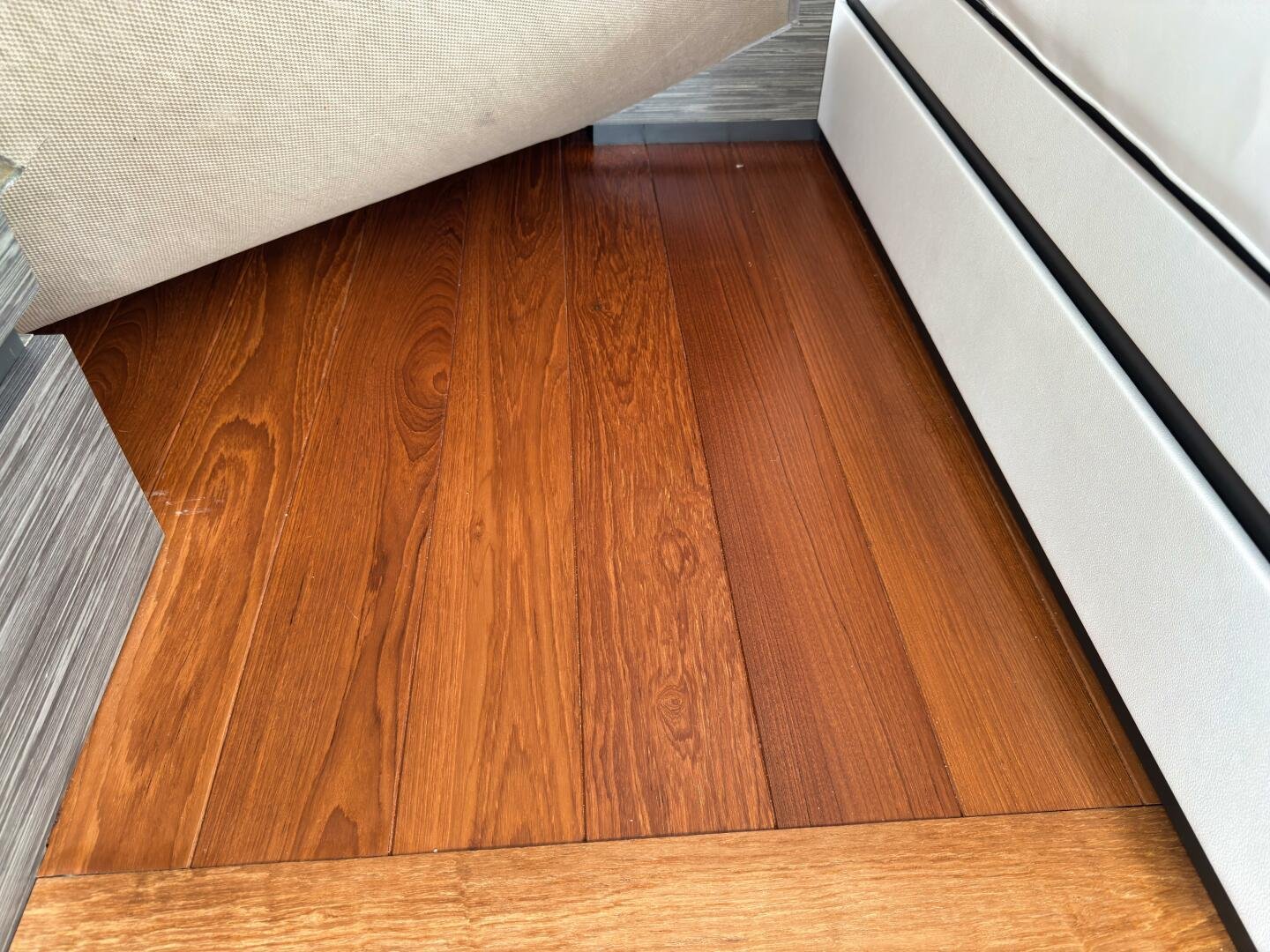 Salon: Port U-lounge and high gloss teak table on stainless steel pedestal with seating for up to six. Starboard side loveseat with main AC/DC panel hidden beneath. Solid wood flooring with Infinity floor runners and under padding. Opening port and starboard side windows and recessed LED lighting.